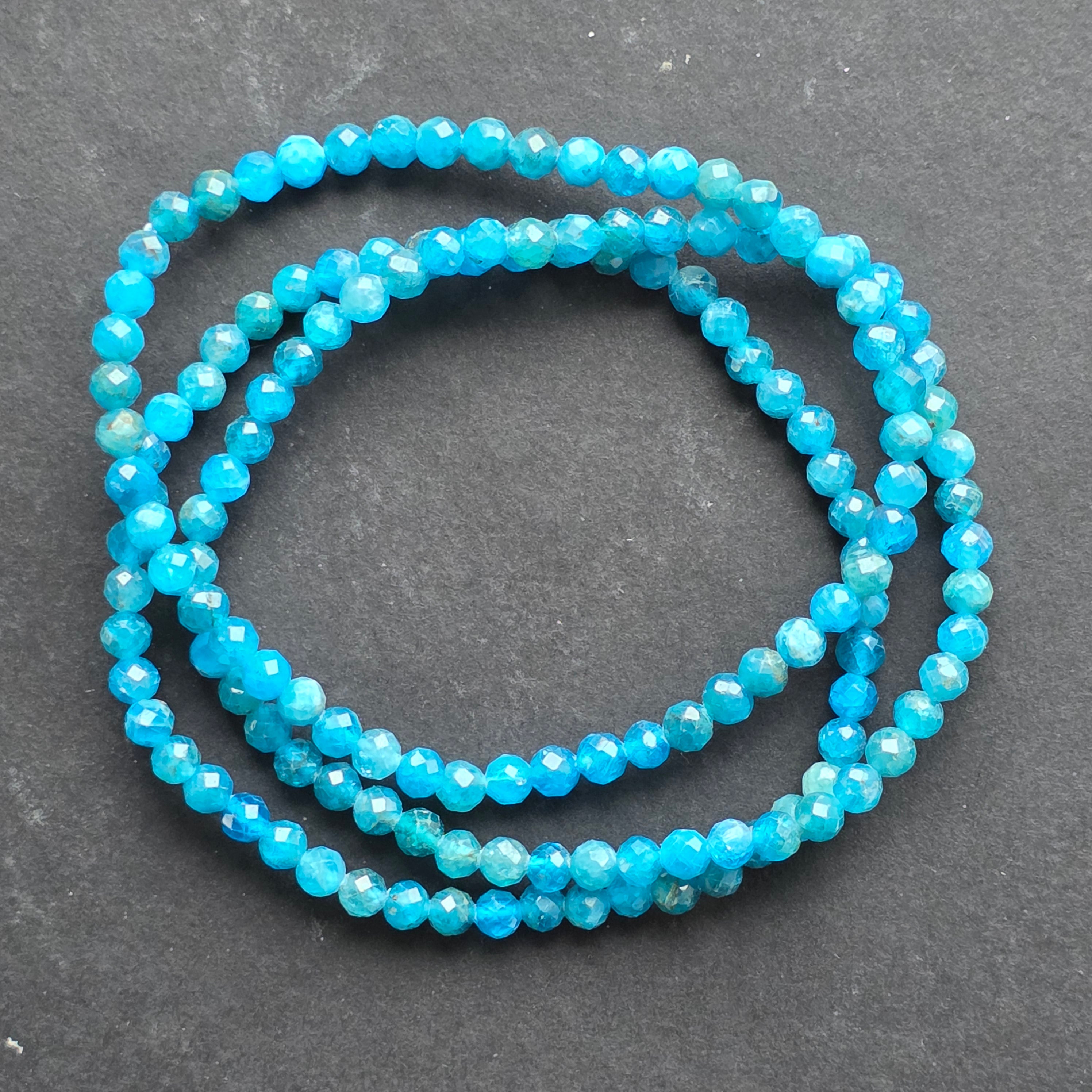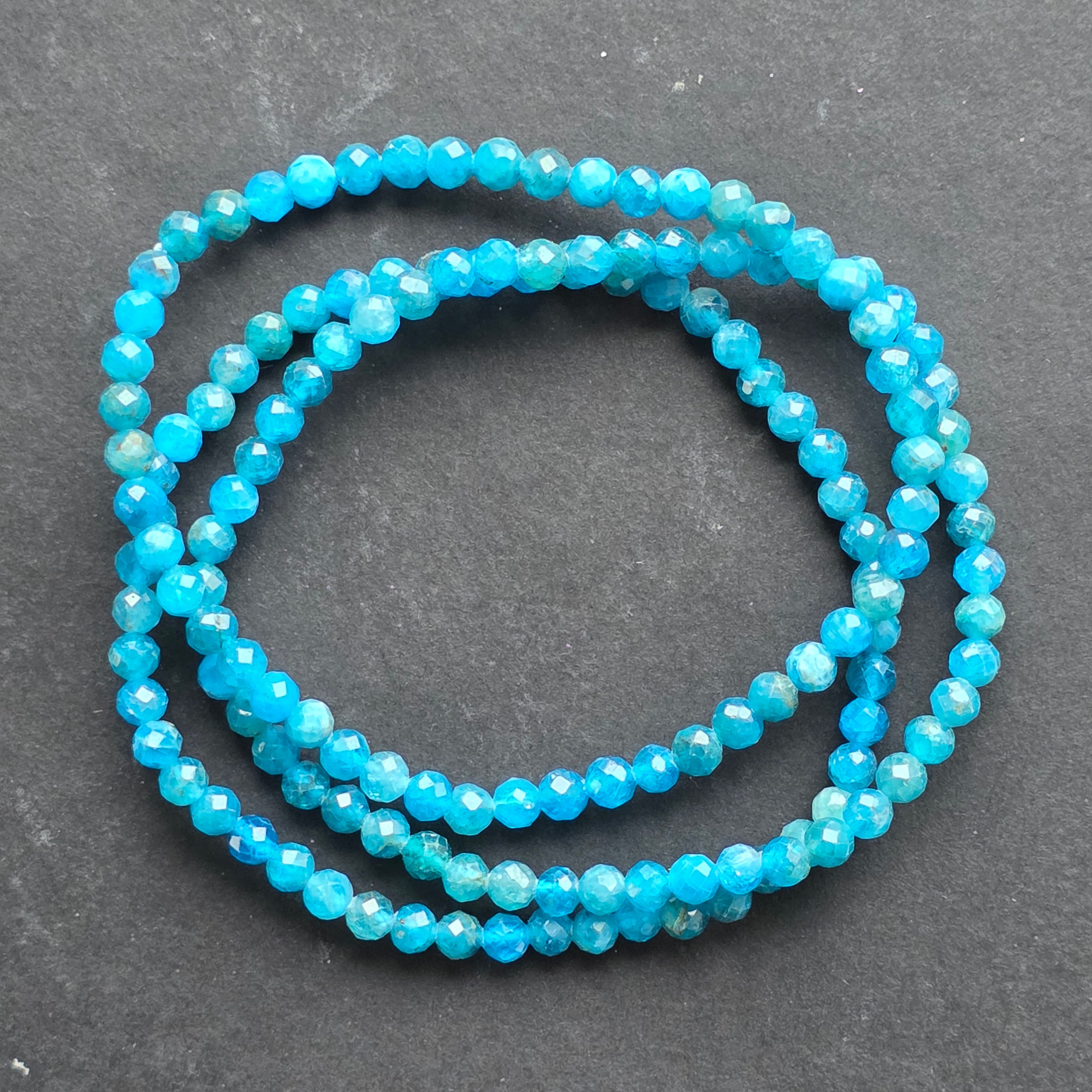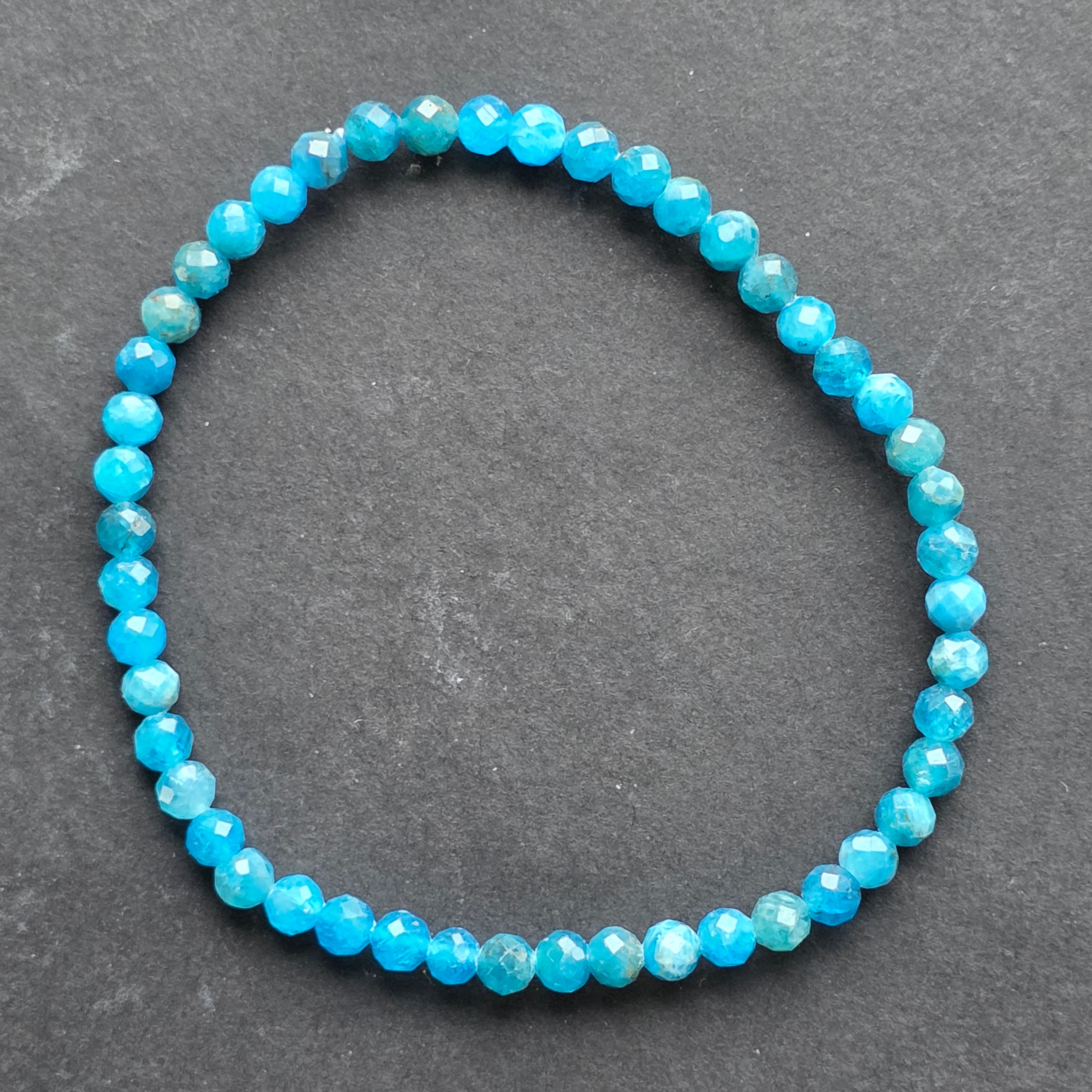 Гривна, която улавя дълбочината на океана и яснотата на спокойните мисли. Мъниста фасетирани естествени апатит, с диаметър 4 мм, отразява завладяващи нюанси на тюркоазено-синьо с прозрачни зелени акценти, които сякаш оживяват на светлина. Това е бижу, което съчетава енергията на креативността с душевен мир, приканвайки към самоанализ и автентично изразяване.