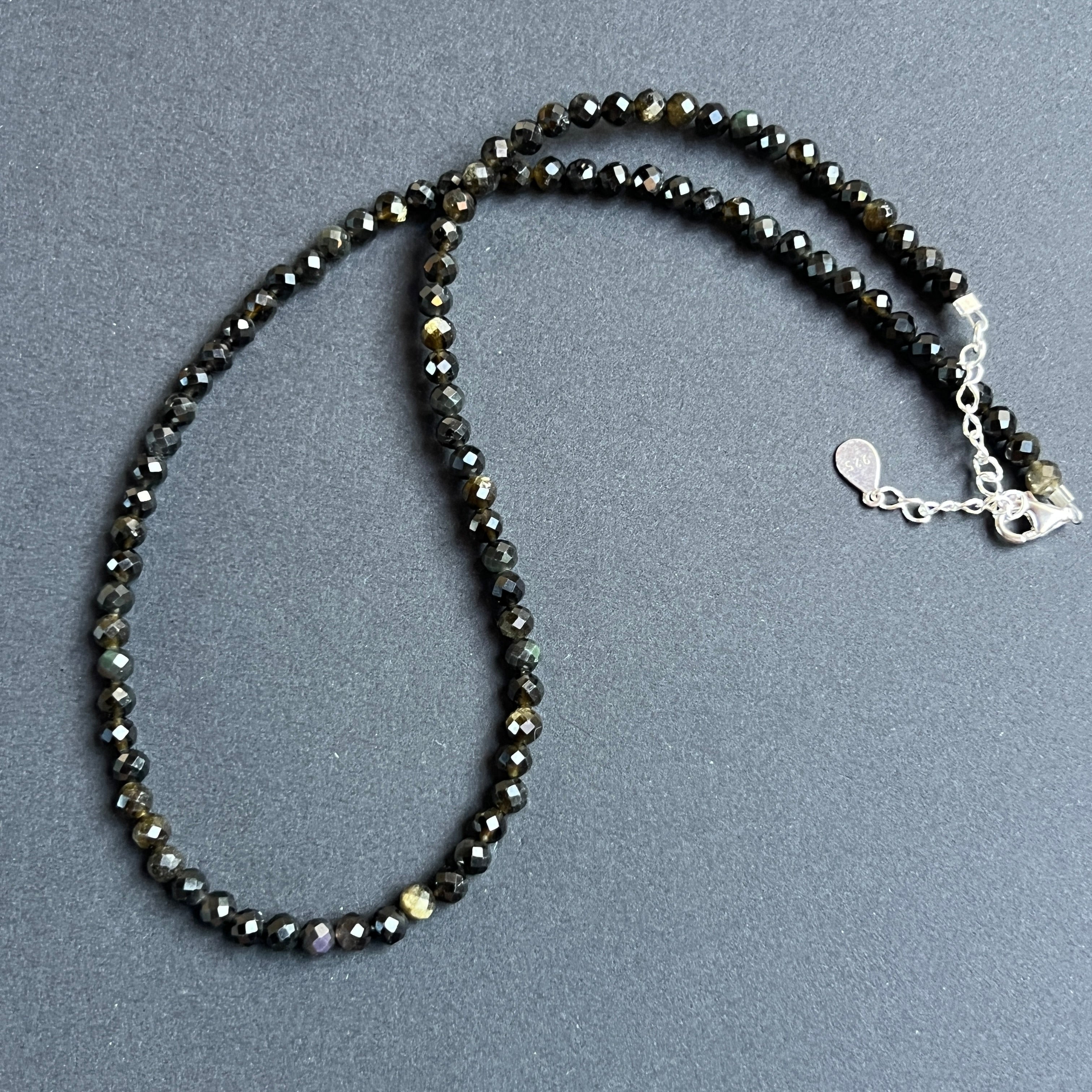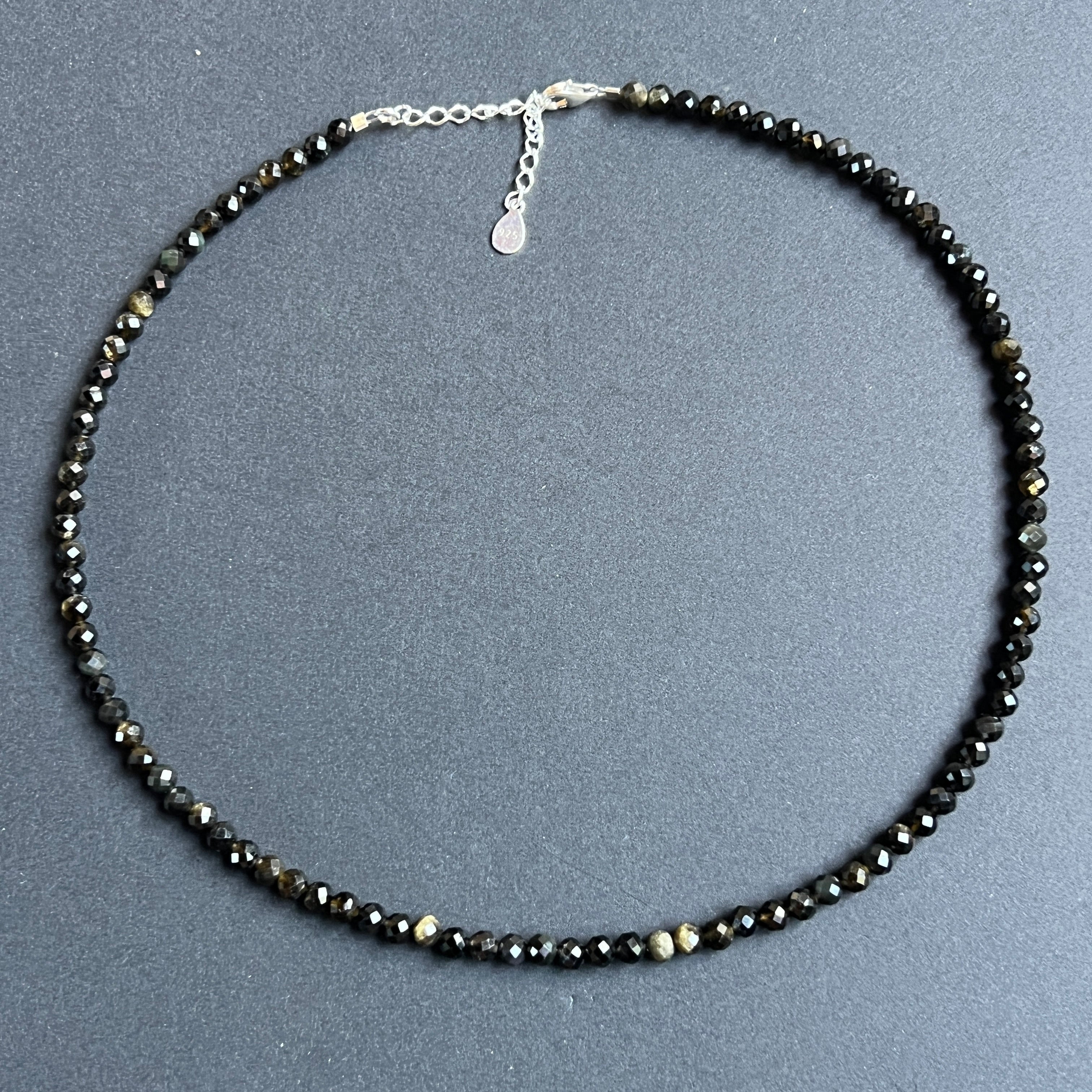 Връвта е изцяло съставена от фацетирани топчета от естествен златист обсидиан с диаметър 4 мм, тъмни камъни, почти черни, които под определен ъгъл отразяват топла, златиста светлина, като скрито проблясване в тъмнината. Фините фасети приискрят светлина в деликатни отблясъци, а играта на сенки и блясъци създава хипнотичен и мистериозен ефект.