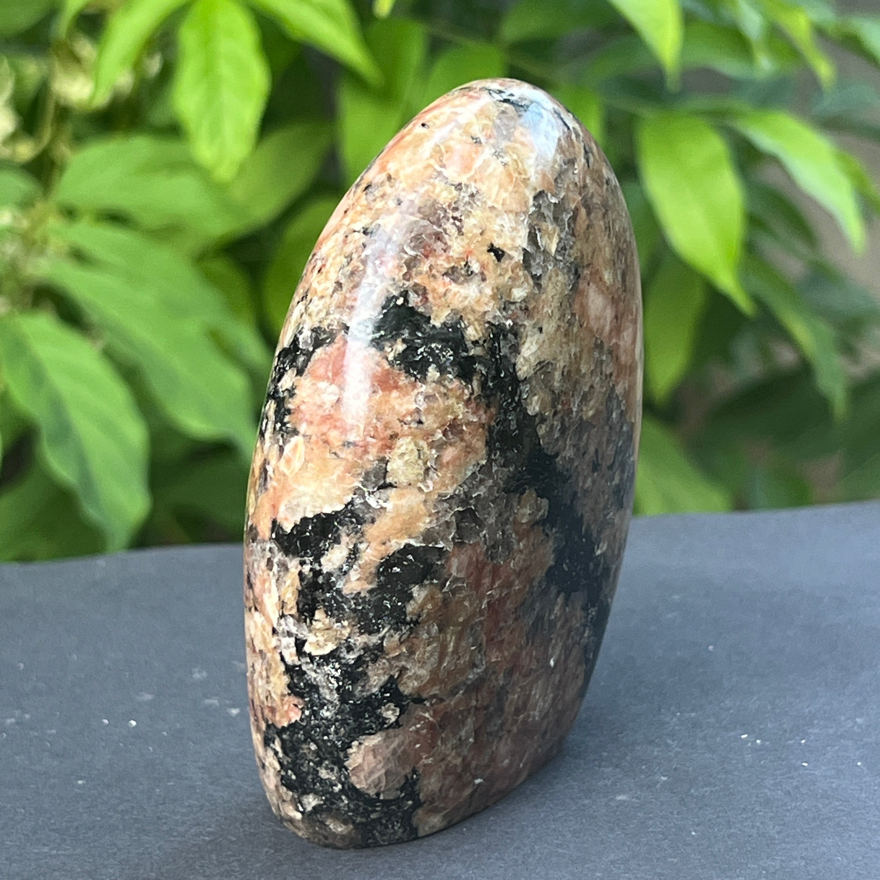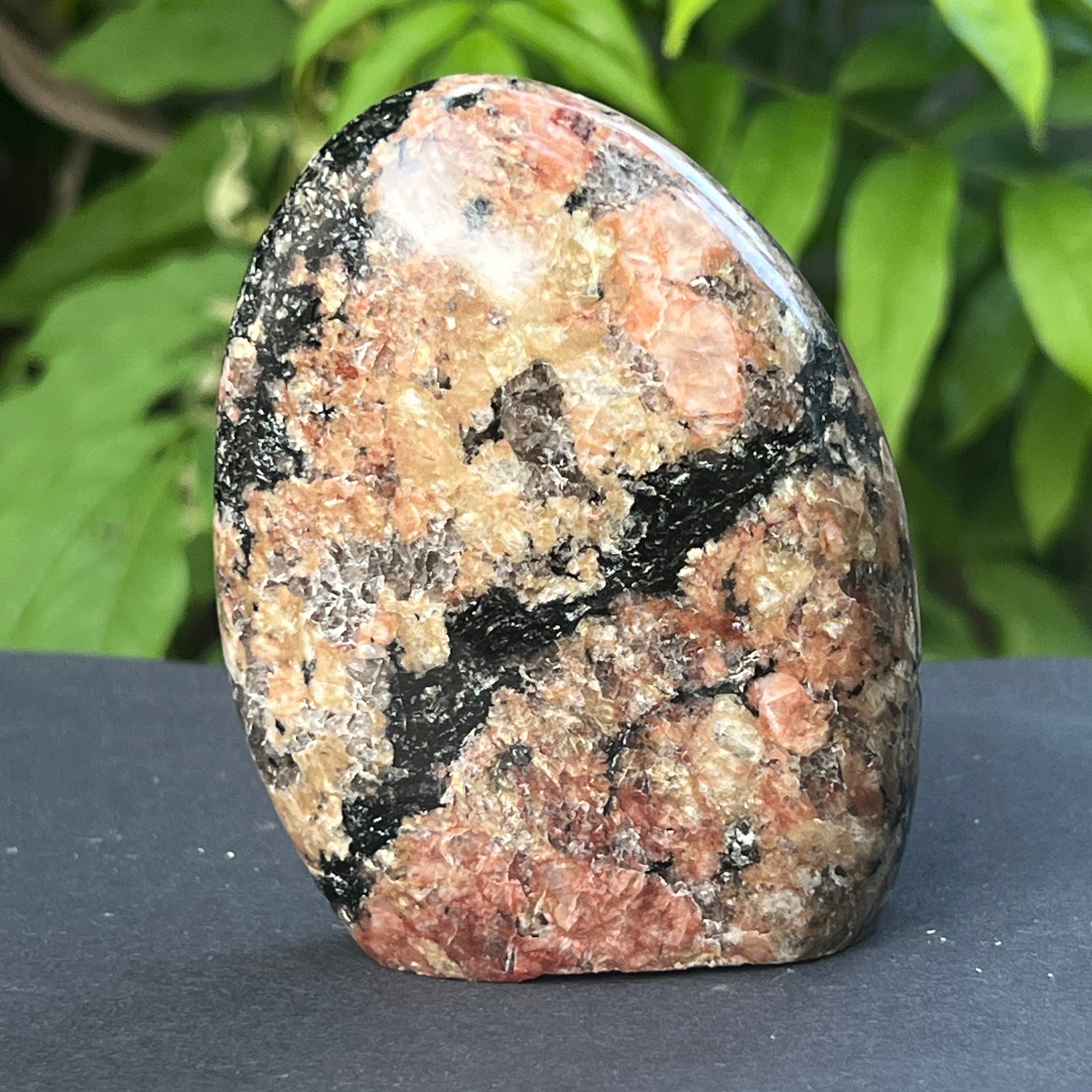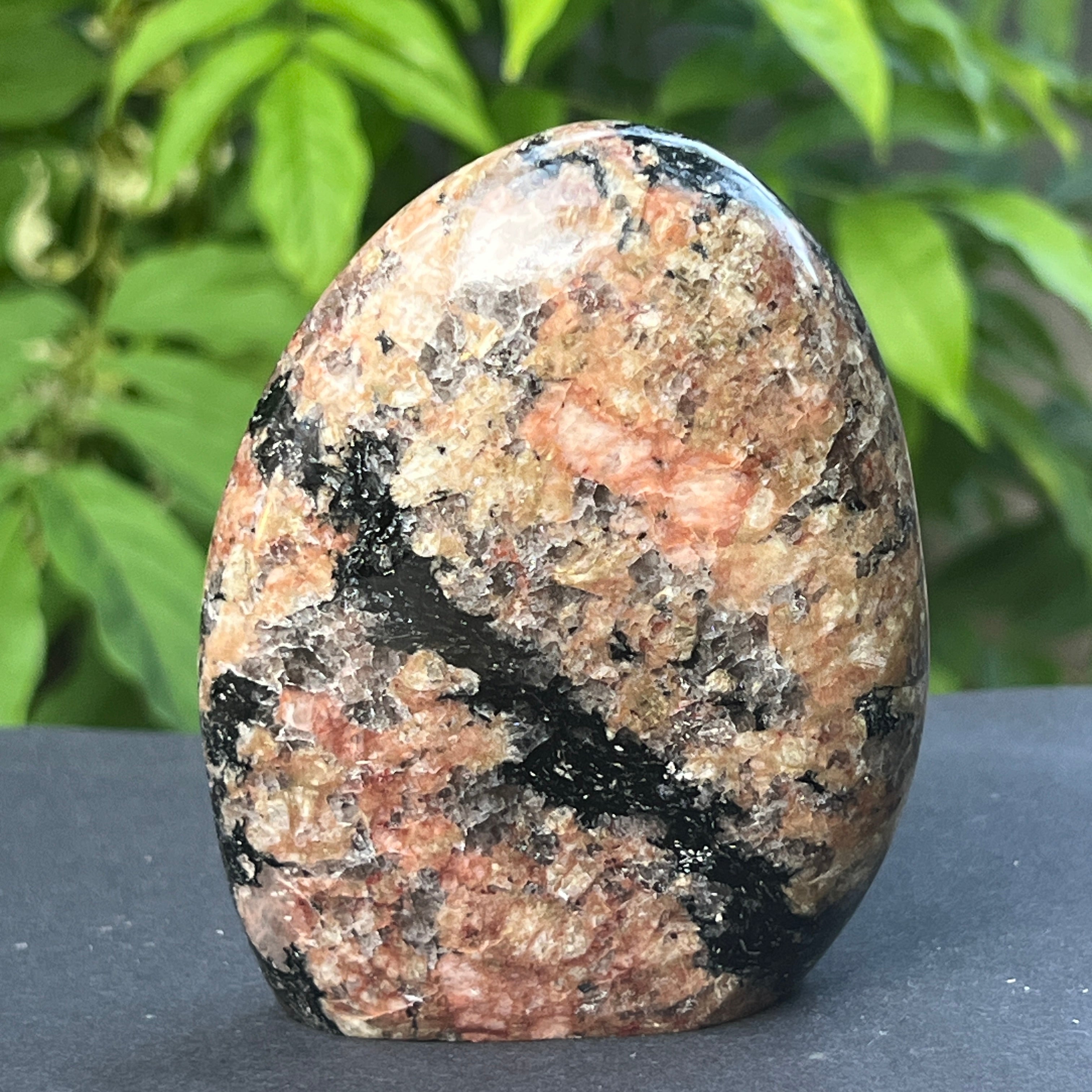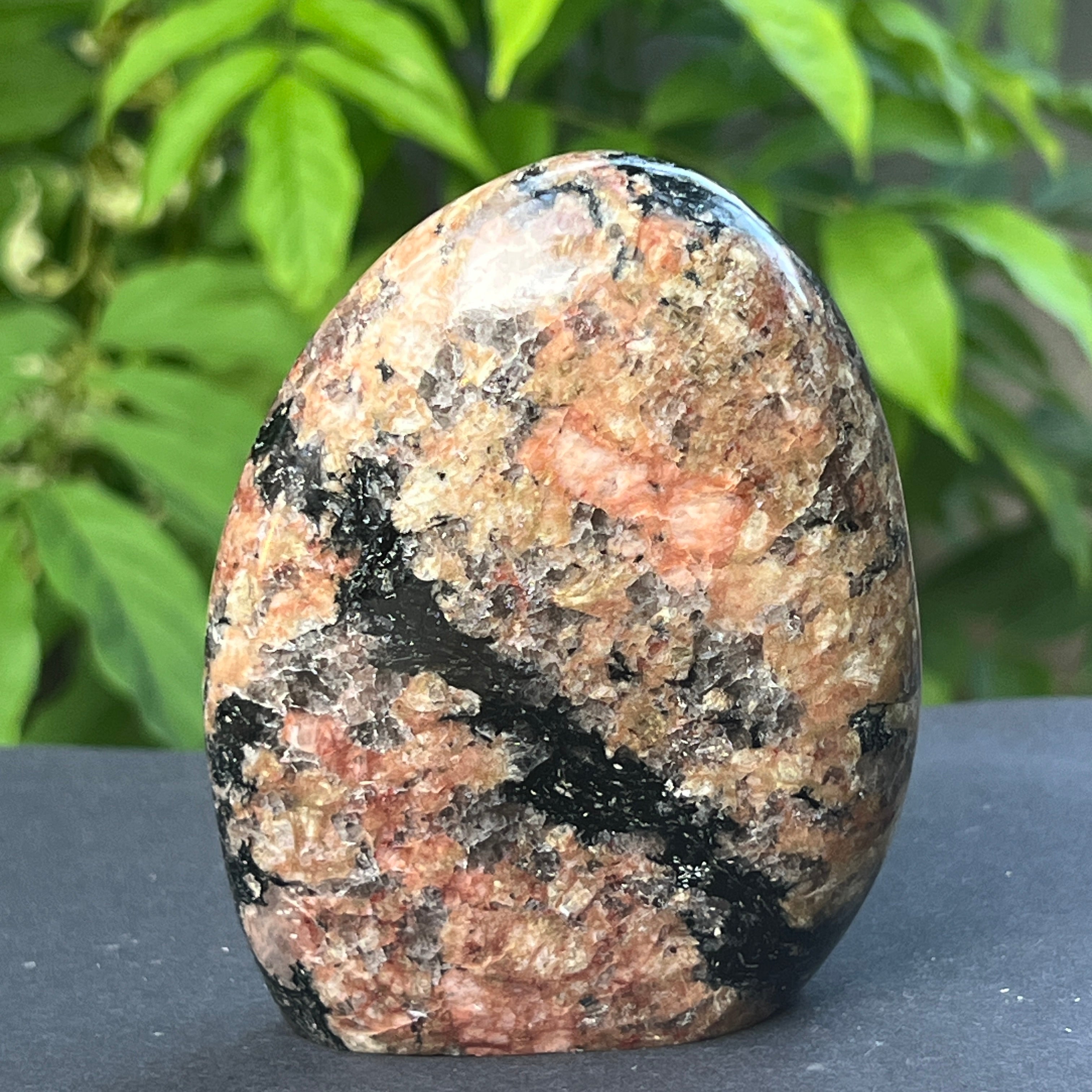 Този забележителен естествен камък съчетава силата и прозрачността на полевия шпат с ярката и интензивно оцветена енергия на турмалина. Фелдшпатът, с топлите си нюанси, често бежови, бели или розово-прасковени, осигурява спокоен, копринен и стабилен фон. За разлика от това, турмалинът се проявява под формата на черни или многоцветни кристали, покрити масово – понякога деликатни, понякога перфектно очертани, като знаци, оставени от вътрешния огън на Земята.