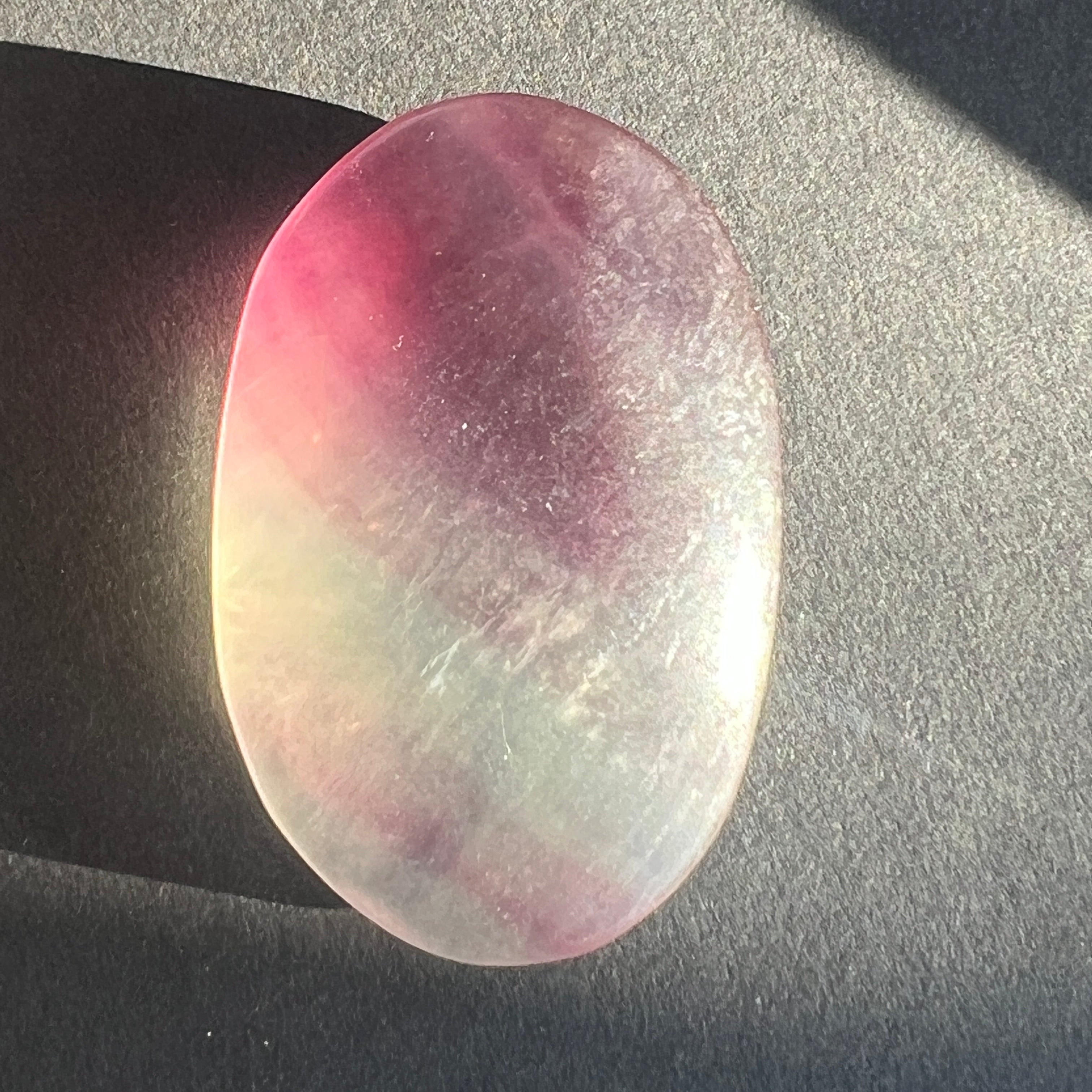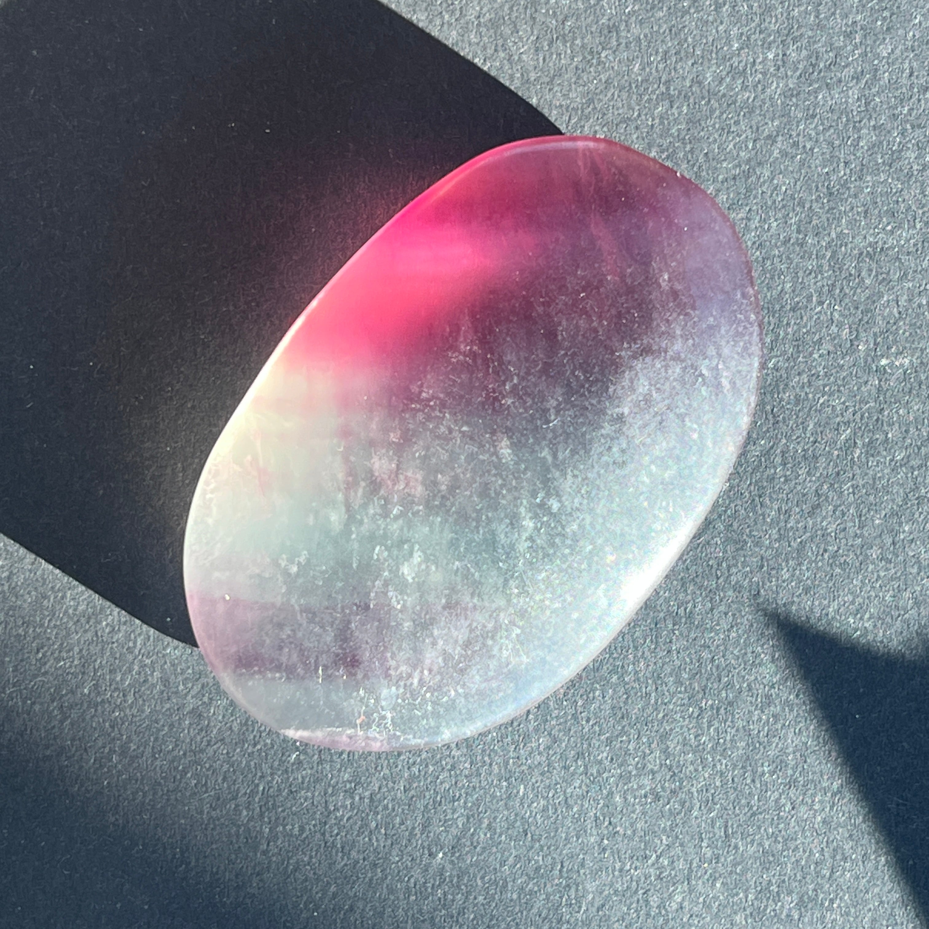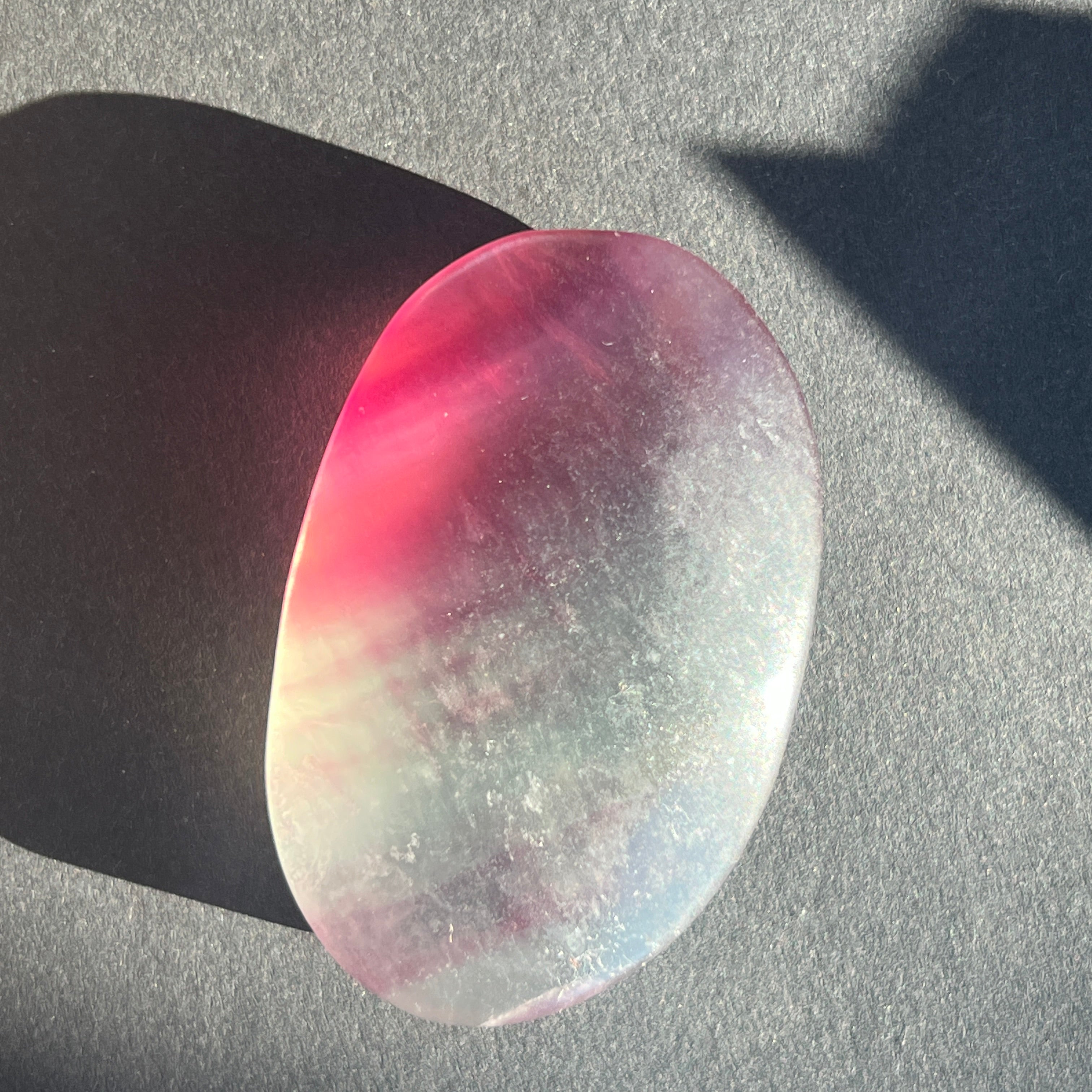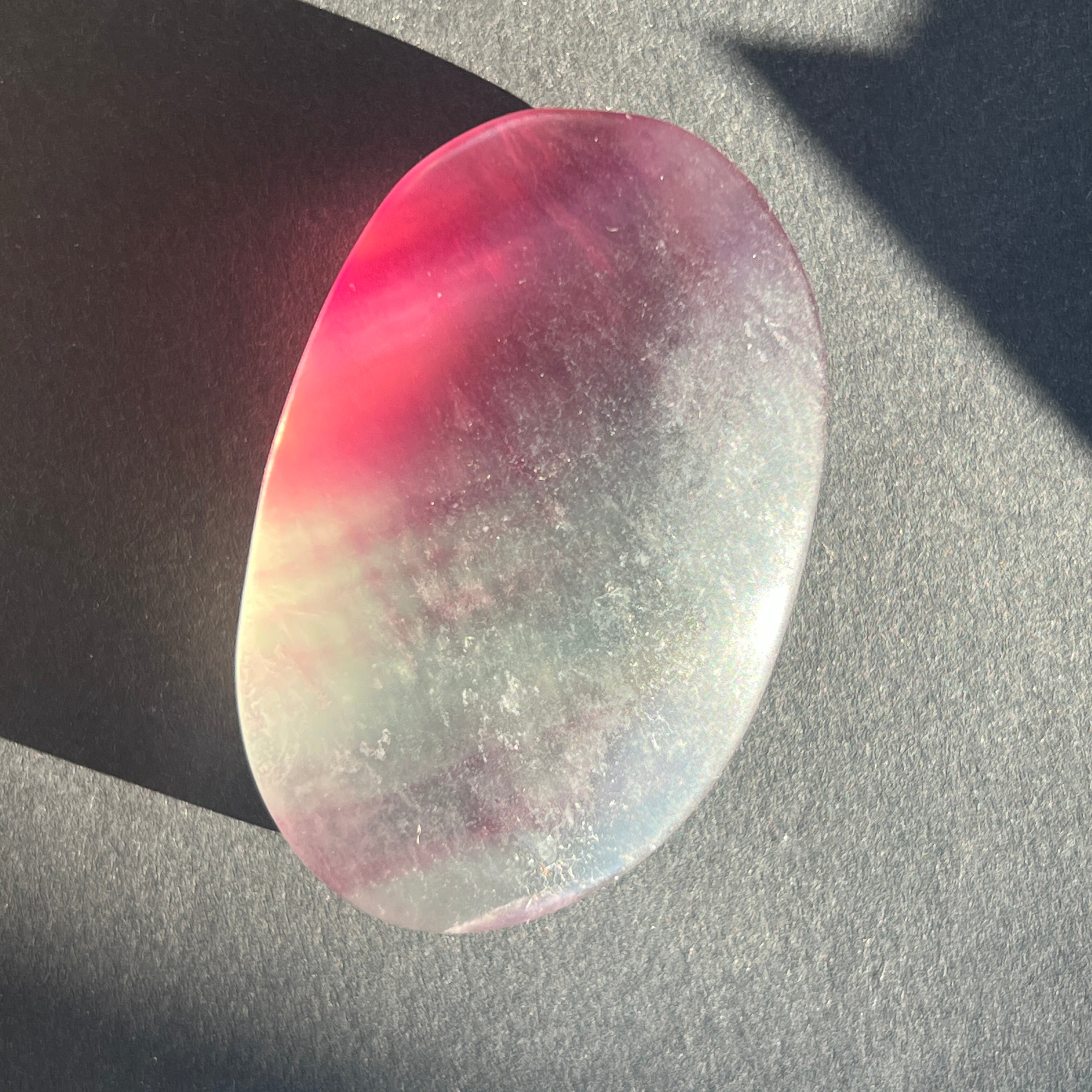 Дъговият флуорит помага за балансиране и хармонизиране на околната енергия и често се използва, за да видим ситуации от различни ъгли и да разширим нашите перспективи.