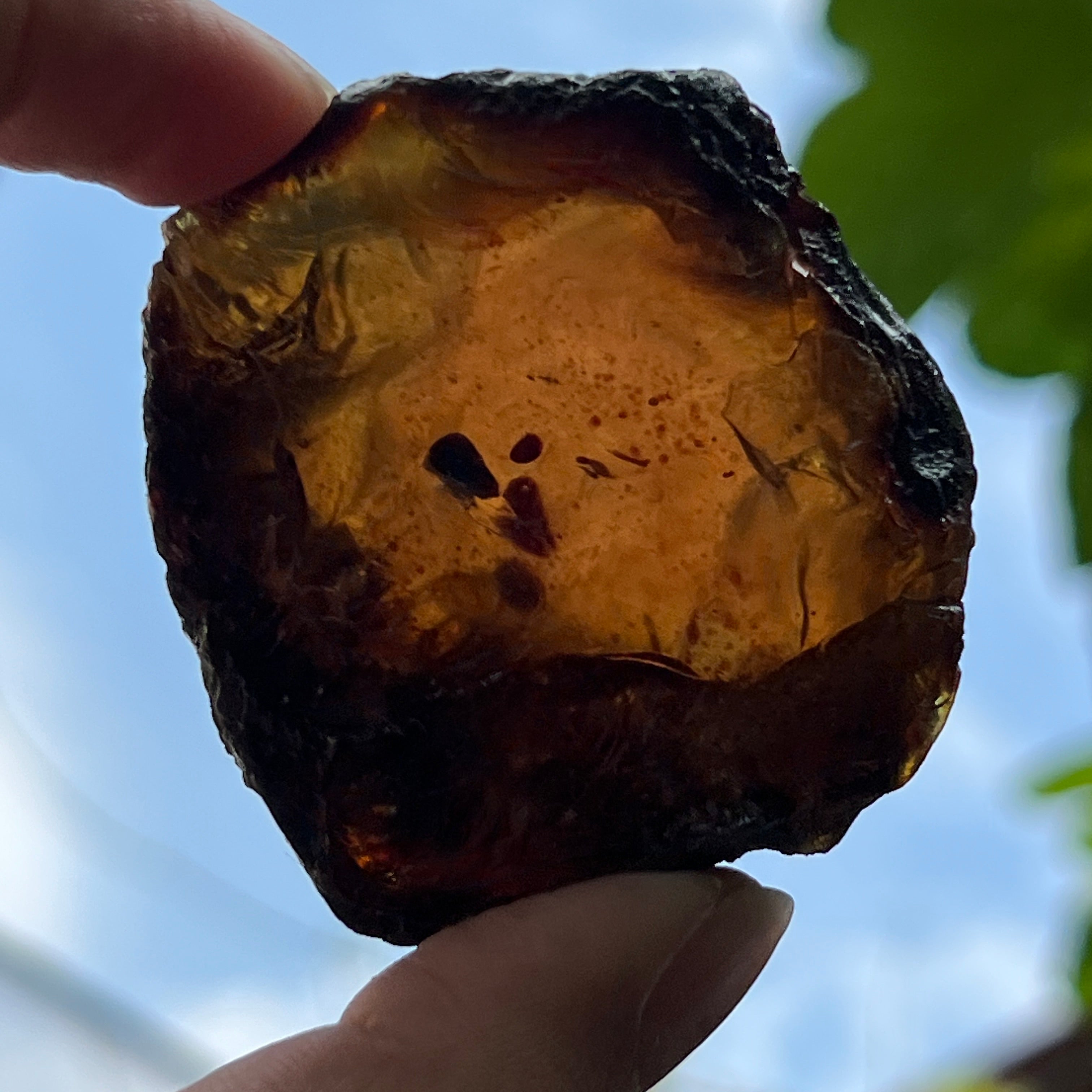 Естествен екземпляр от суров фосилен кехлибар, произхождащ от региона Суматра, Индонезия – един от малкото активни източници на кехлибар в Югоизточна Азия. Тази тропическа зона е известна със своите почви, богати на органични седименти, и интензивна геоложка активност, условия, идеални за образуването на кехлибар.