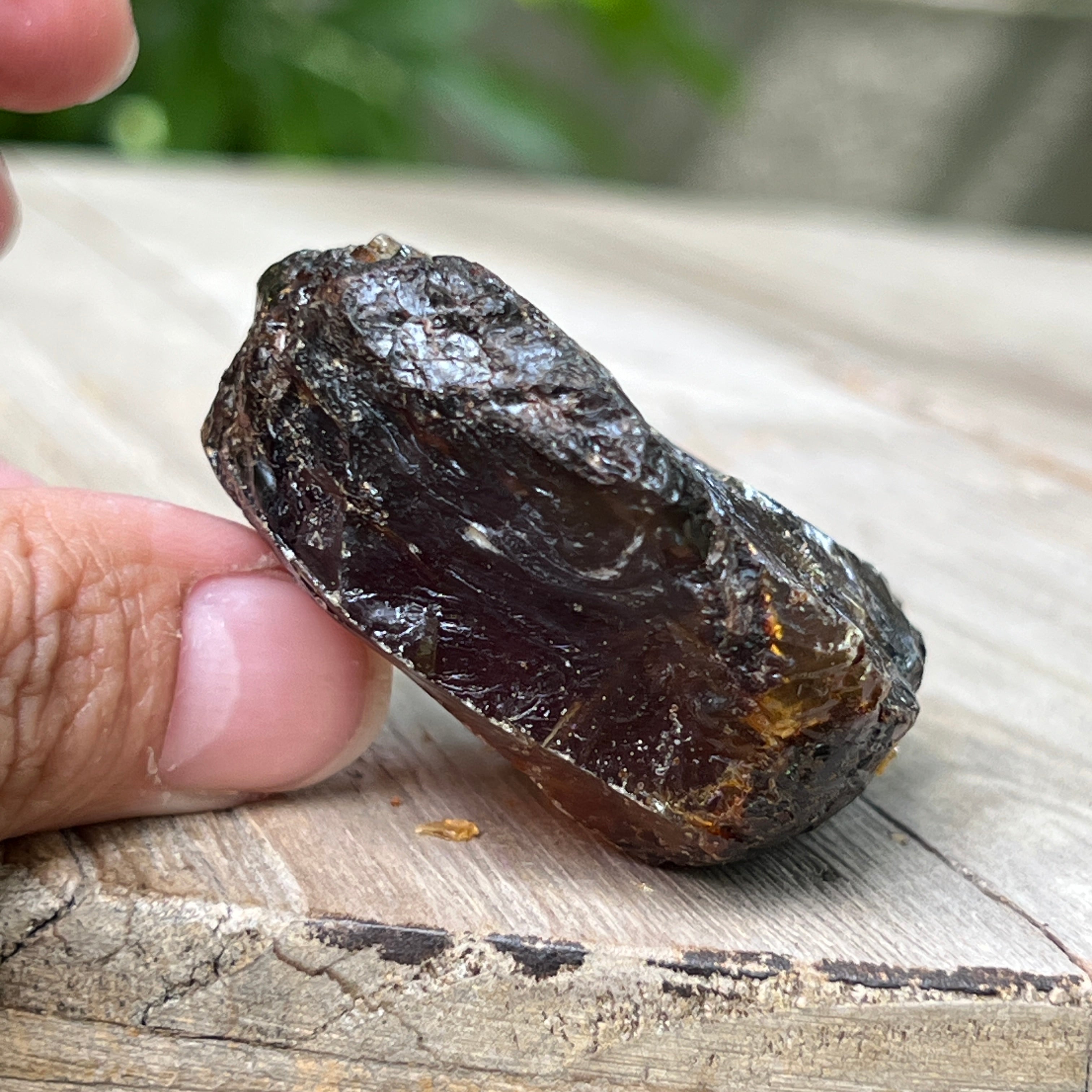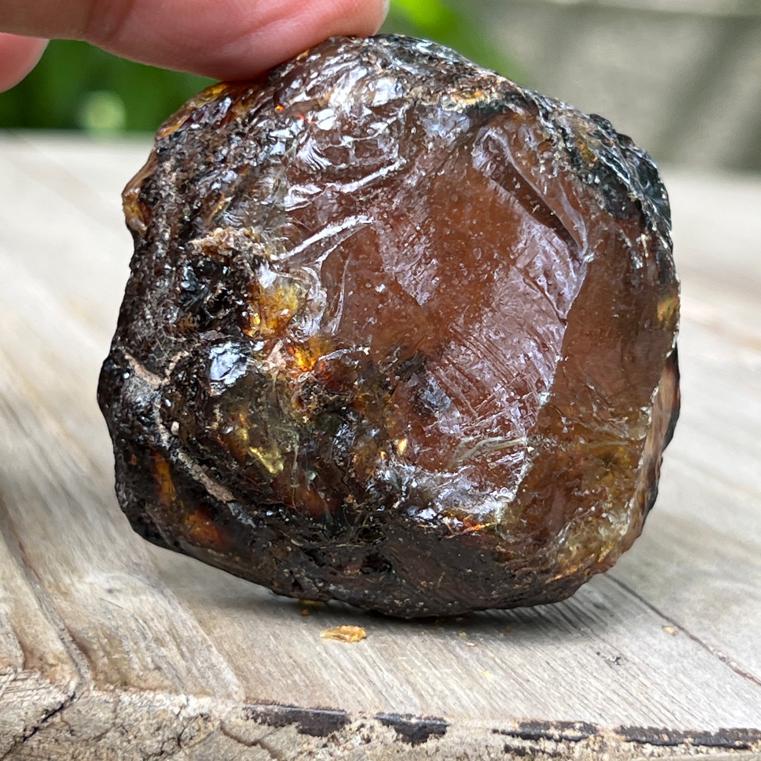 Представеният екземпляр е суров, необработен, с неравна повърхност и естествена форма. Цветът варира от топло жълто до тъмнокафяво, а текстурата е матирана с леки полупрозрачни зони. Идеален е за колекционери, почитатели на геологията или за образователна експозиция.