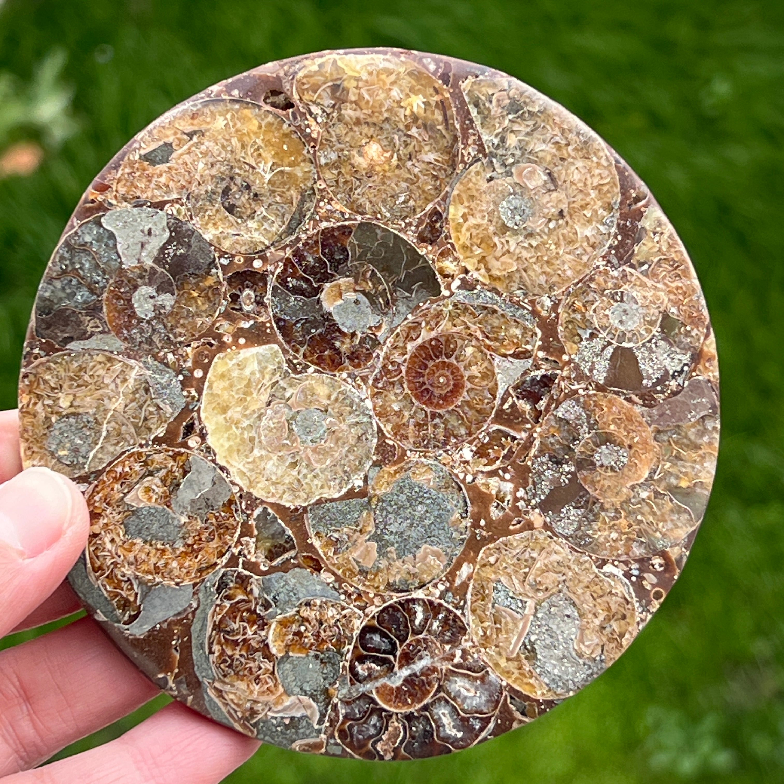 Фосилните кристали от амонит са изработени от автентични амонитни фосили. Тези фосили могат да имат различни размери и орнаменти, в зависимост от вида и геологичния период, в който са живели.