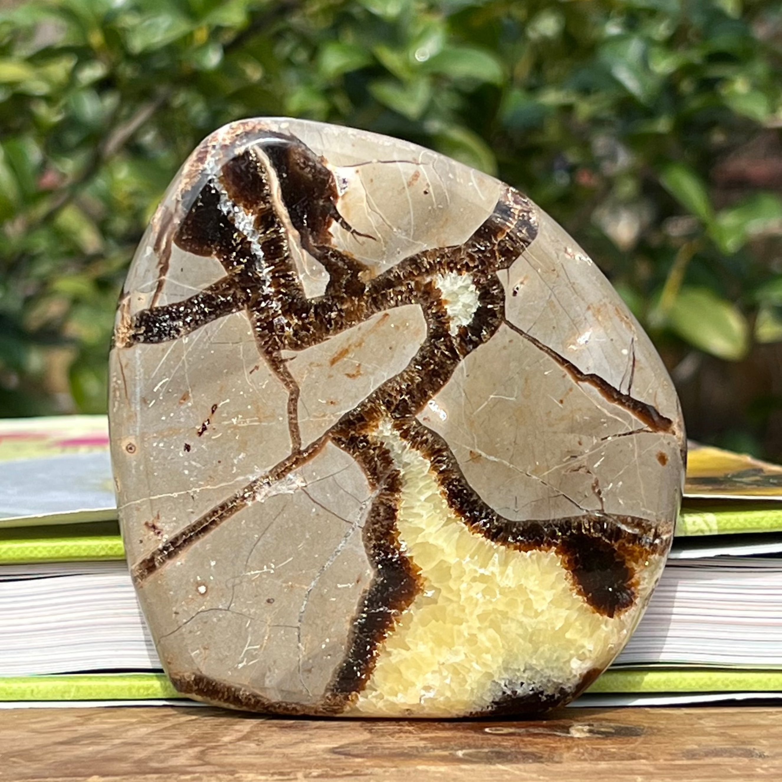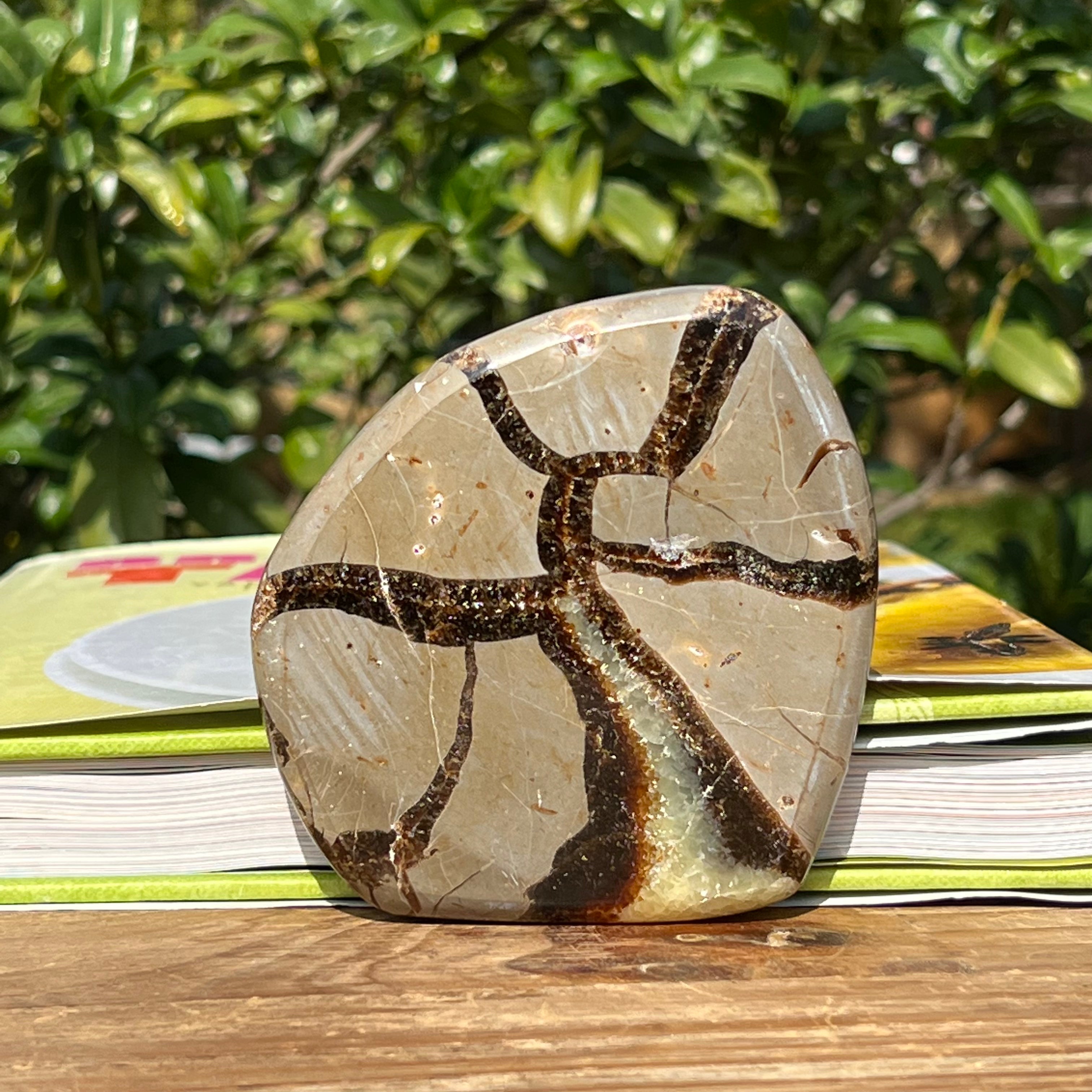 Септарията се състои от калцит, лимонит, гипс и барит, минерали, които създават уникална игра в този камък и му придават специфичен външен вид.