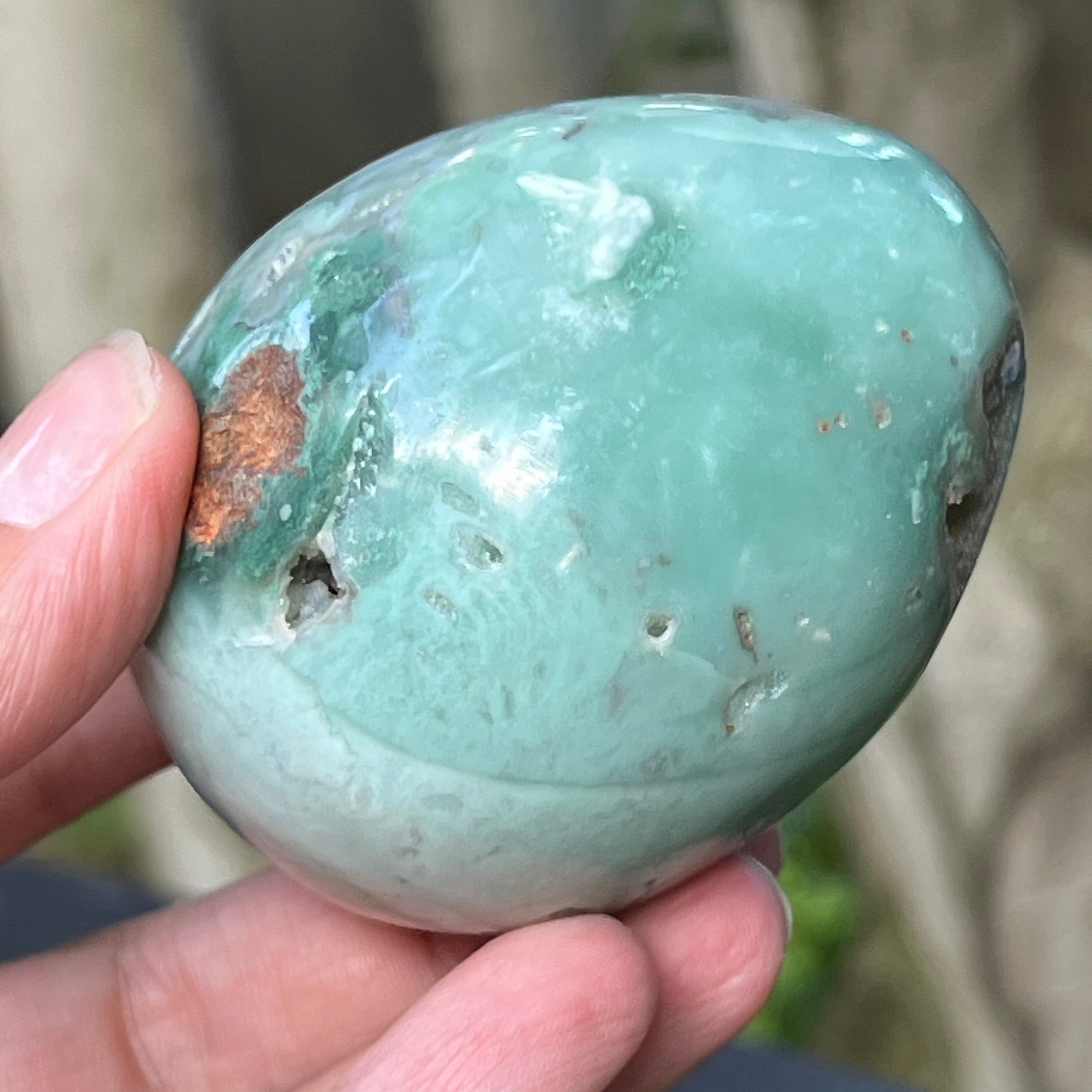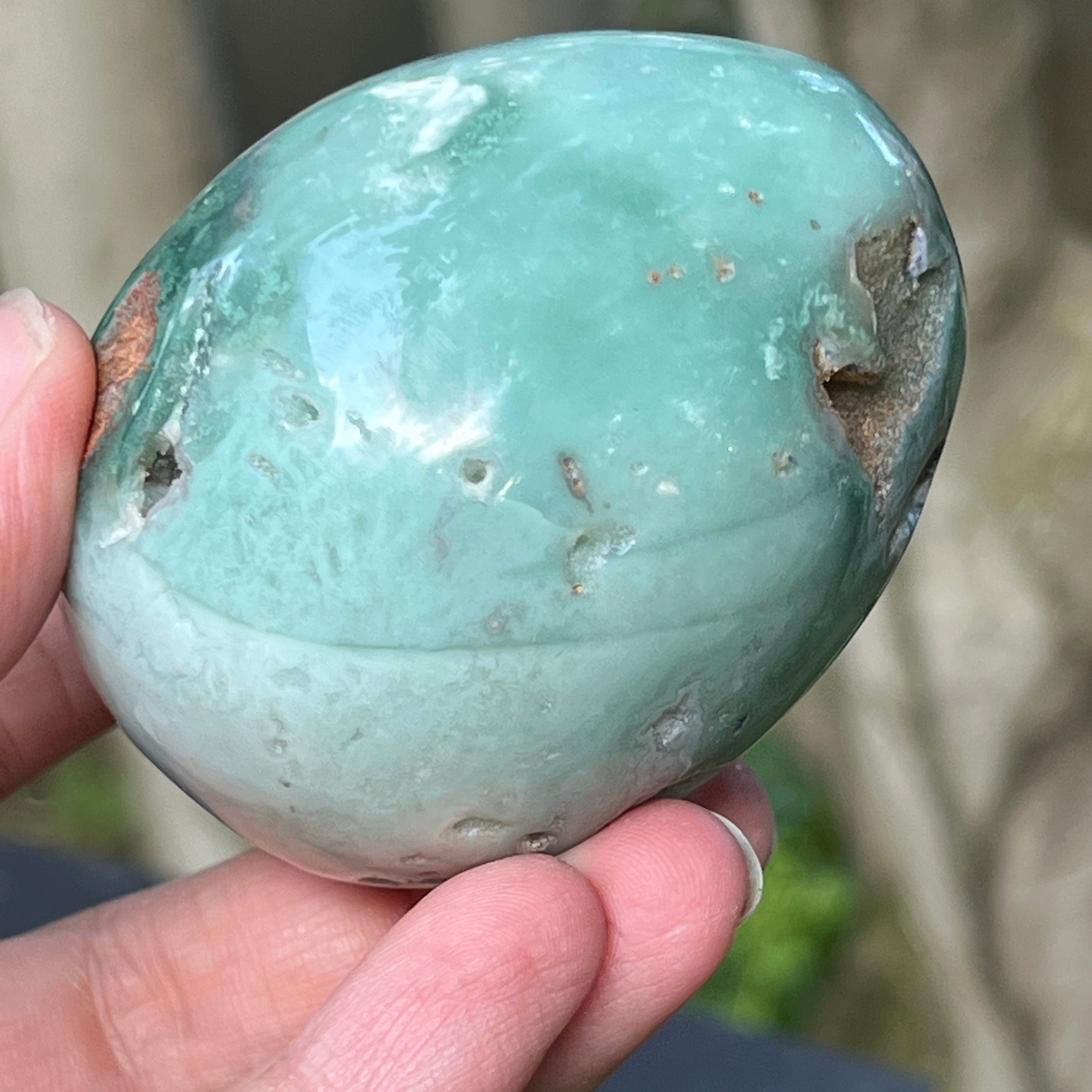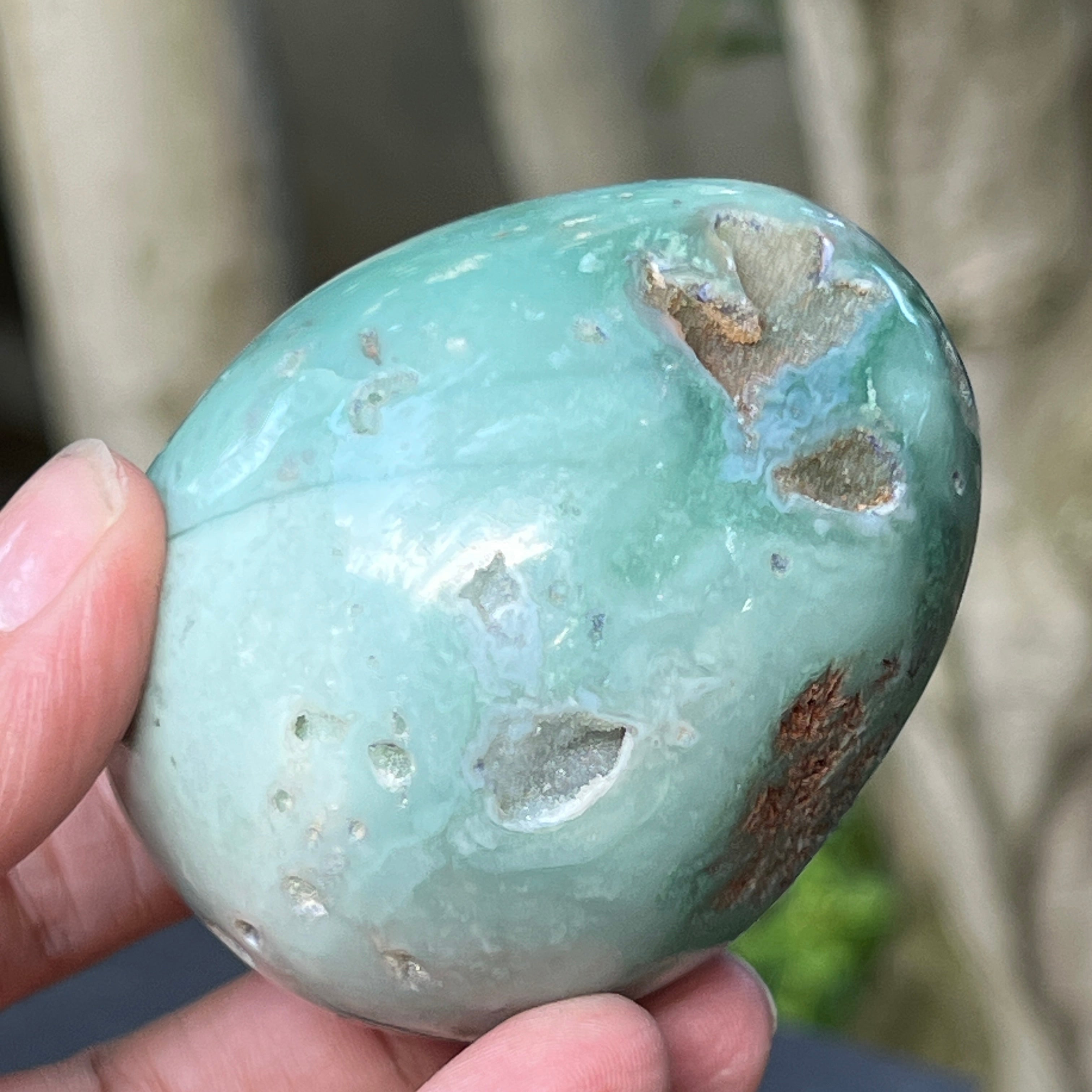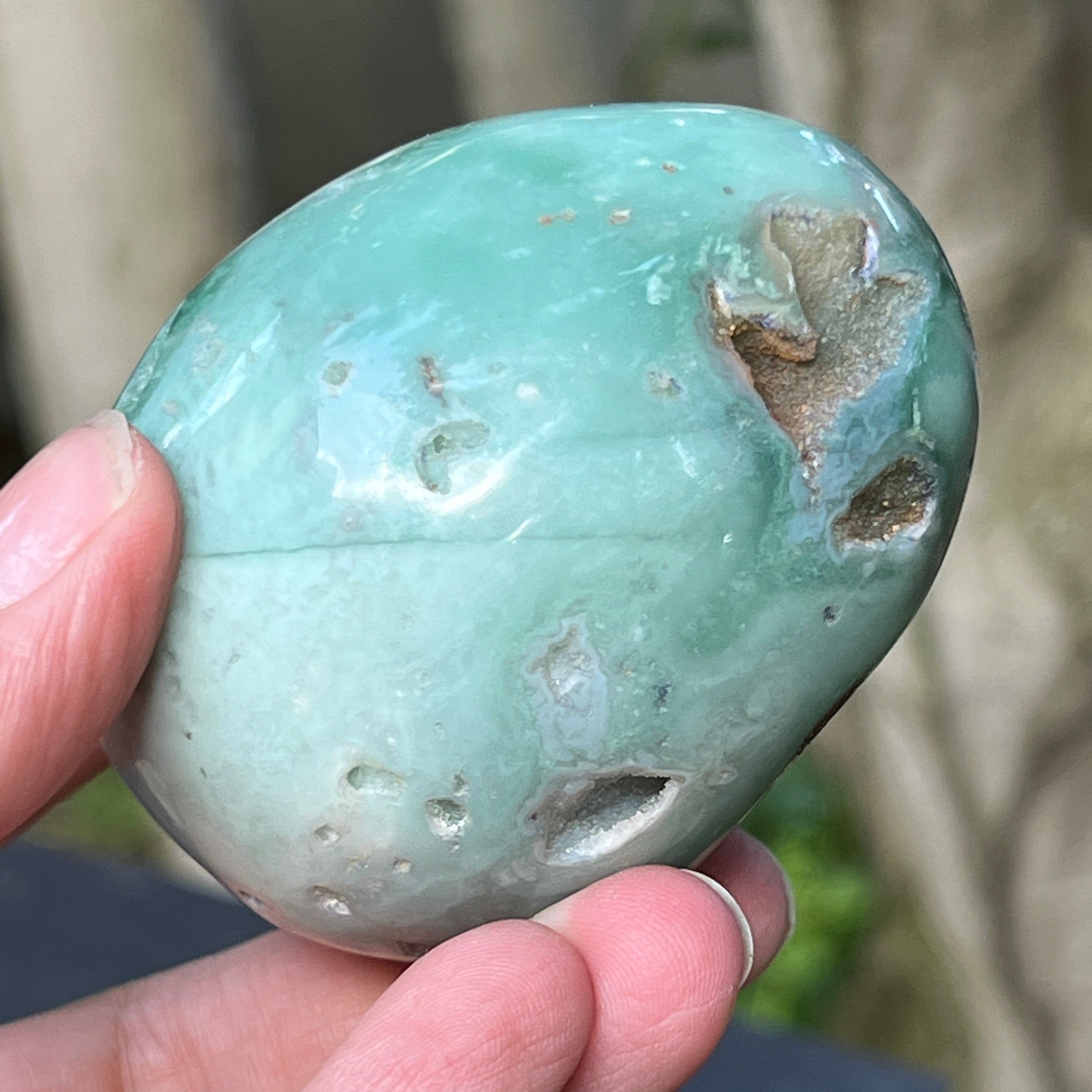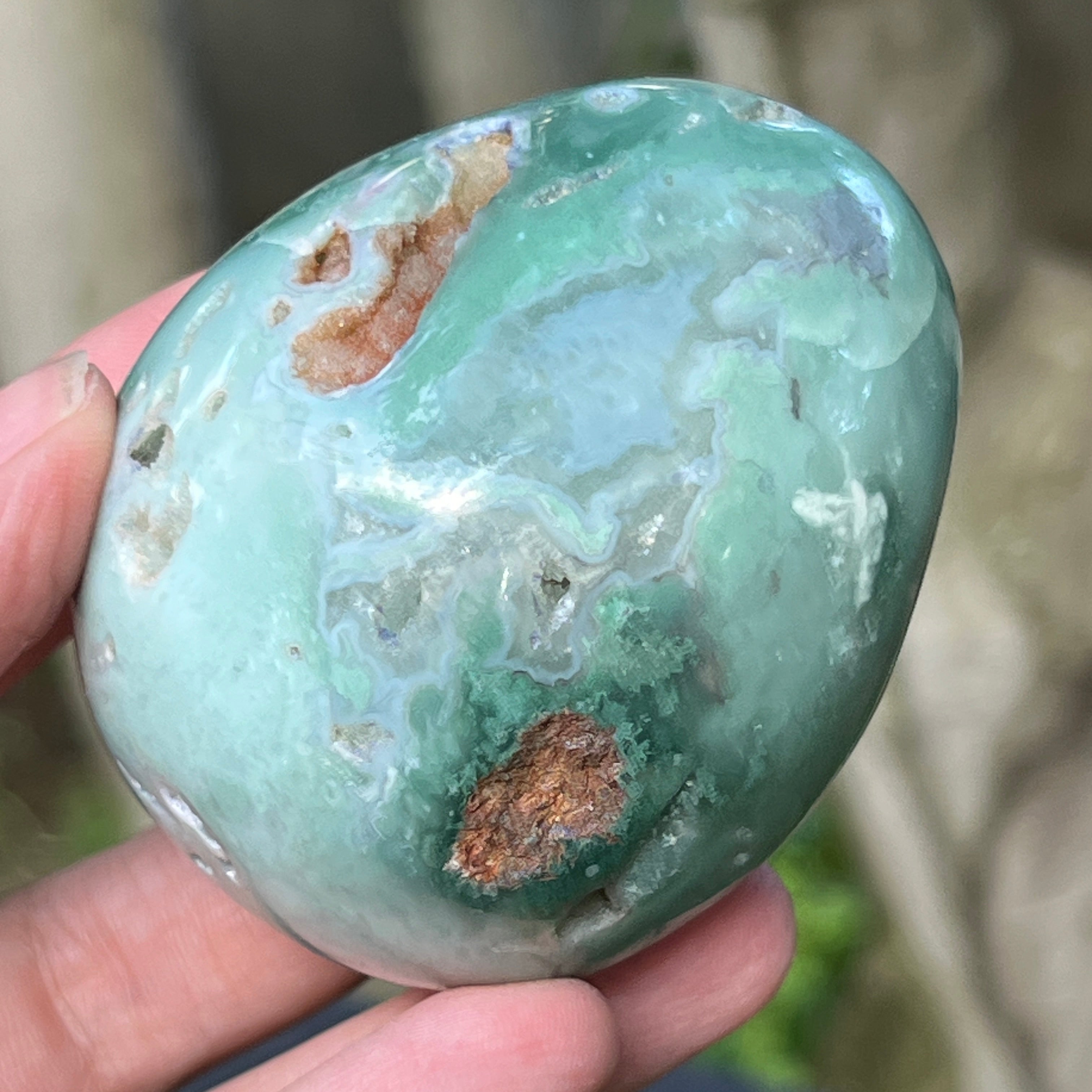 Това е естествена, неизменена форма на хромов халцедон – минерал, който е труден за намиране, добиван изключително в Зимбабве и ценен заради живия си цвят, който не произлиза от никел (както при хризопраз), а от хрома, който пулсира дълбоко в кристалната му структура. В тази специална разновидност, включванията на синьо и зелено създават завладяваща цветна игра с плавни преходи между полупрозрачно и непрозрачно, между плътно и ефирно.