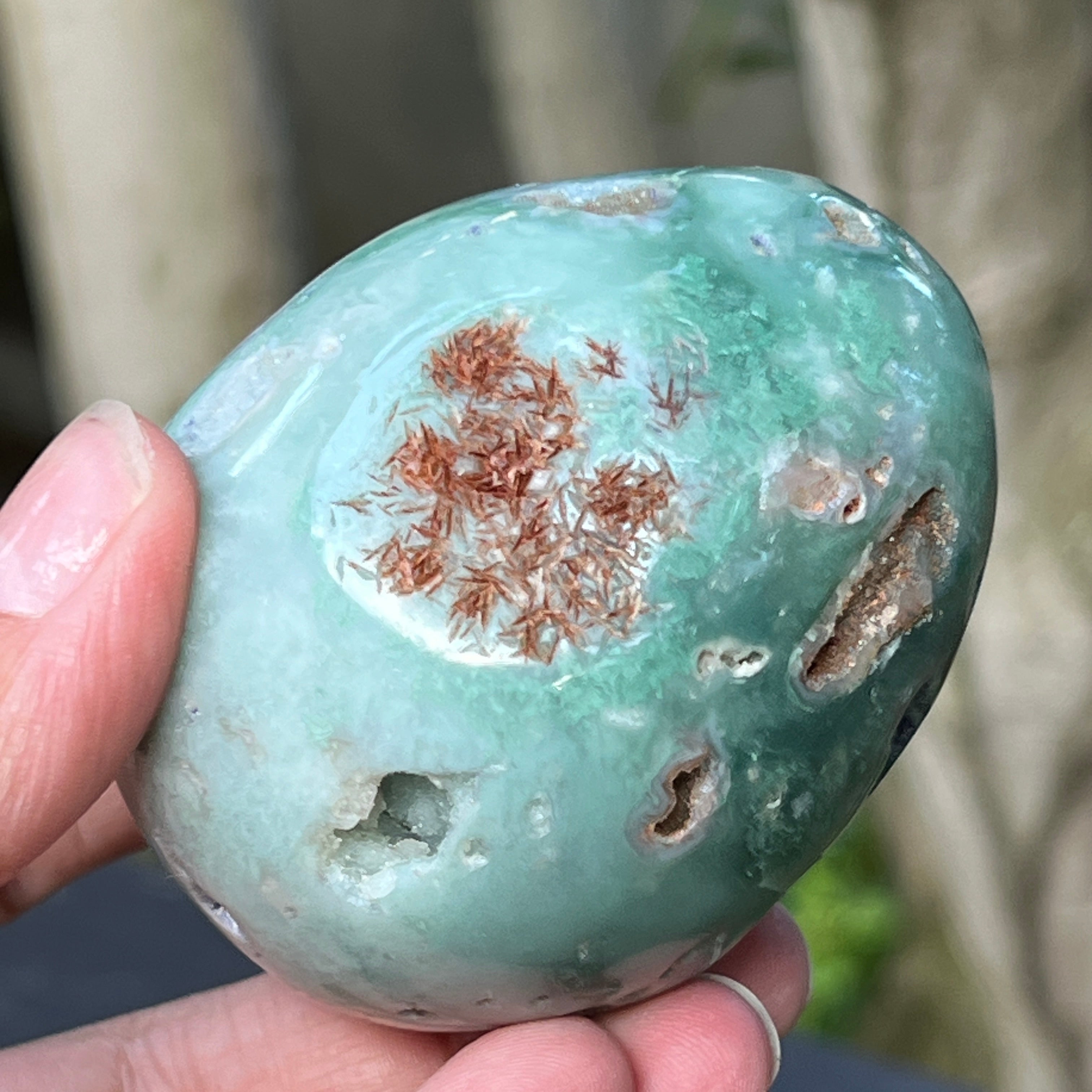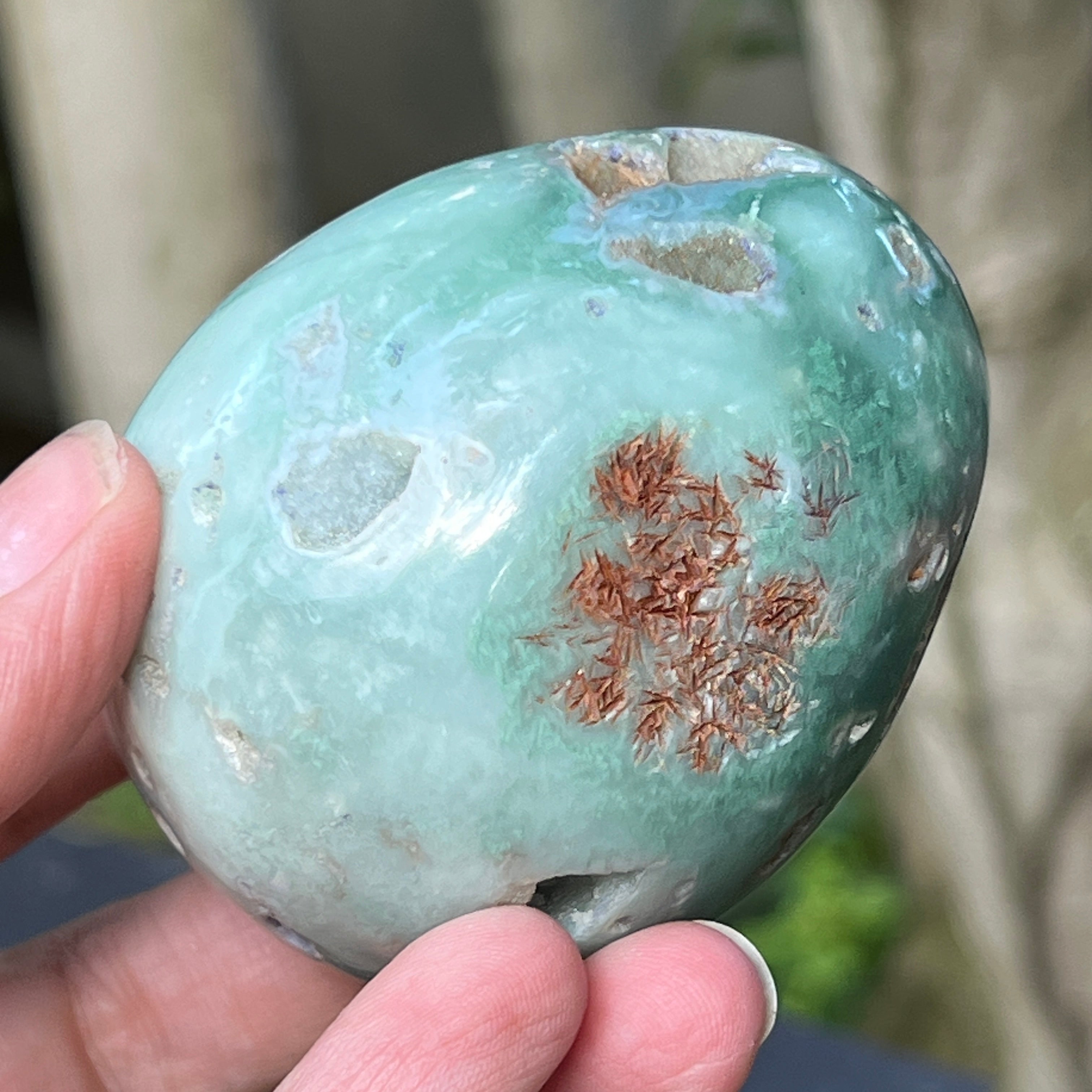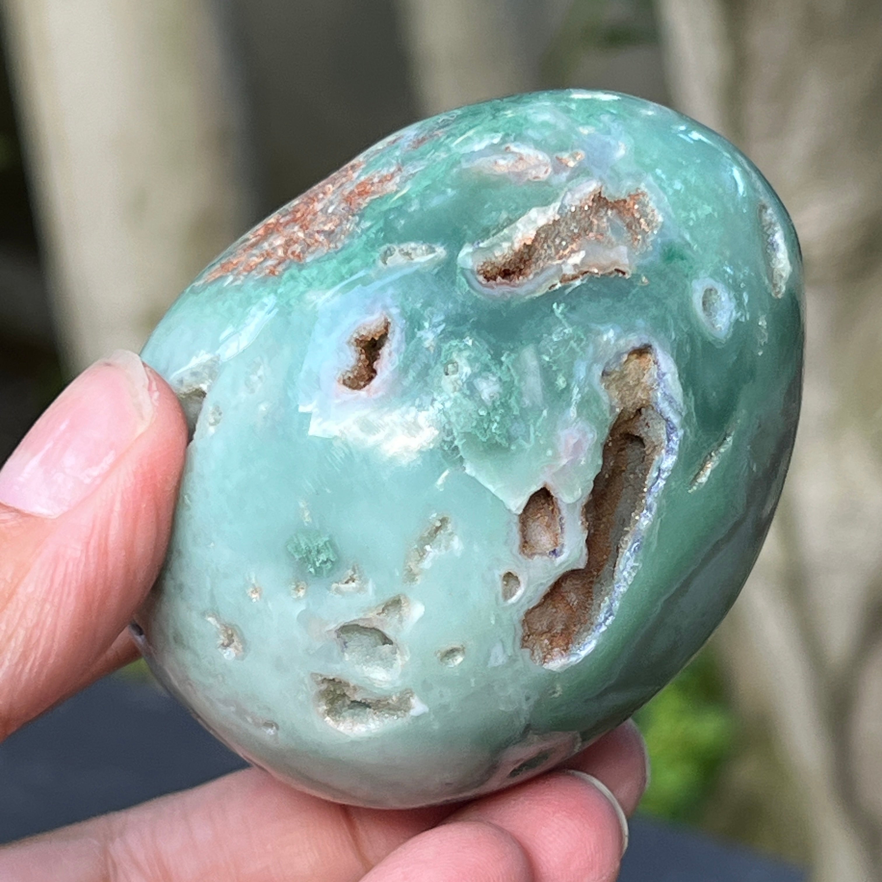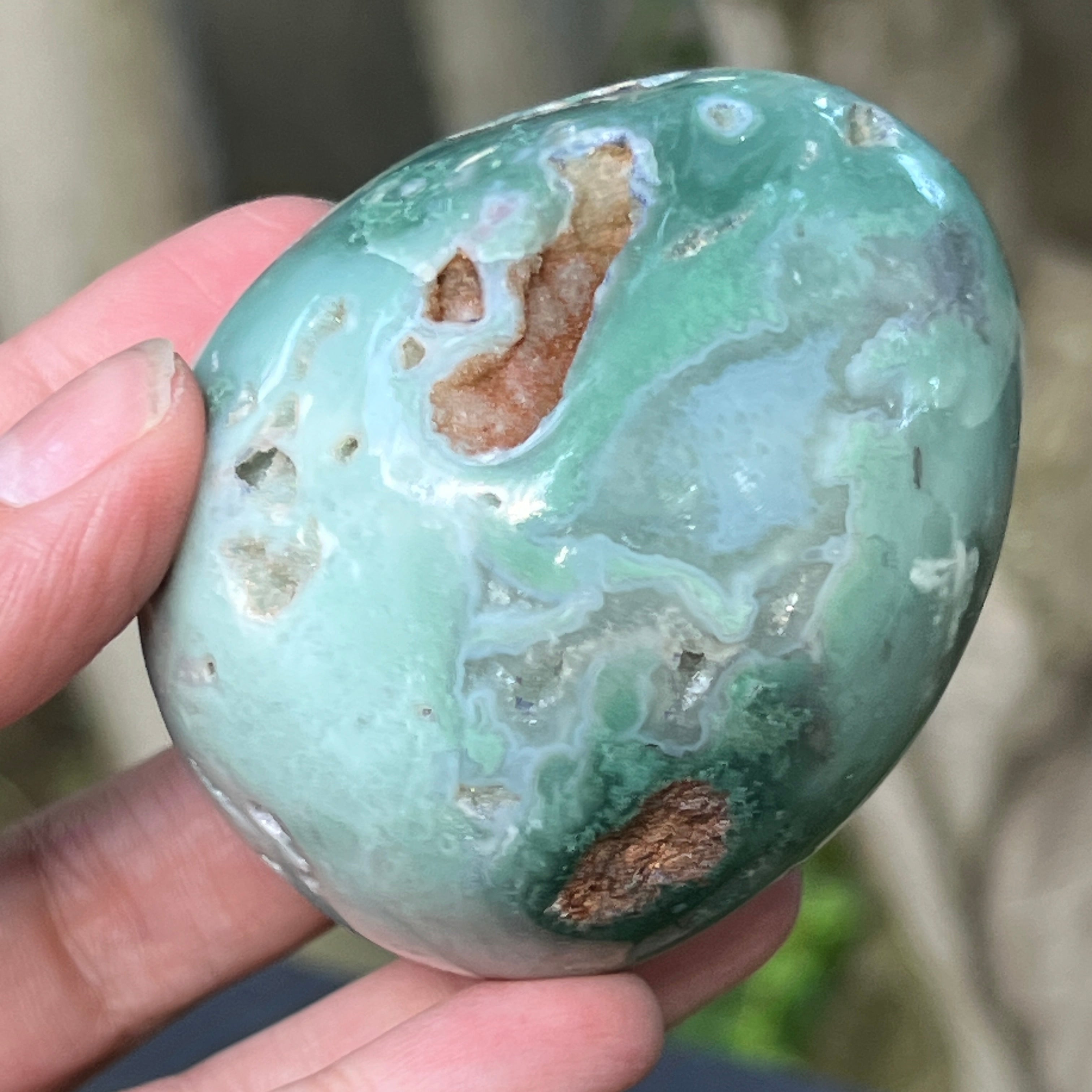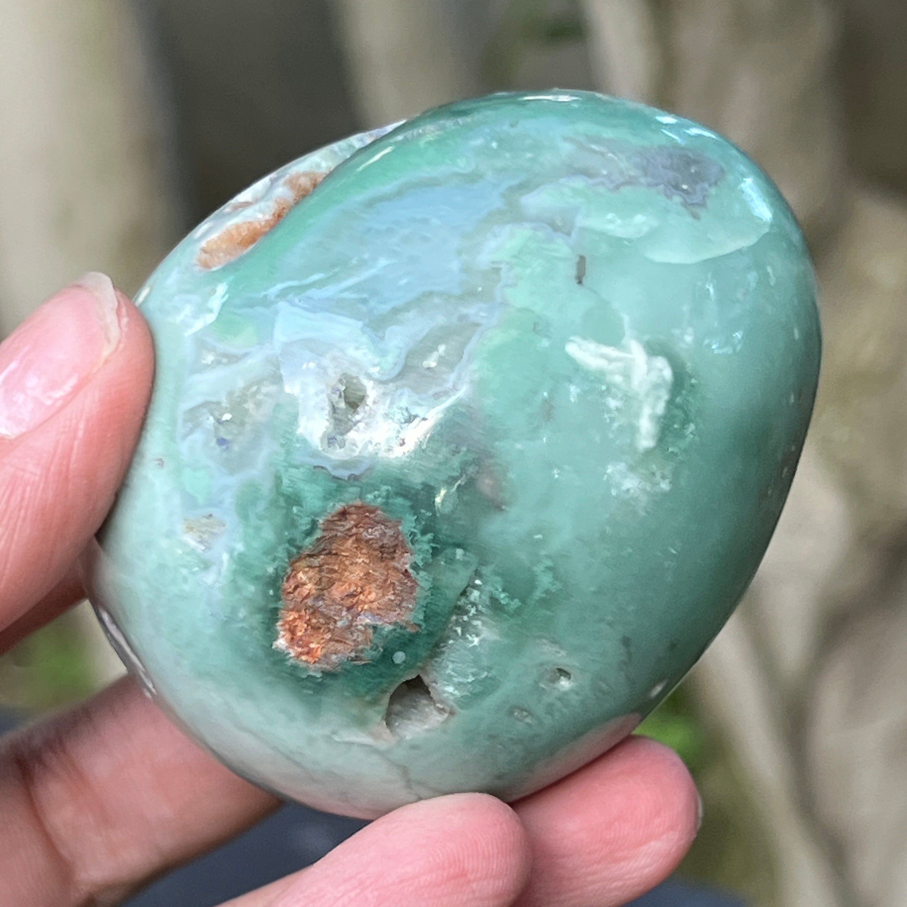 Това е естествена, неизменена форма на хромов халцедон – минерал, който е труден за намиране, добиван изключително в Зимбабве и ценен заради живия си цвят, който не произлиза от никел (както при хризопраз), а от хрома, който пулсира дълбоко в кристалната му структура. В тази специална разновидност, включванията на синьо и зелено създават завладяваща цветна игра с плавни преходи между полупрозрачно и непрозрачно, между плътно и ефирно.