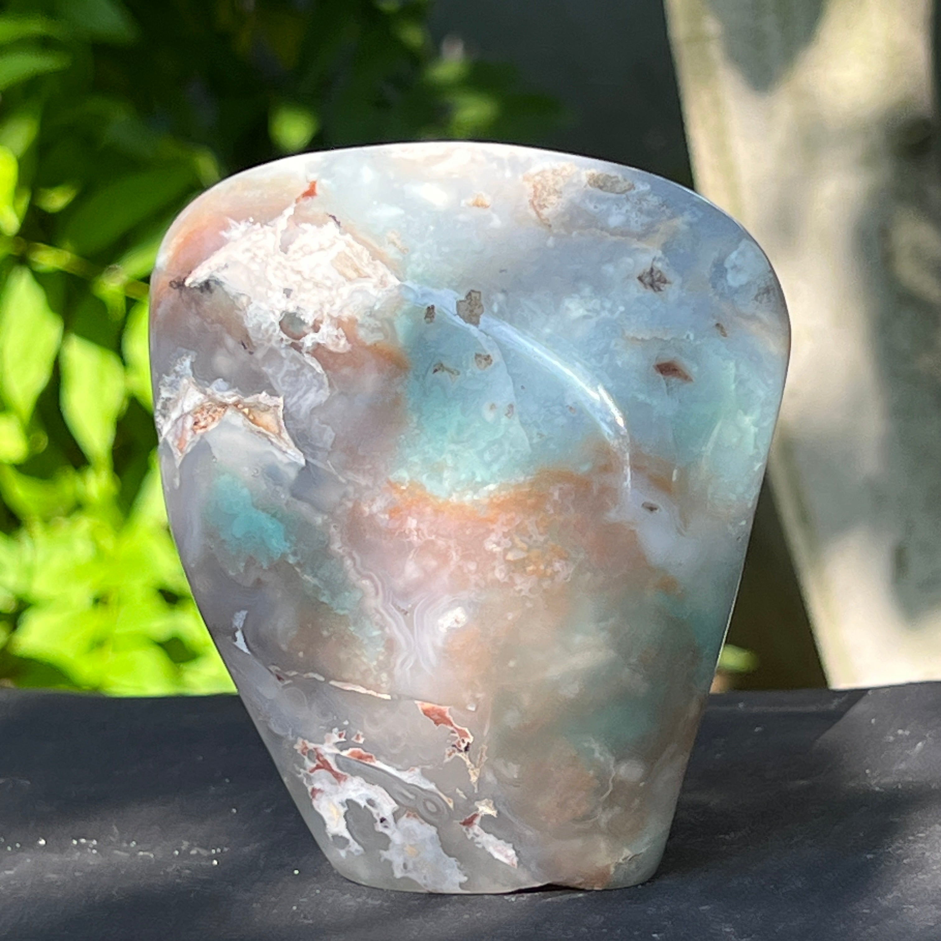 Това е естествена, неизменена форма на хромов хризопраз – минерал, който е труден за намиране, добиван изключително в Зимбабве и ценен заради живия си цвят, който не произлиза от никел (както при хризопраза), а от хрома, пулсиращ дълбоко в кристалната му структура. В тази специална разновидност, включванията на синьо и зелено създават завладяваща цветна игра с плавни преходи между полупрозрачно и непрозрачно, между плътно и ефирно.