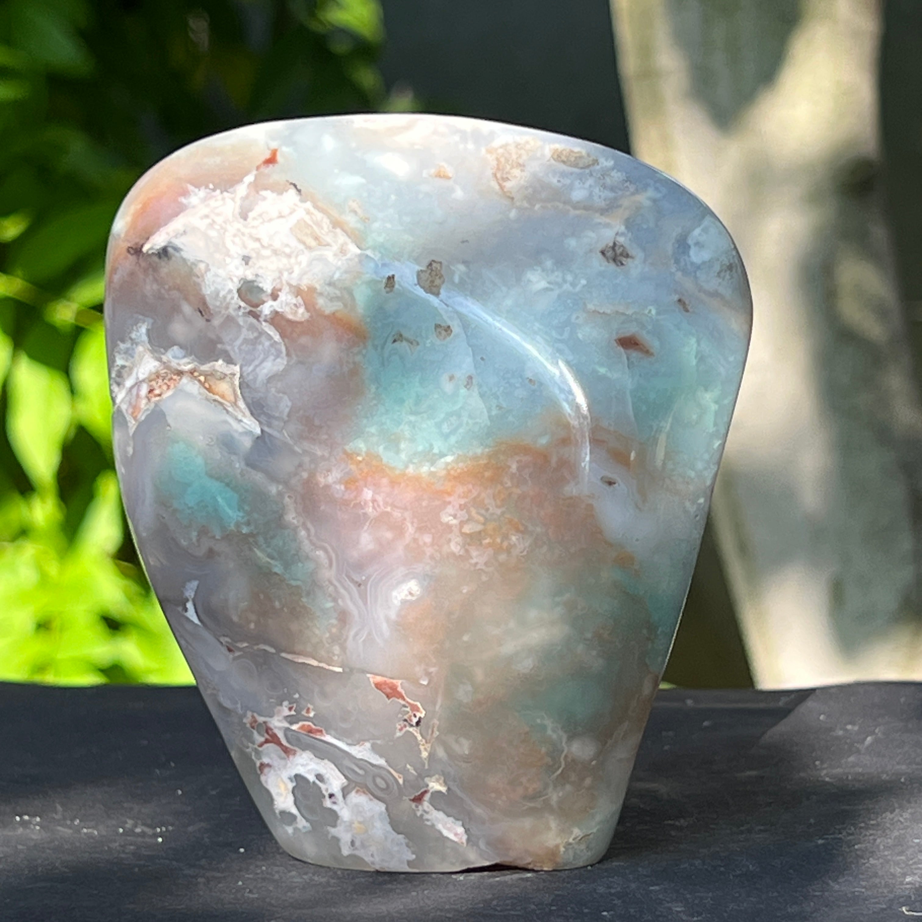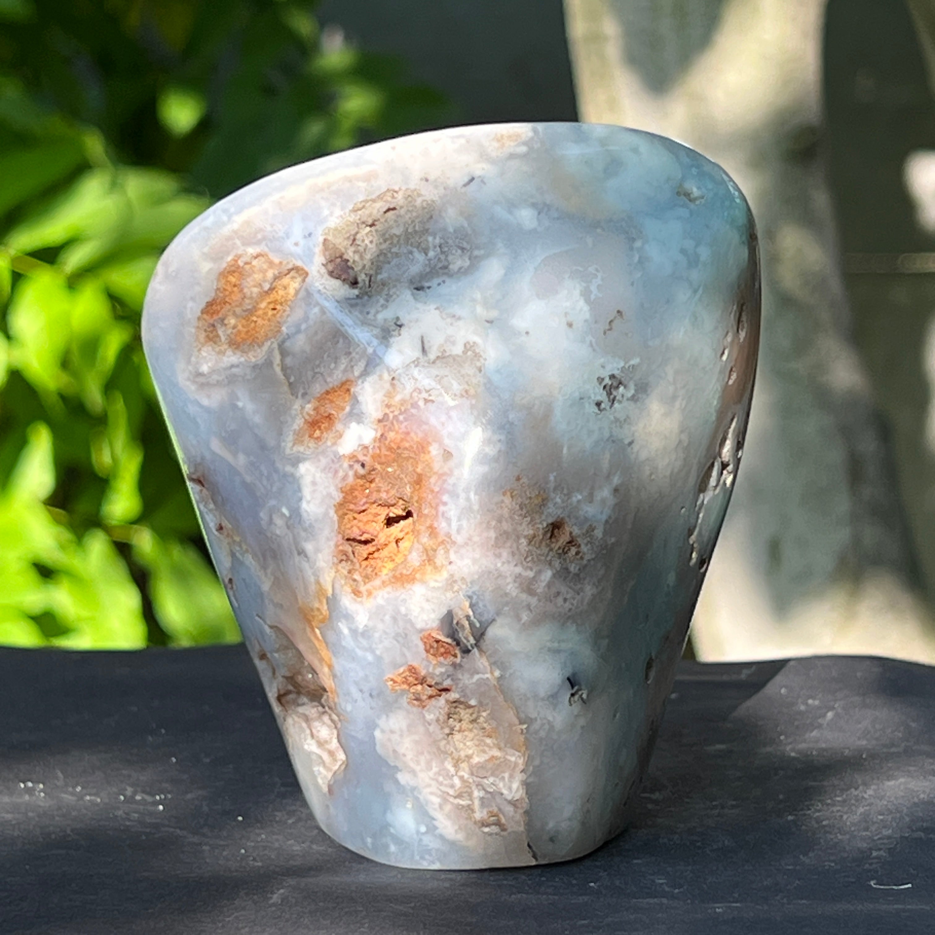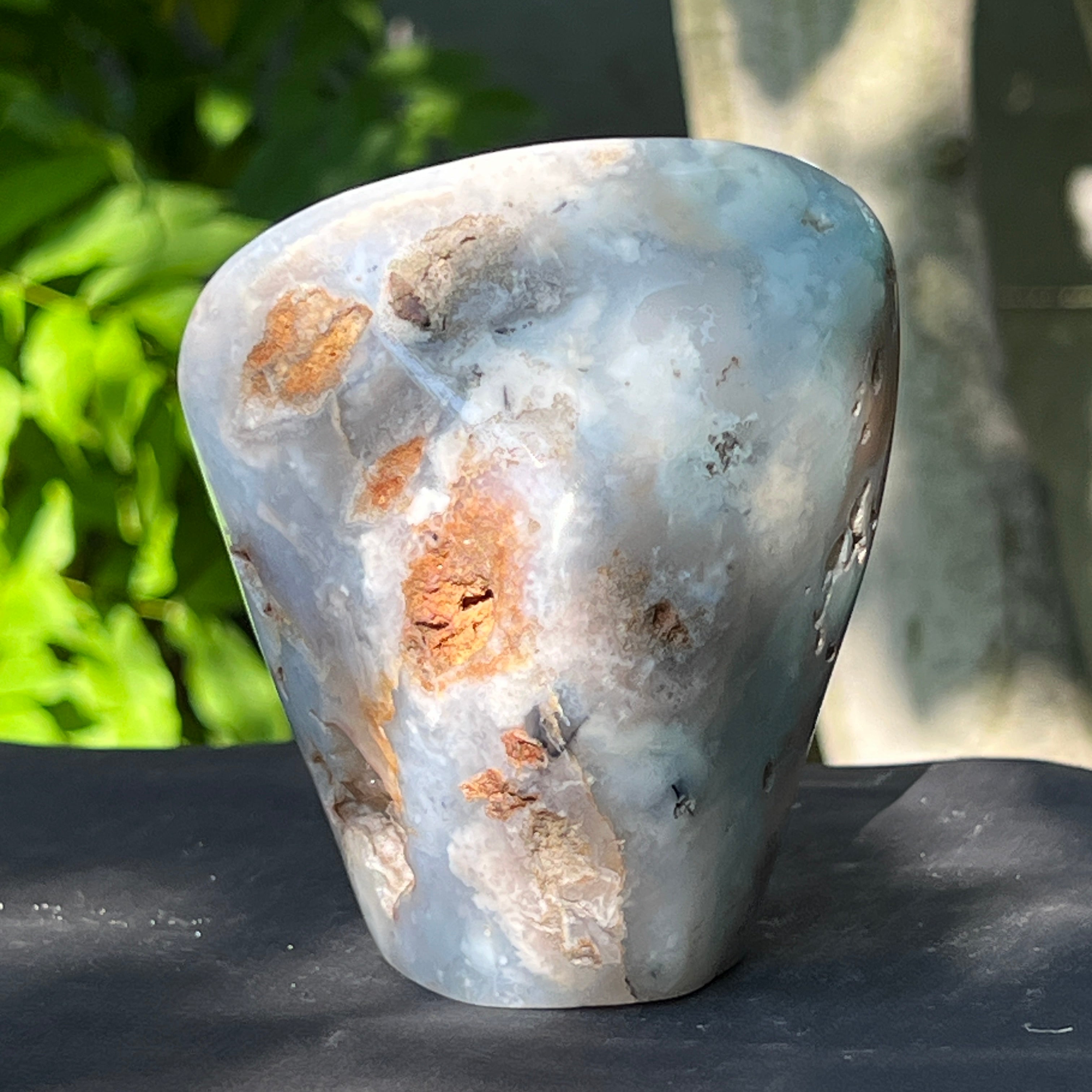 Неговата текстура е жива – с жилки от млечно калцедон, дискретни кварцови фрагменти и ръждиви петна по матрицата – всички свидетелства за бавно формиране в сложна и напрегната геоложка среда.