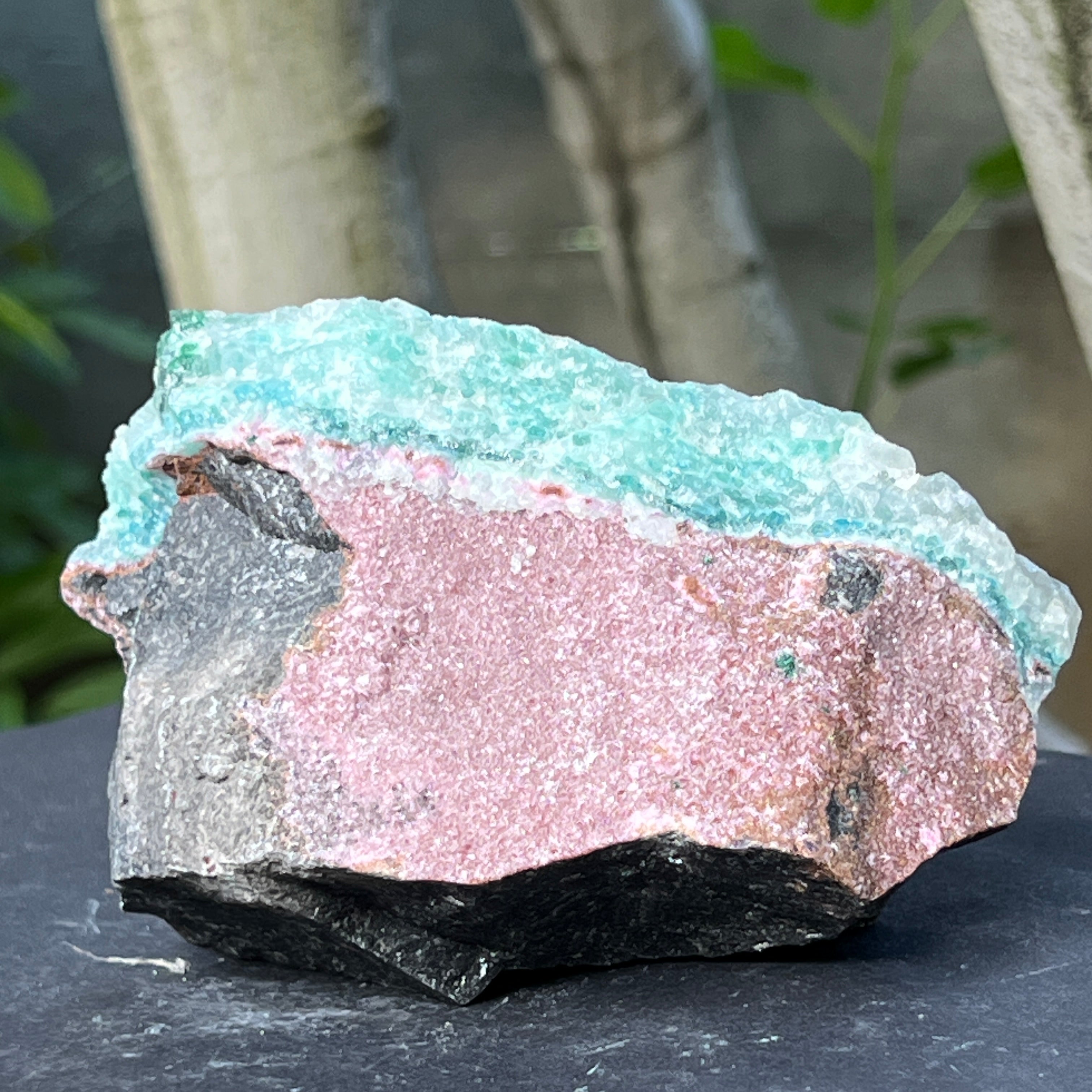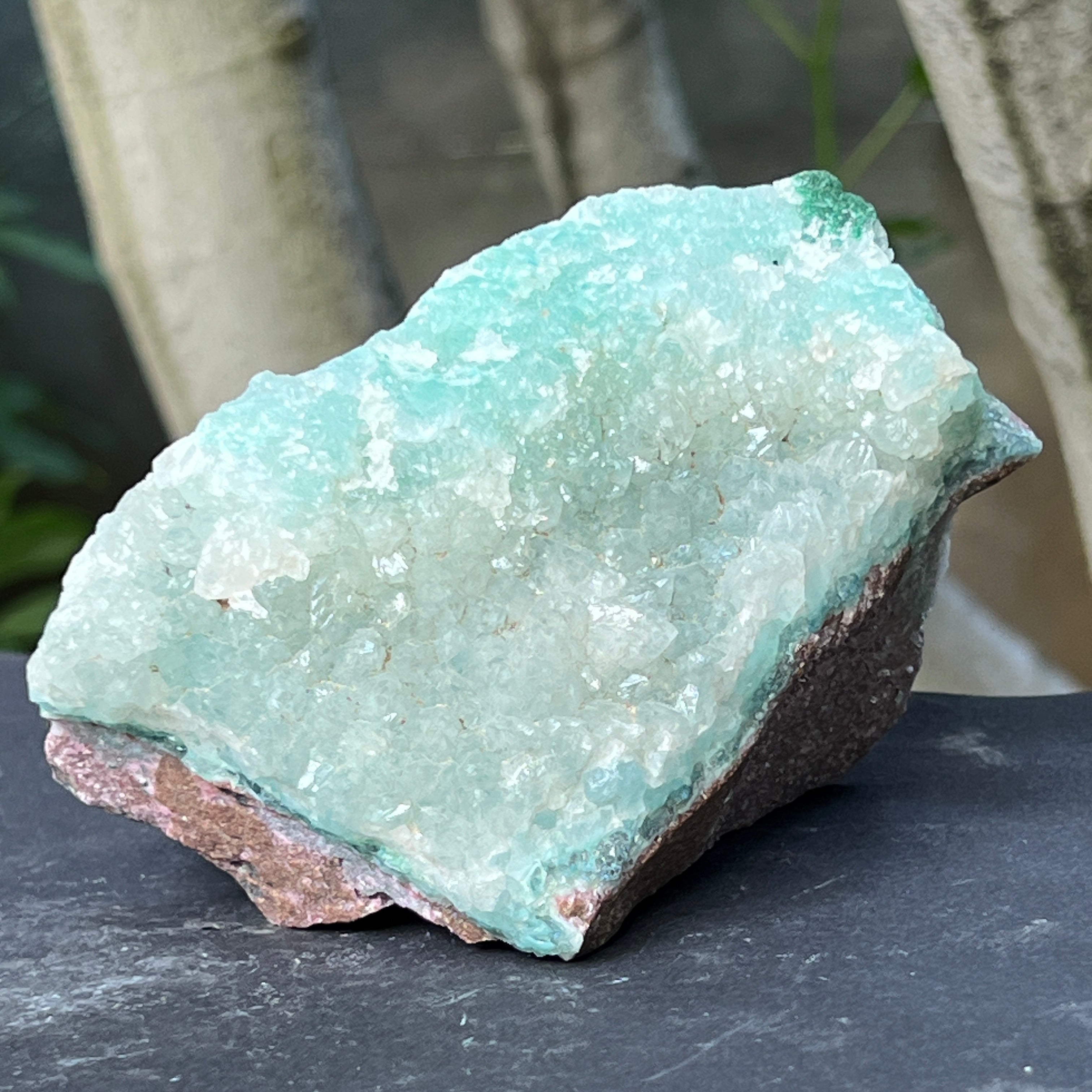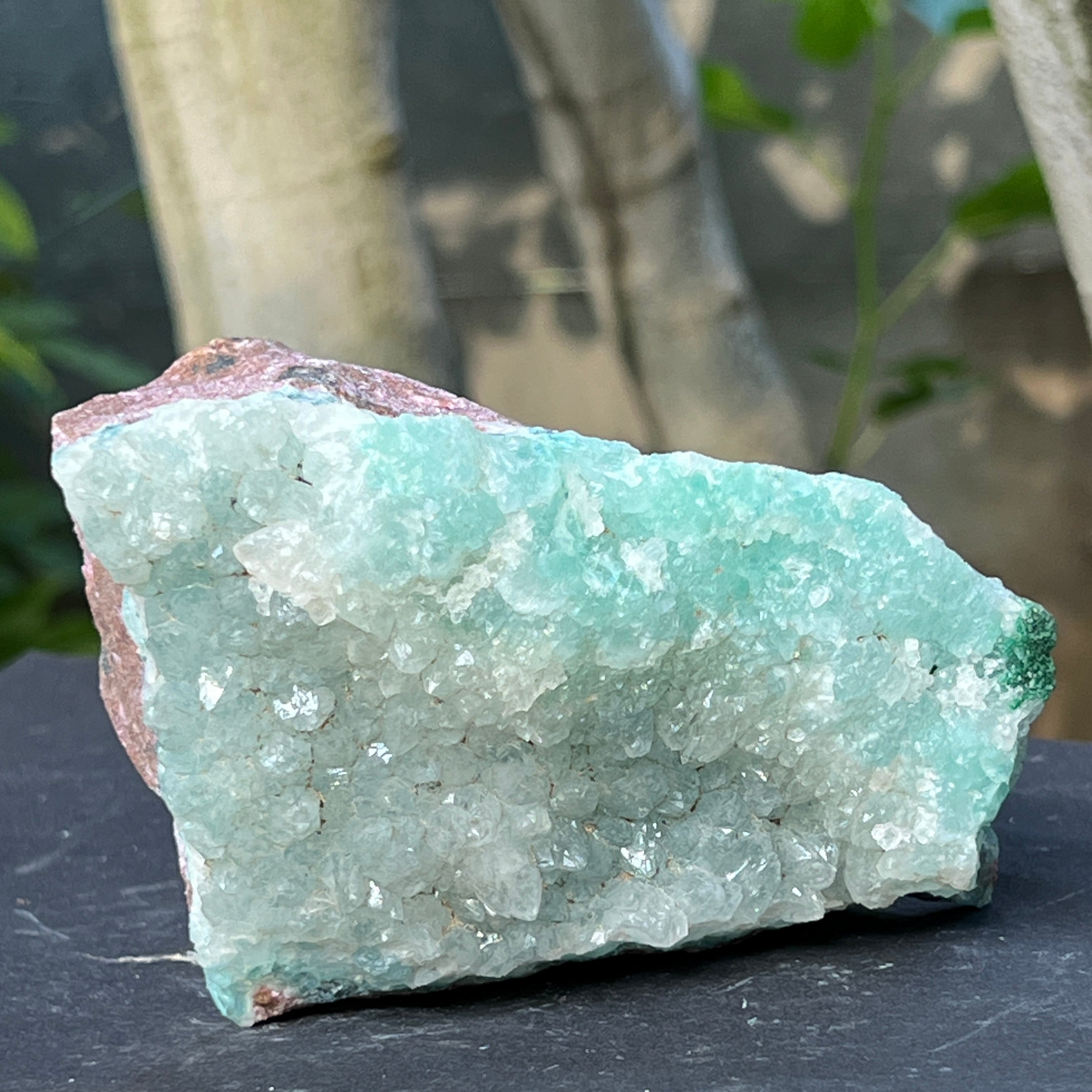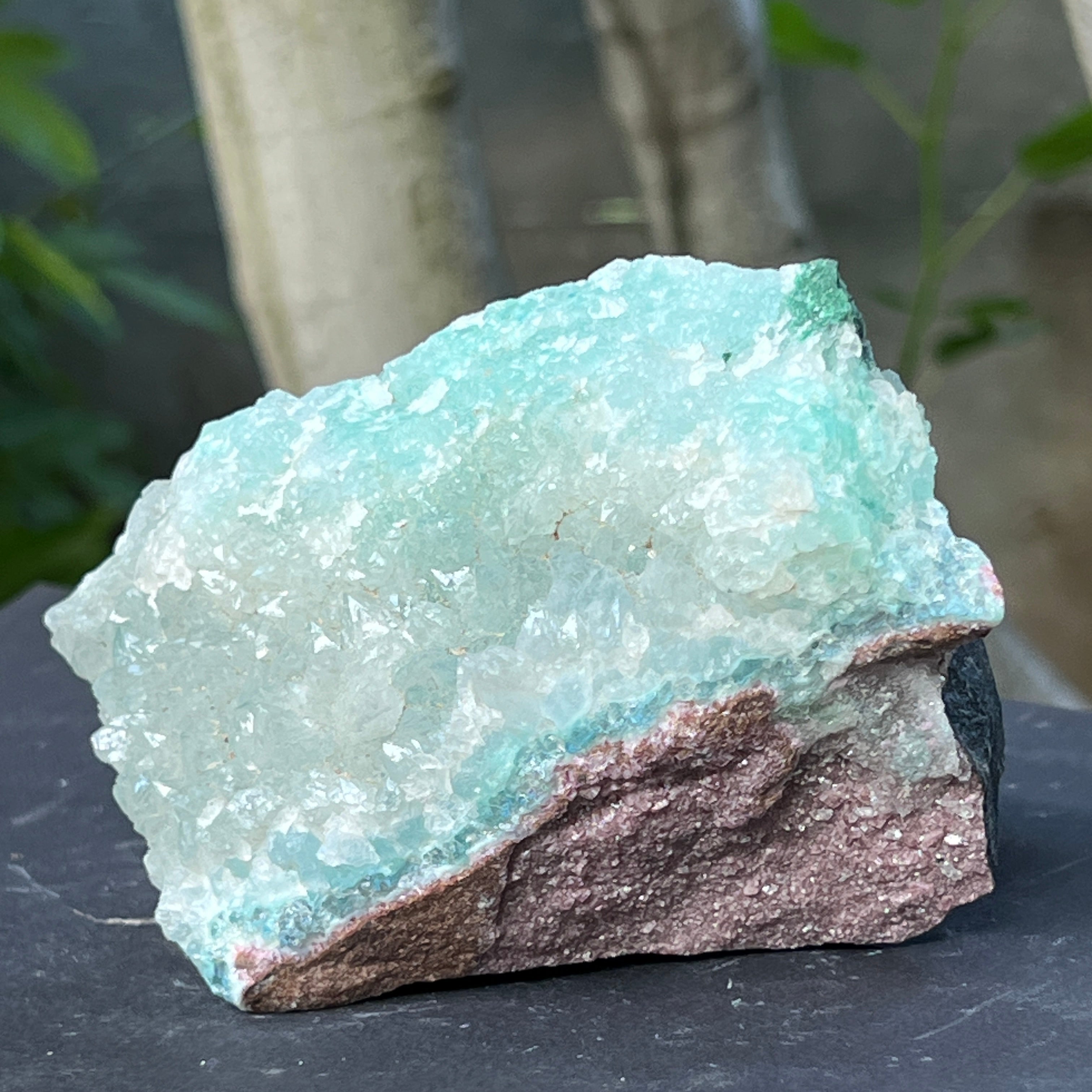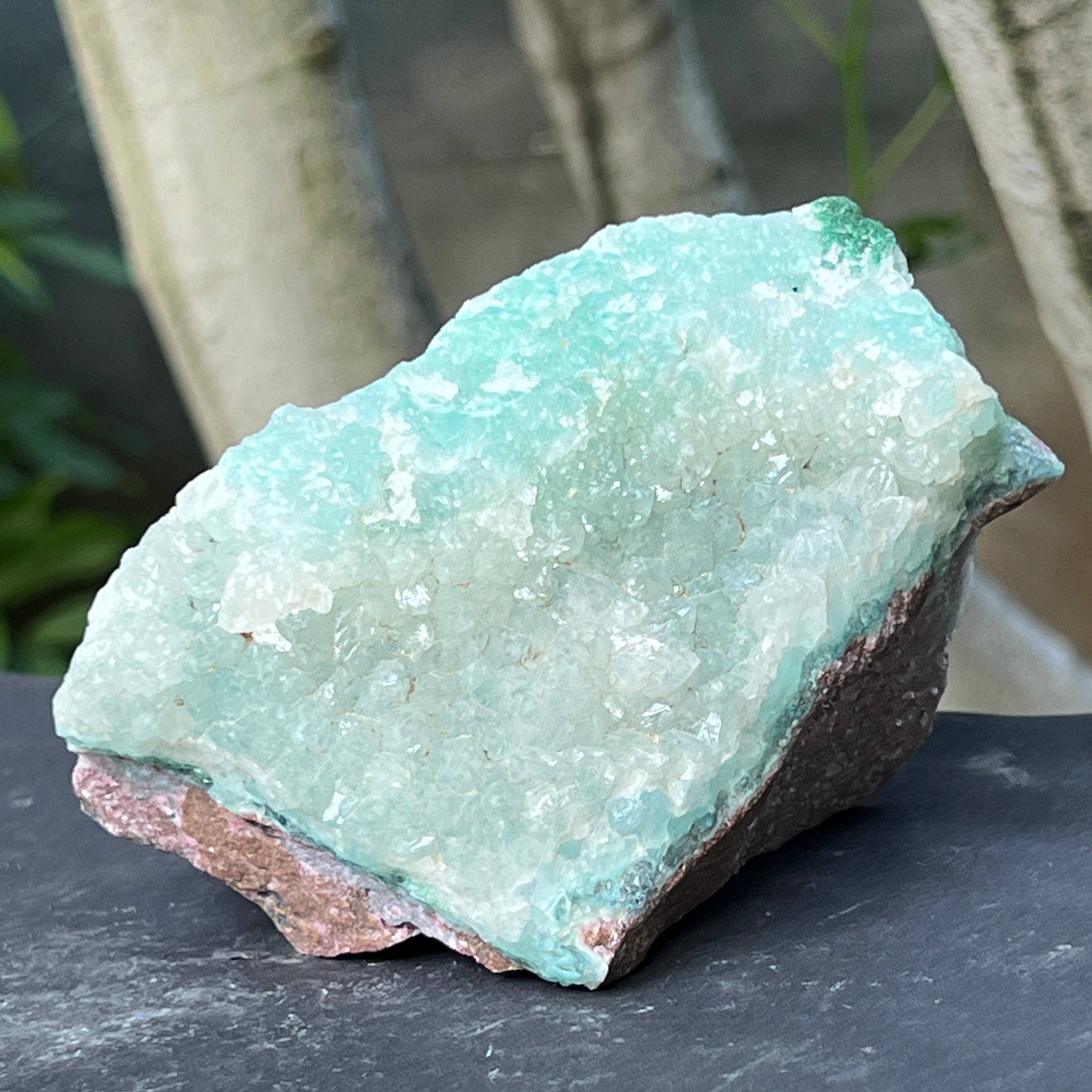 Това е естествена, непроменена форма на хромо-калцедон – минерал, труден за намиране, добиван единствено в Зимбабве и ценен заради живия си цвят, който не произлиза от никел (както при хризопраз), а от хрома, който пулсира дълбоко в кристалната му структура. В тази особена разновидност, вграждането на сини и зелени нюанси създава завладяваща цветова игра с плавни преходи между прозрачно и непрозрачно, между плътно и ефирно.