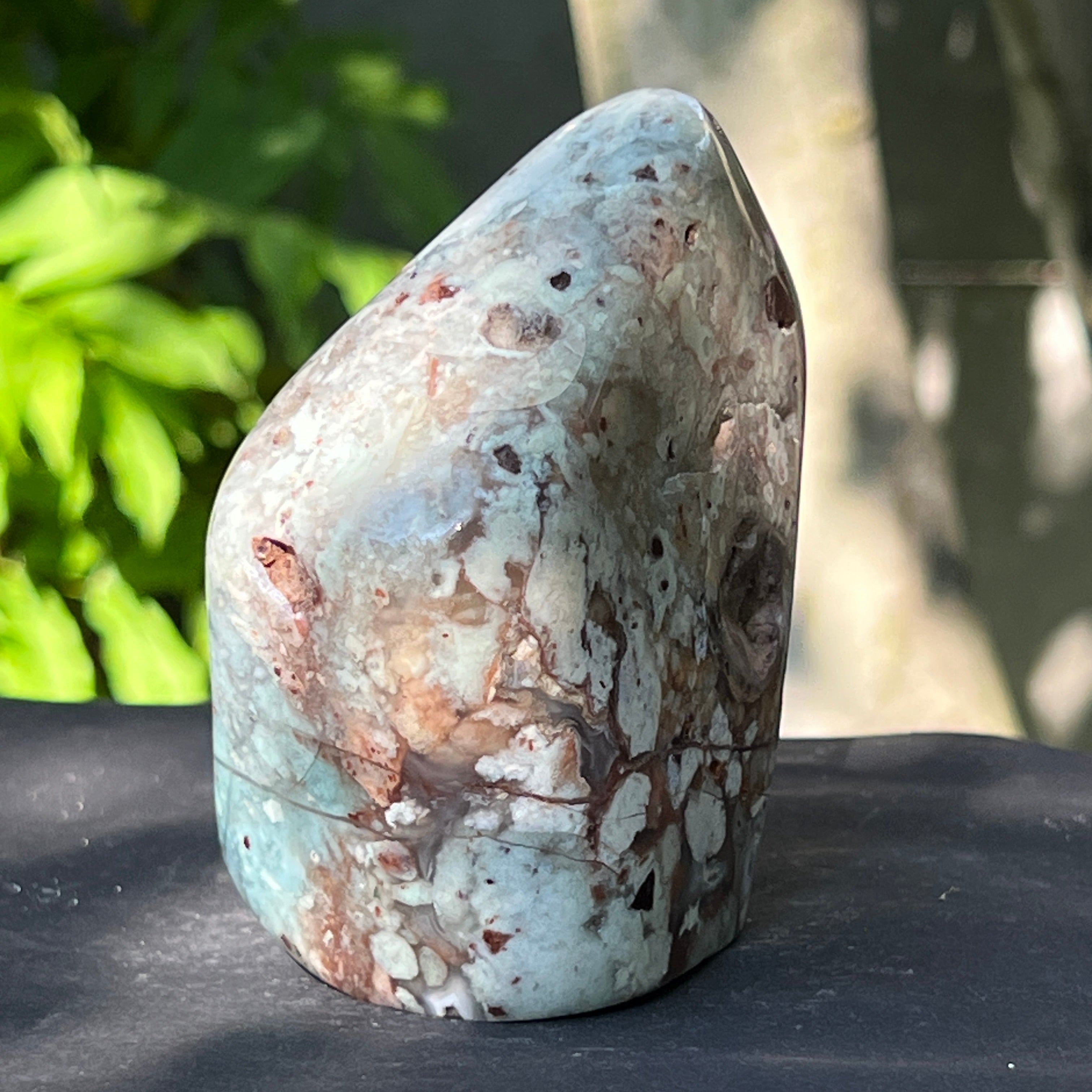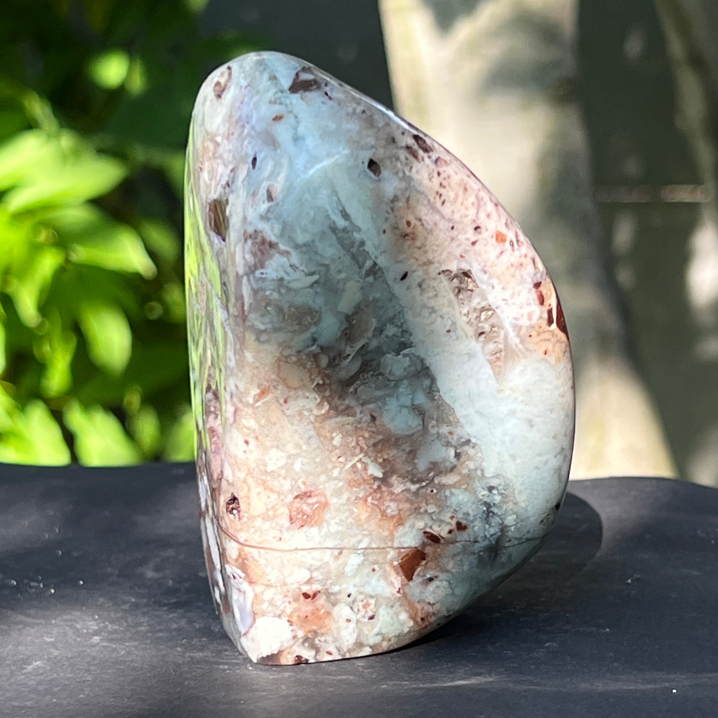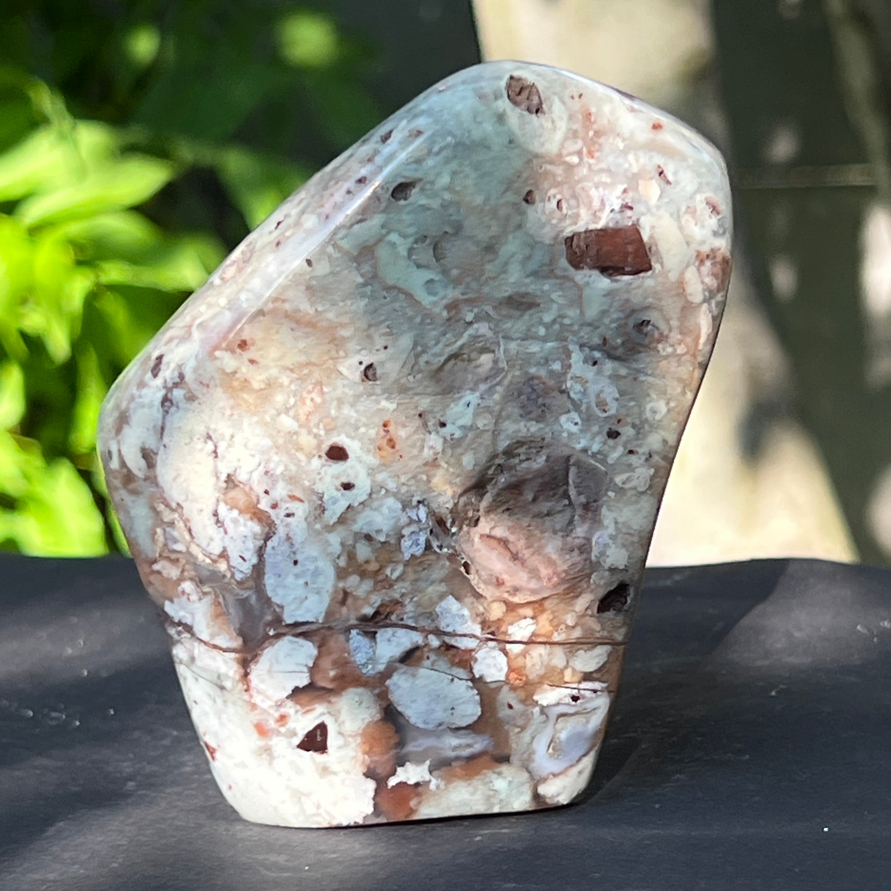 Неговата текстура е жива – с жилки от млечно калцедон, дискретни кварцови шупли и ръждиви петна от матрикс – всички свидетелства за бавно формиране в сложна геологична среда, пълна с напрежения.