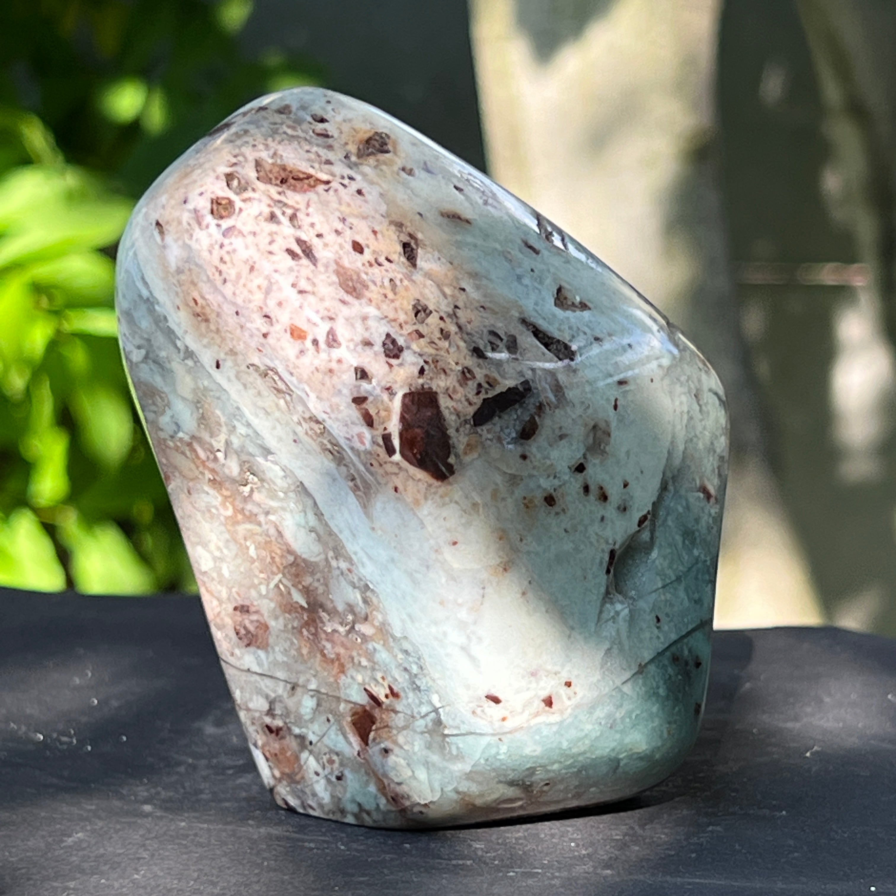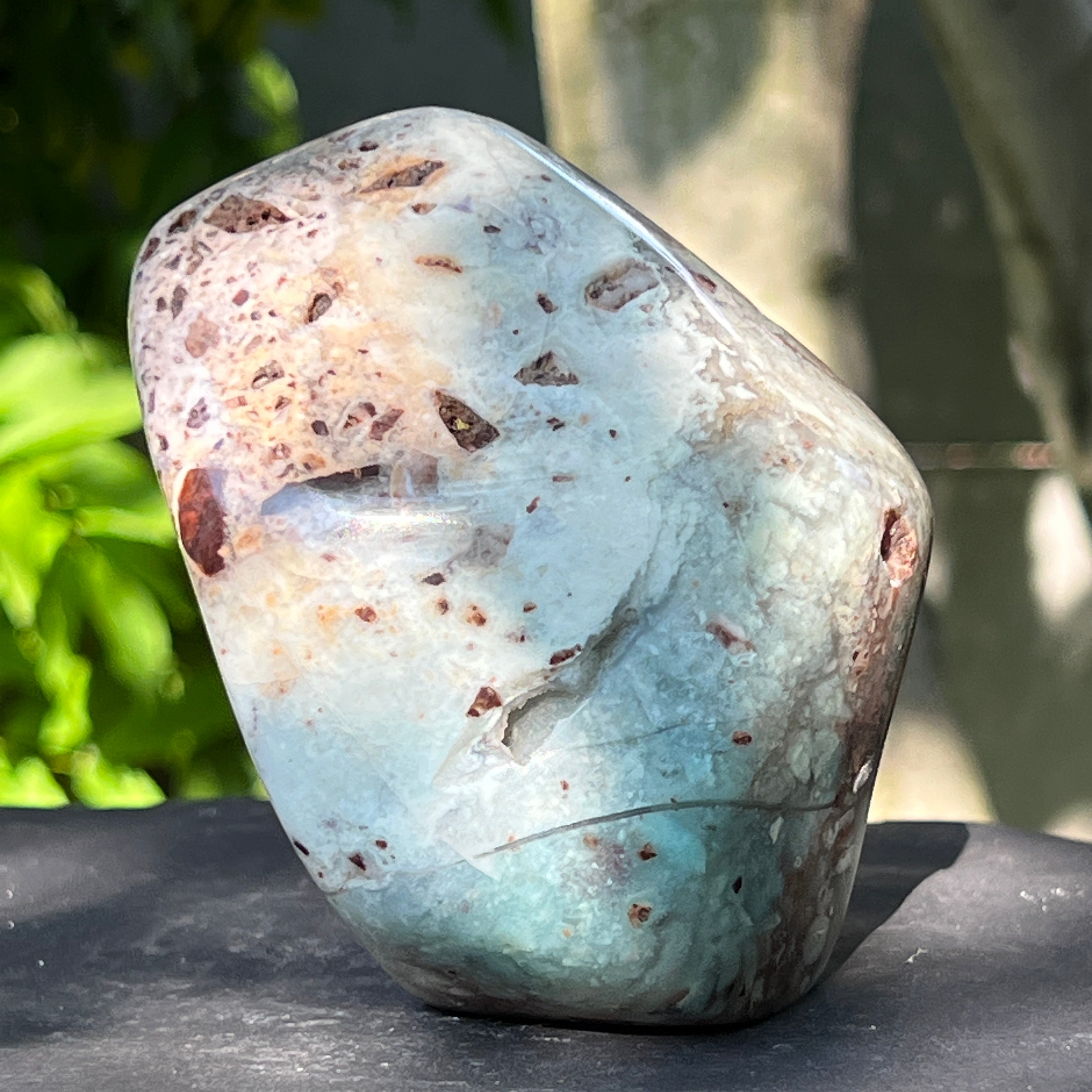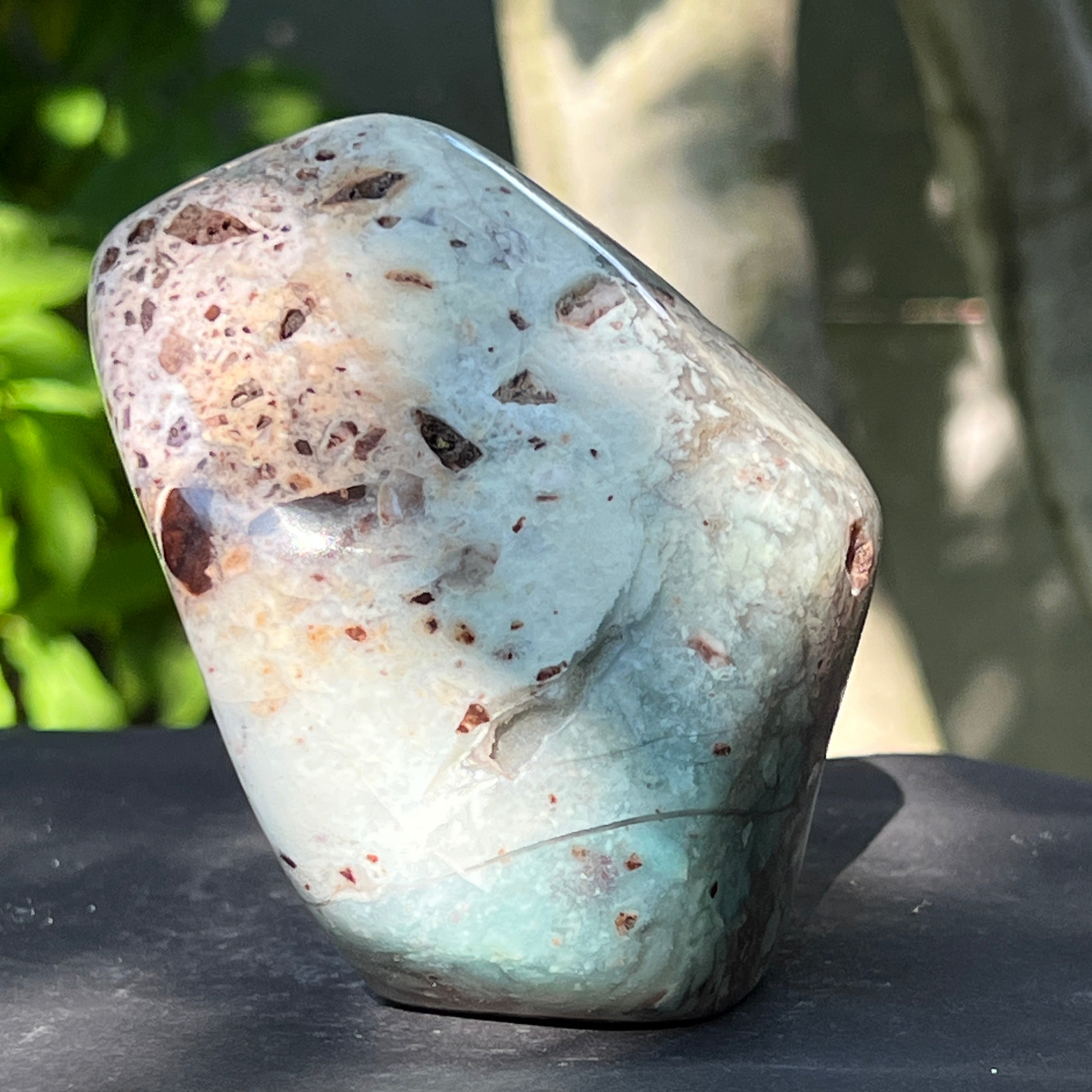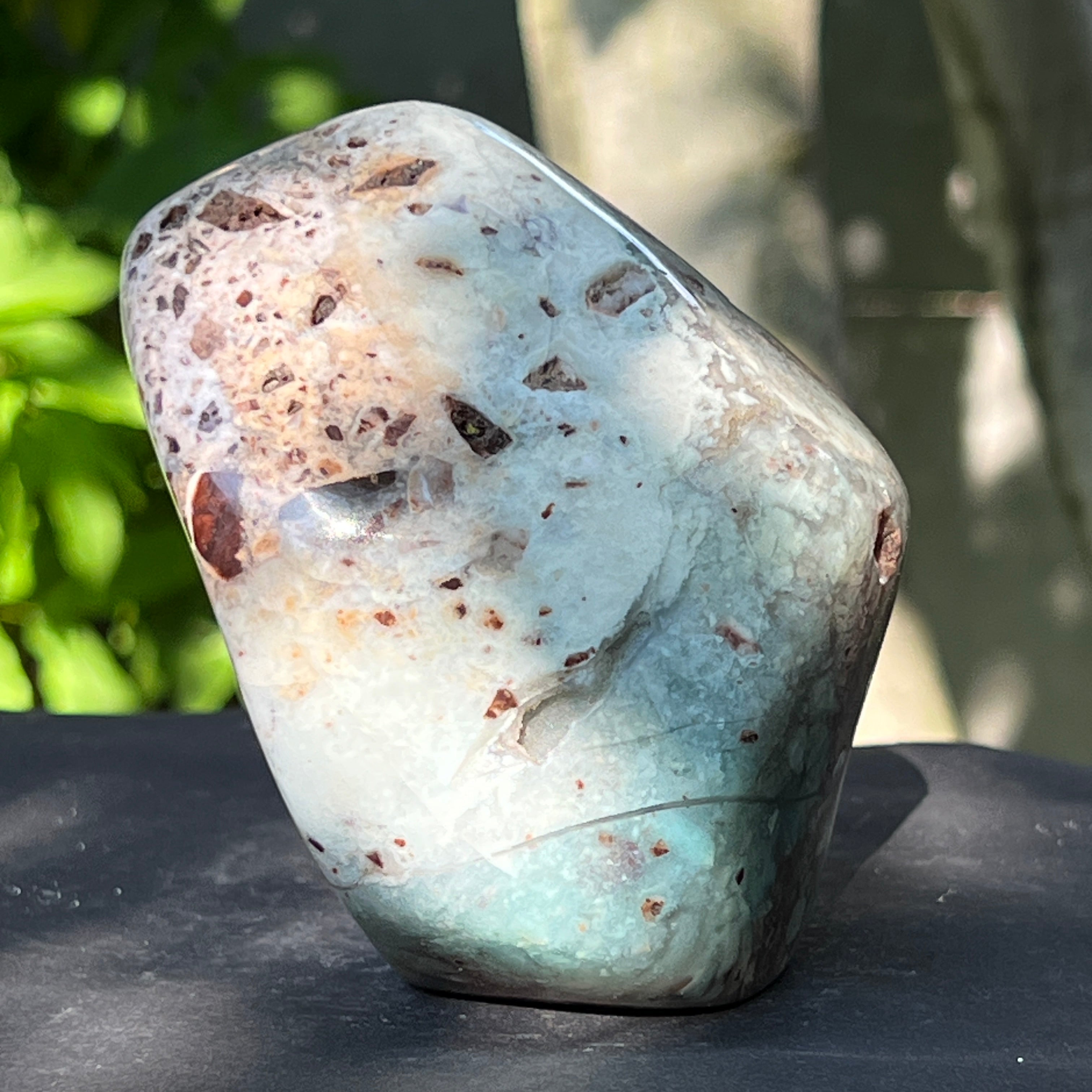 Неговата текстура е жива – с жилки от млечно калцедон, дискретни кварцови шупли и ръждиви петна от матрикс – всички свидетелства за бавно формиране в сложна геологична среда, пълна с напрежения.