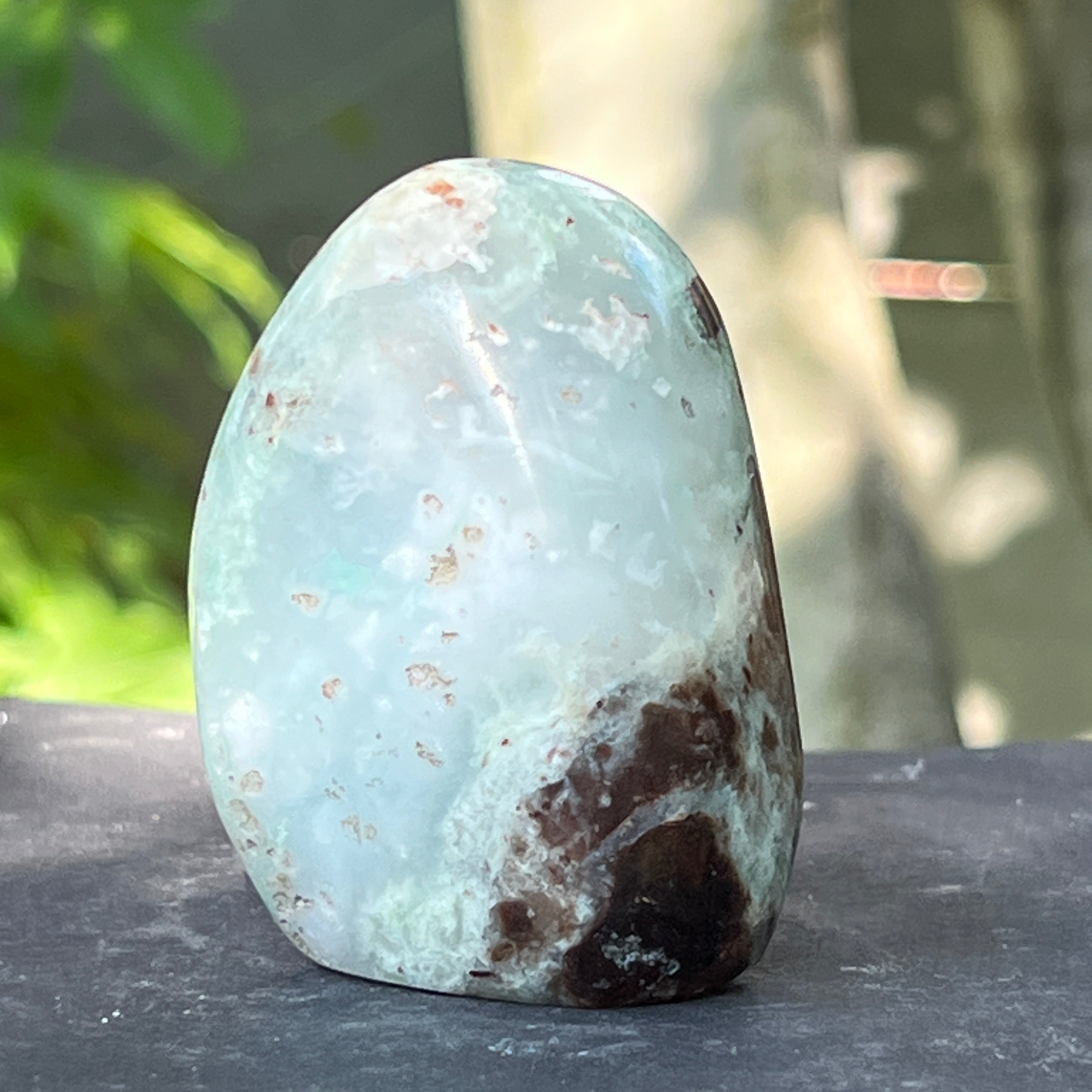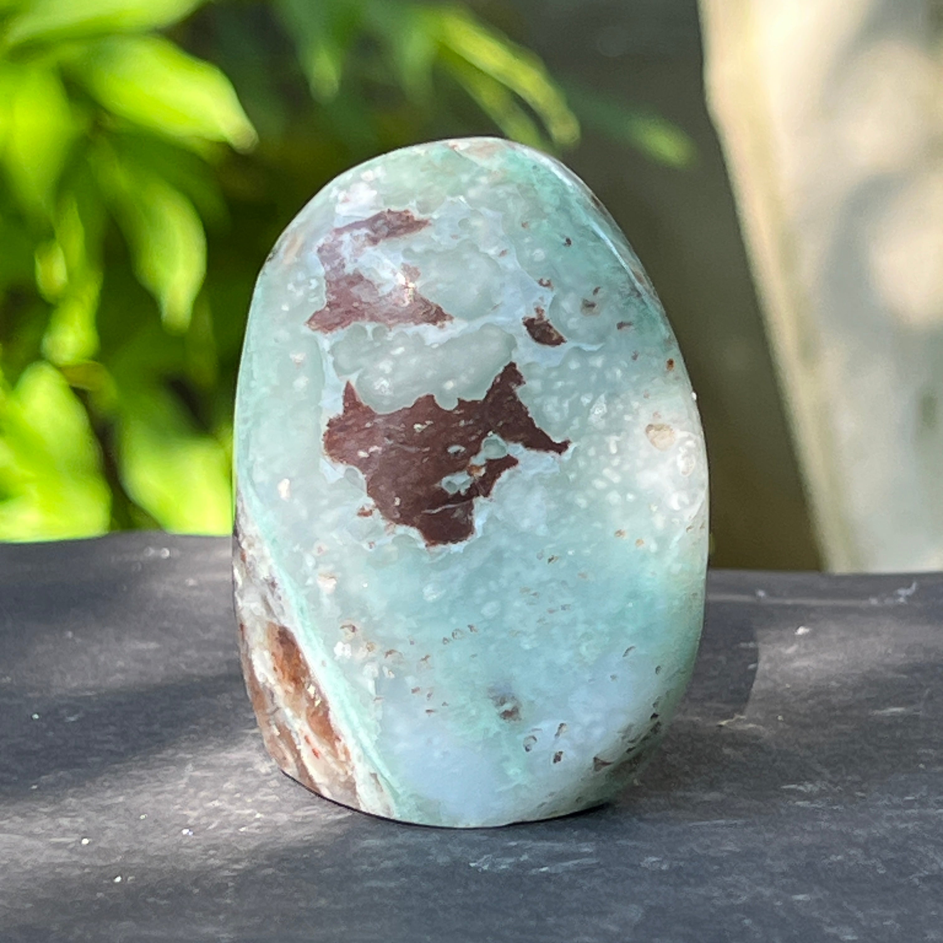 Това е естествена, непокътната форма на хромов халцедон – минерал, трудно достъпен, изкопан единствено в Зимбабве и ценен заради живия си цвят, който не идва от никел (както при хризопраза), а от хрома, който пулсира дълбоко в кристалната му структура. В този особен вариант, сините и зелените включвания създават впечатляваща цветова игра с плавни преходи между прозрачно и непрозрачно, между плътно и въздушно.