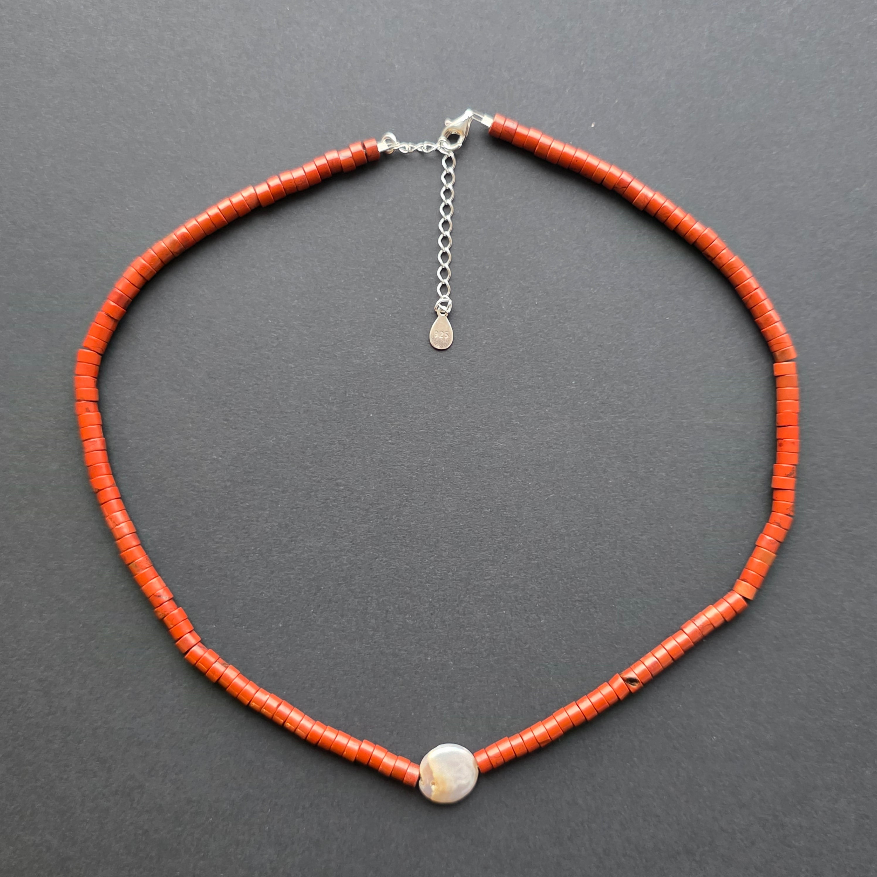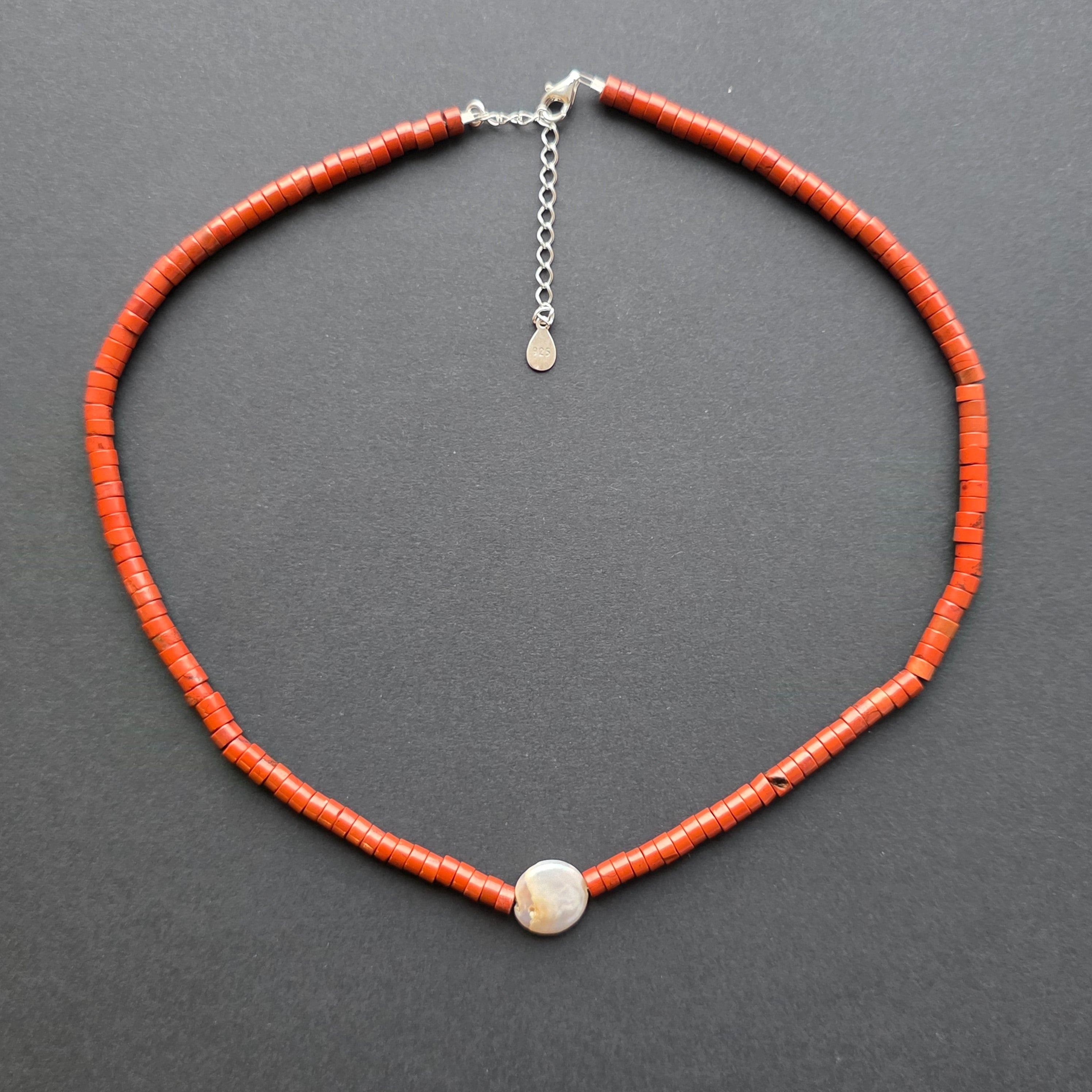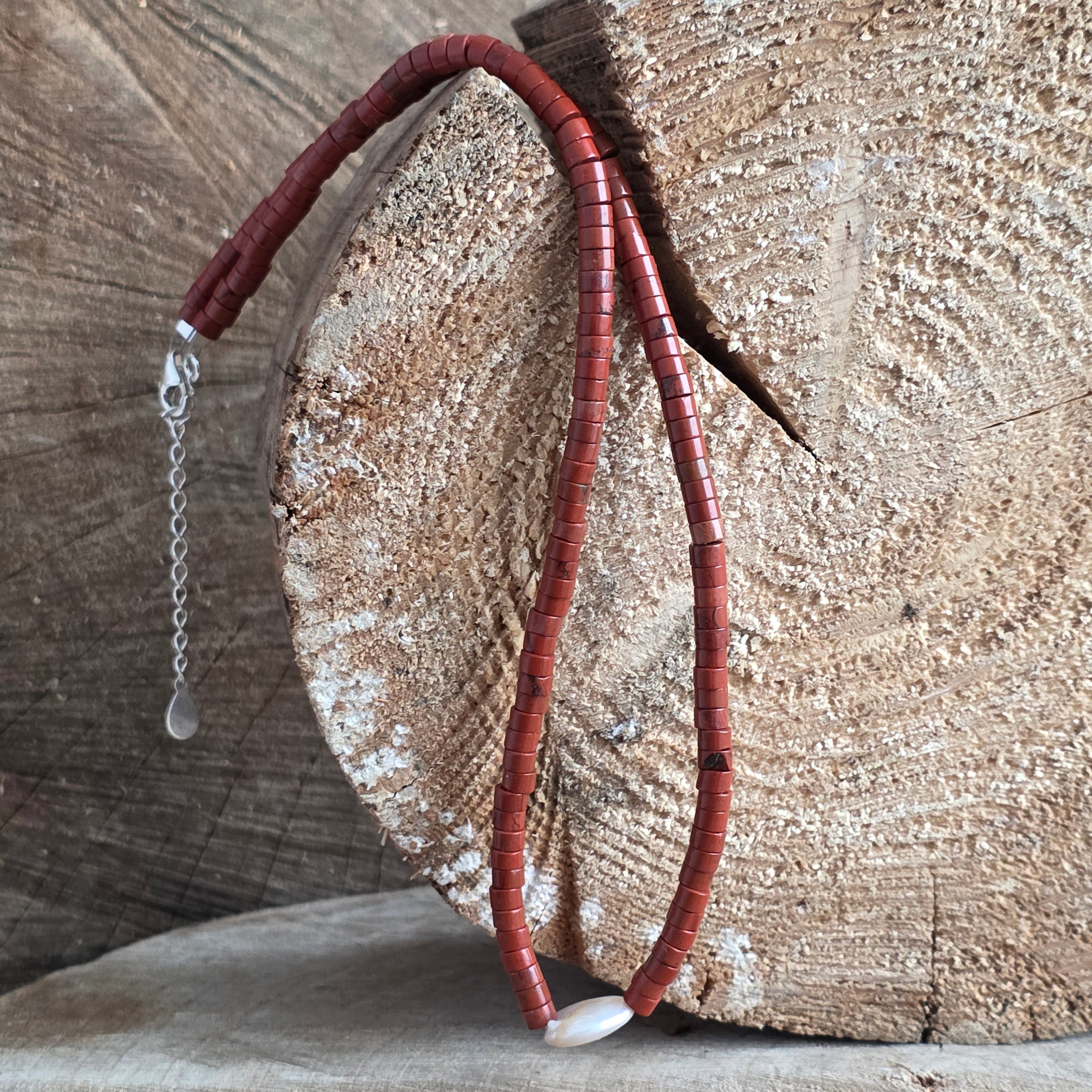 Колието носи енергията на земята и благородната простота на природата. Естественият червен яспис, нарязан на финни дискове 4,5 × 2 мм, излъчва сила и жизненост, а централната перла 1 см добавя светлинен акцент, като капка спокойствие в средата на яркия цвят. Заедно, те създават перфектен баланс между страст и спокойствие, между огън и вода.