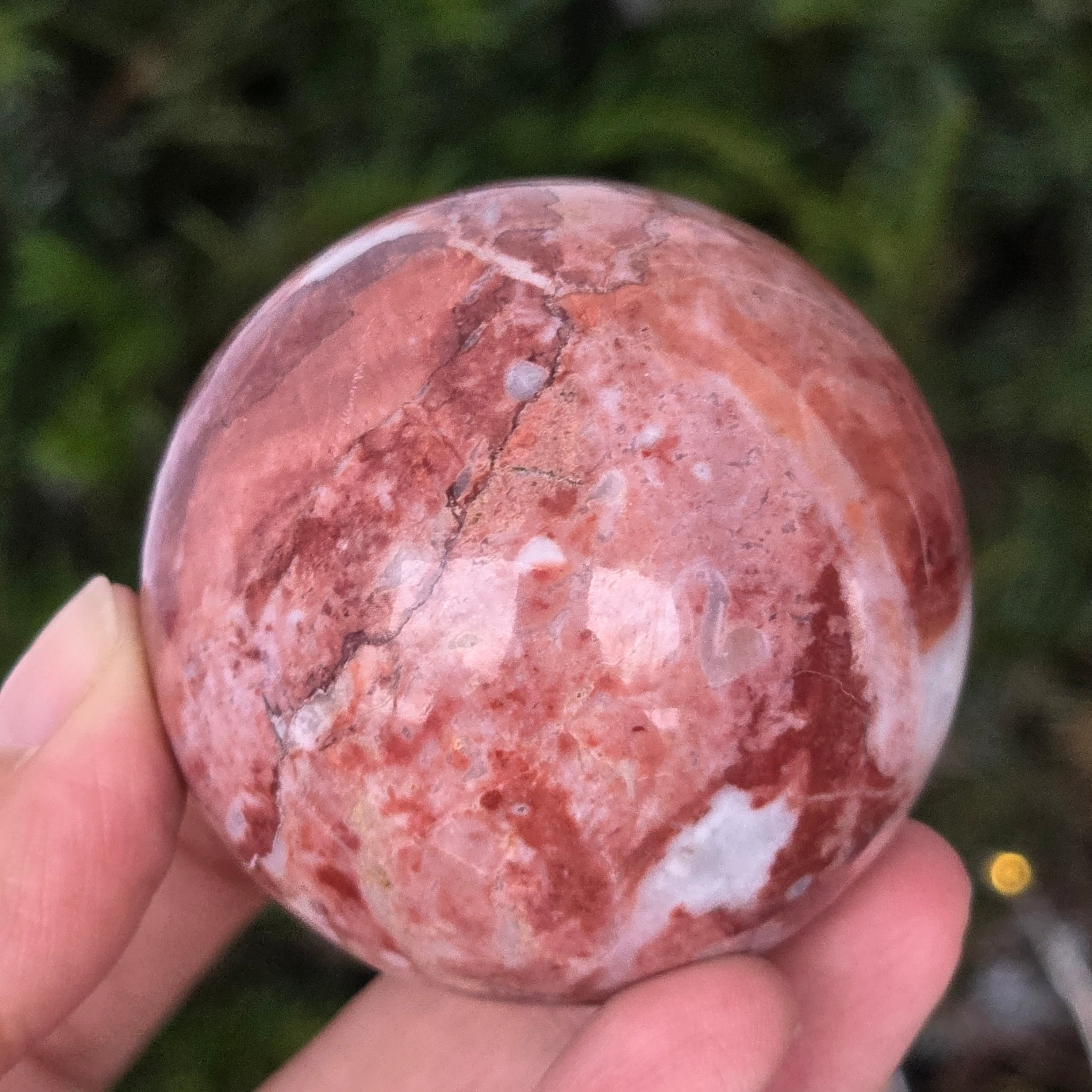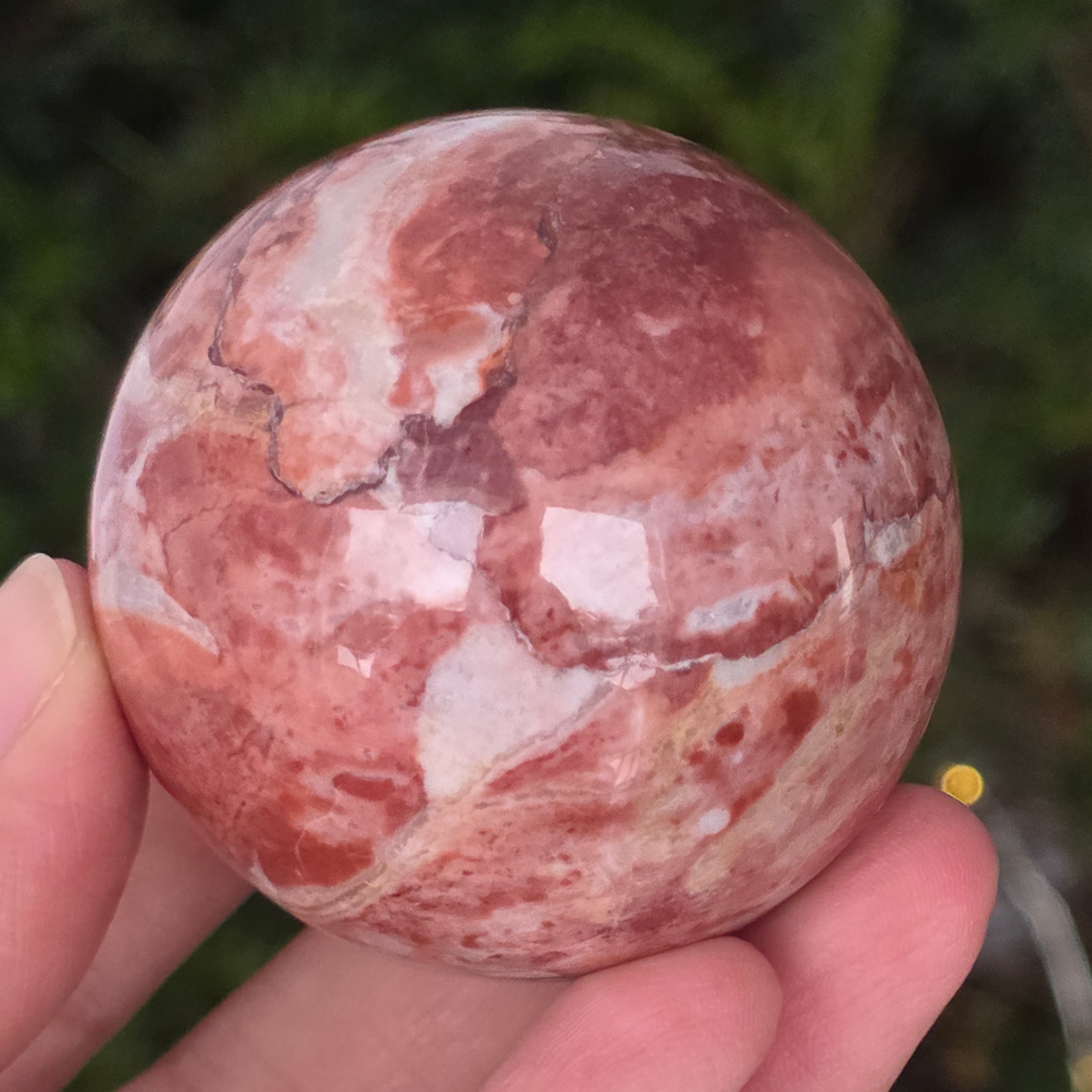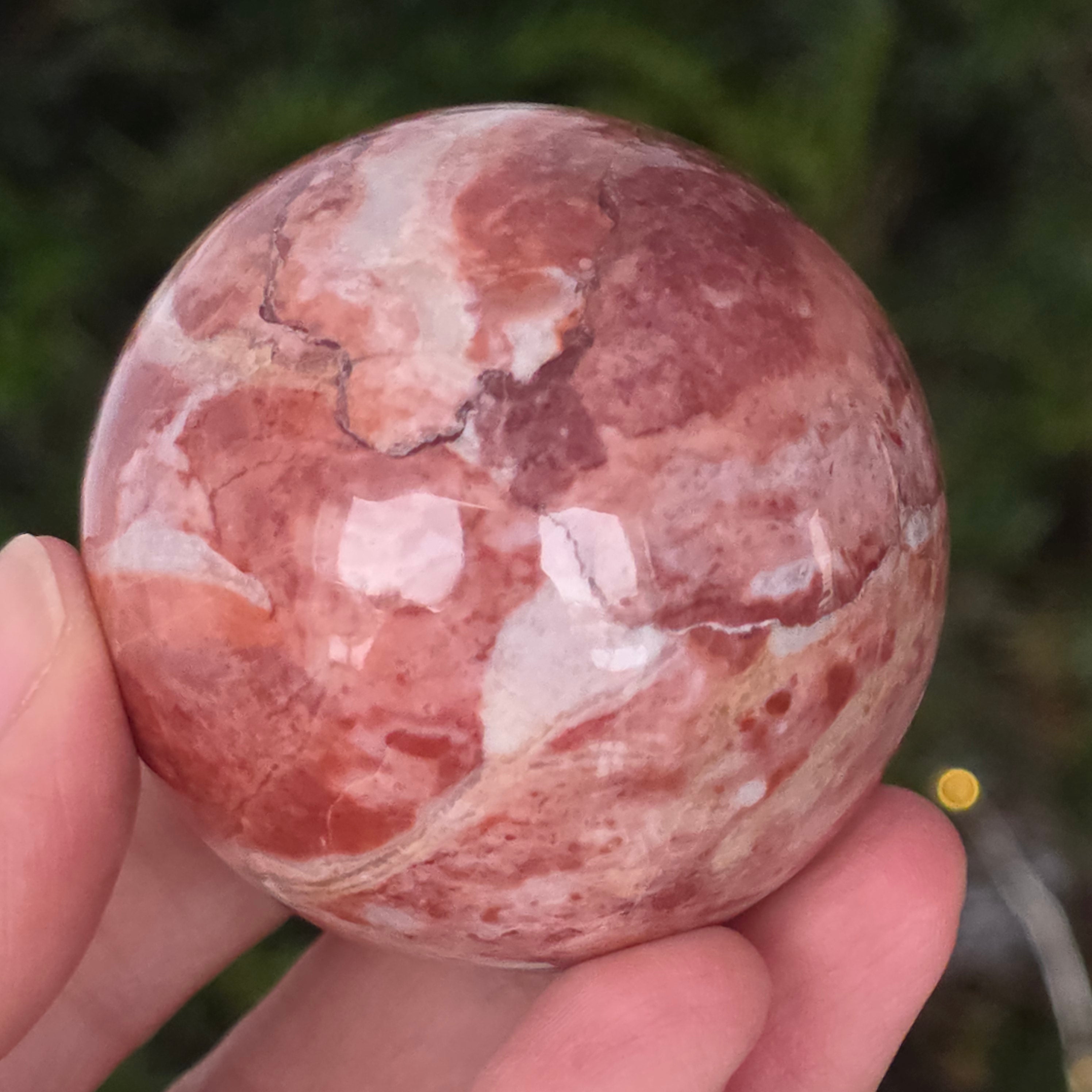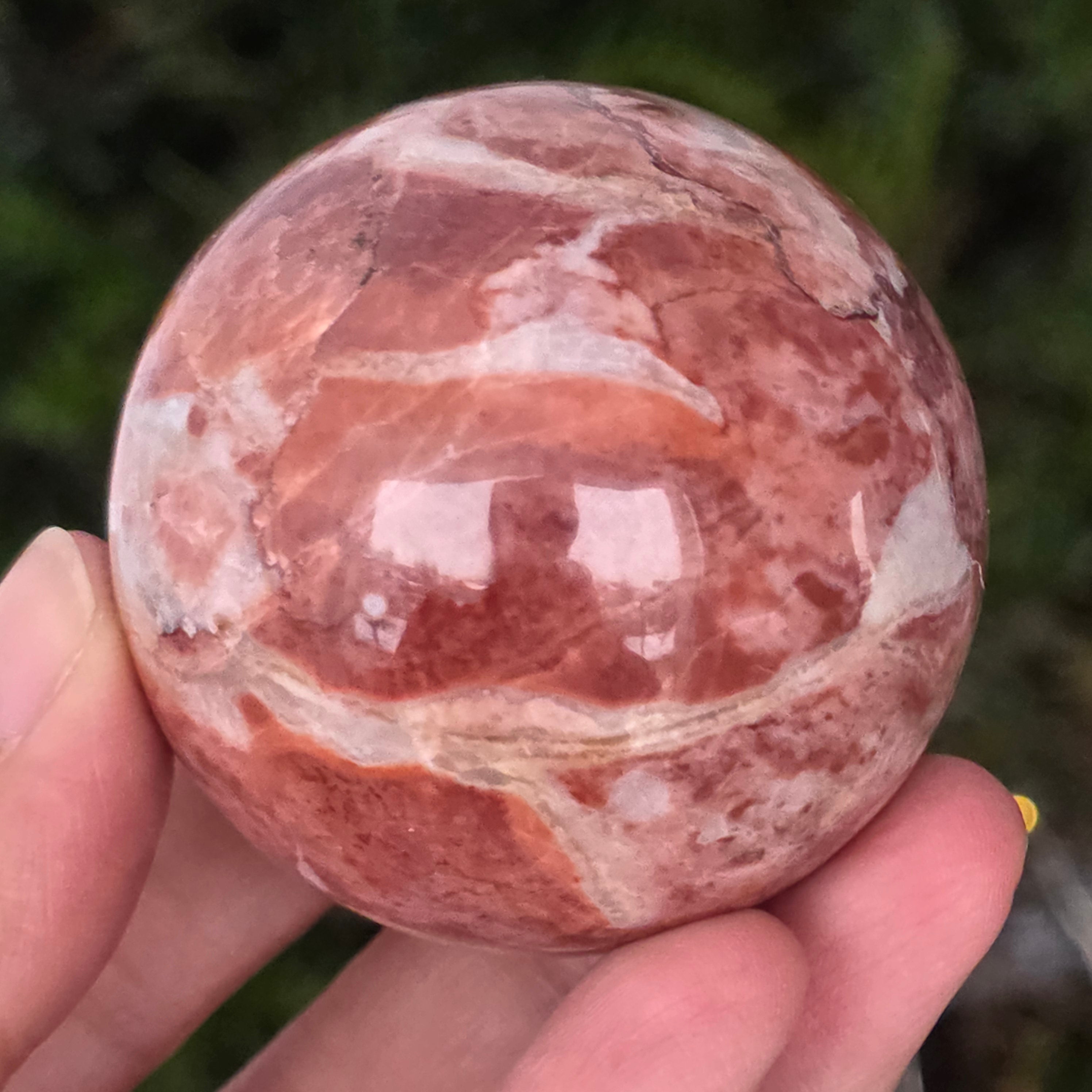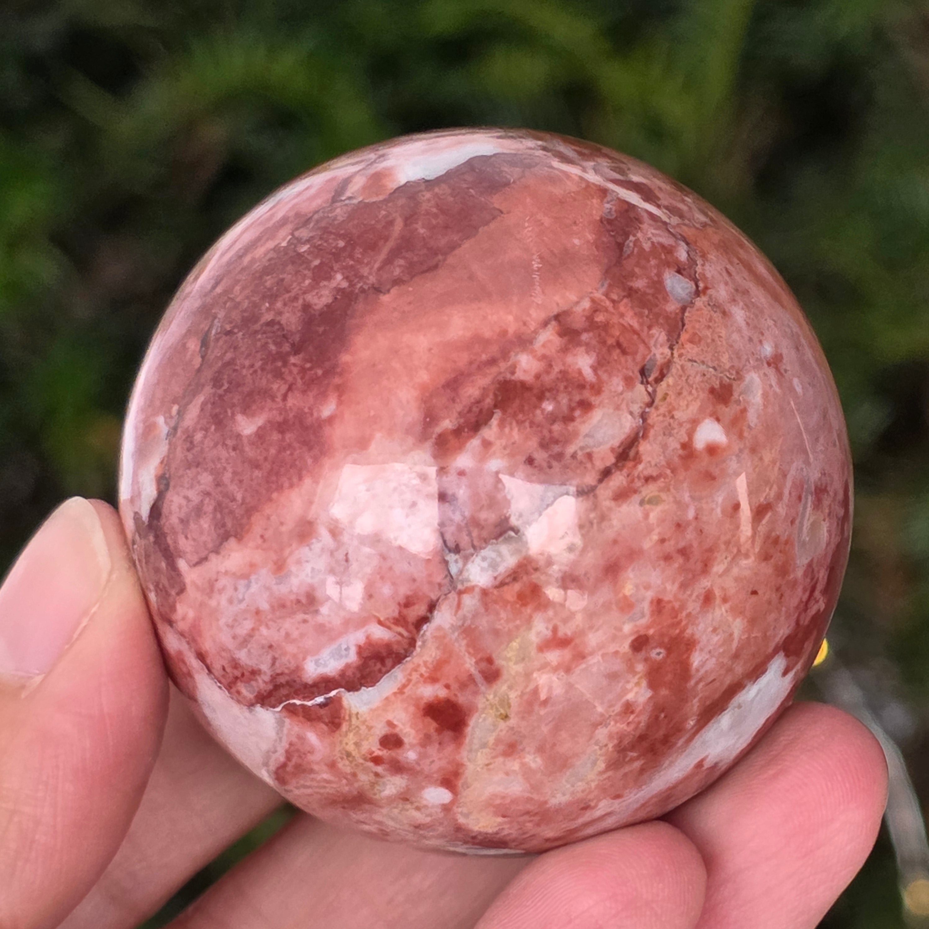 Моделирана от недрата на земята, тази сфера от червен яспис излъчва топла, стабилна и дълбоко закотвена енергия. Камъкът, известен още от древни времена като „камък на жизнеността“, носи цветовете на кръвта и вътрешния огън – символ на жизнената сила, смелостта и упоритостта.