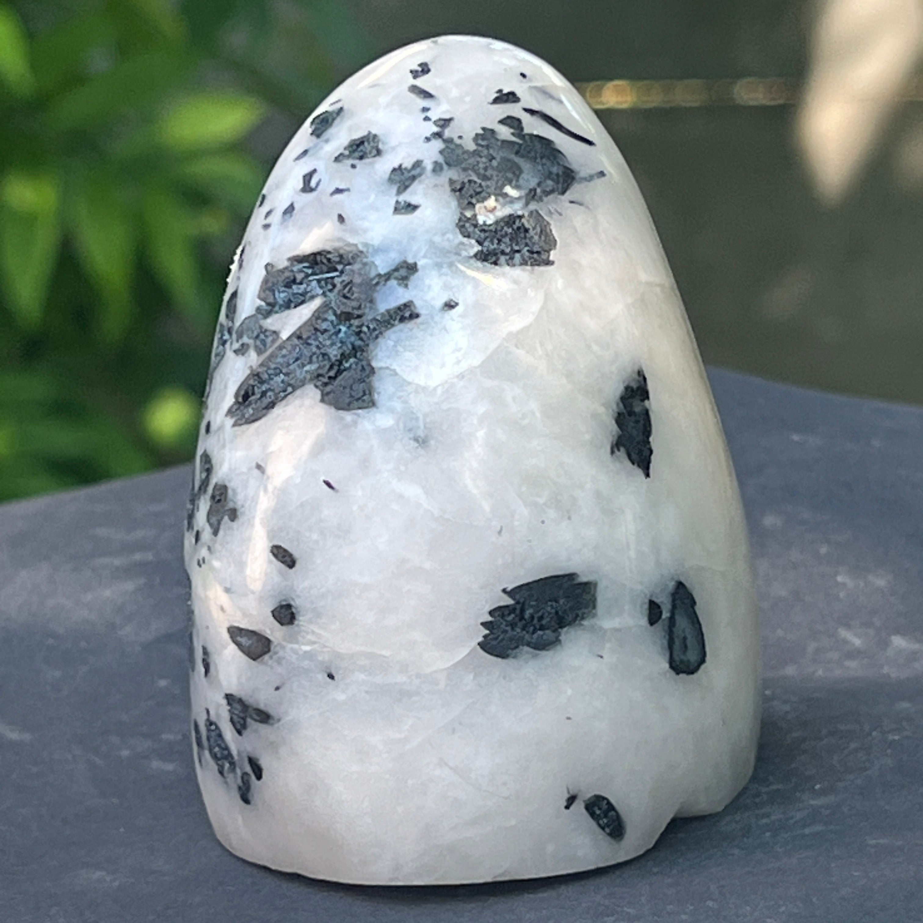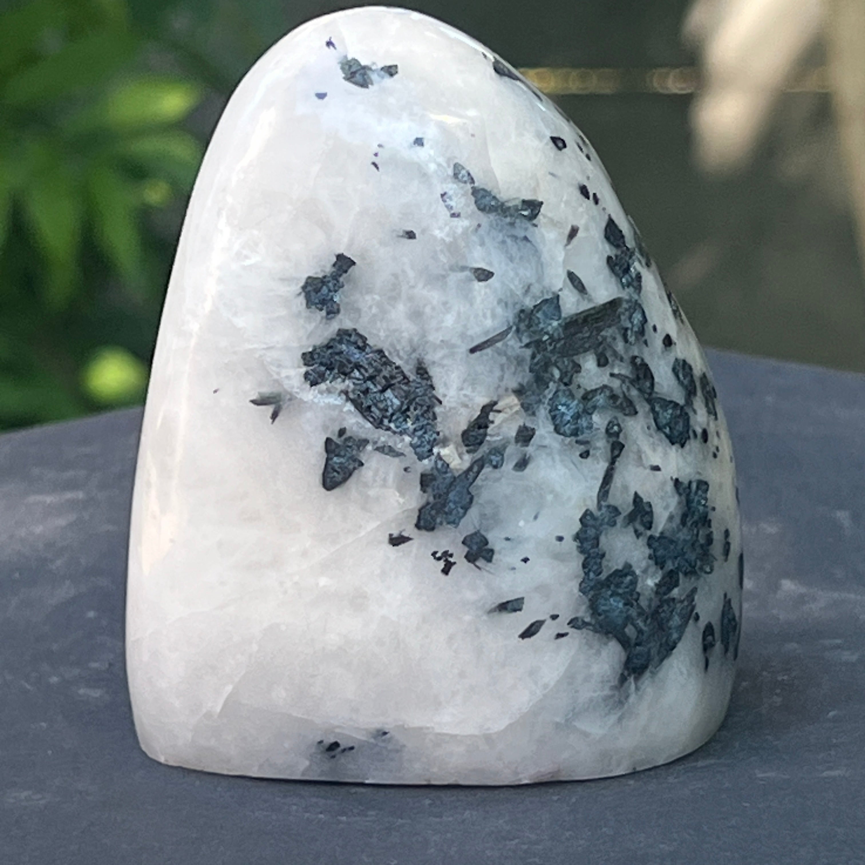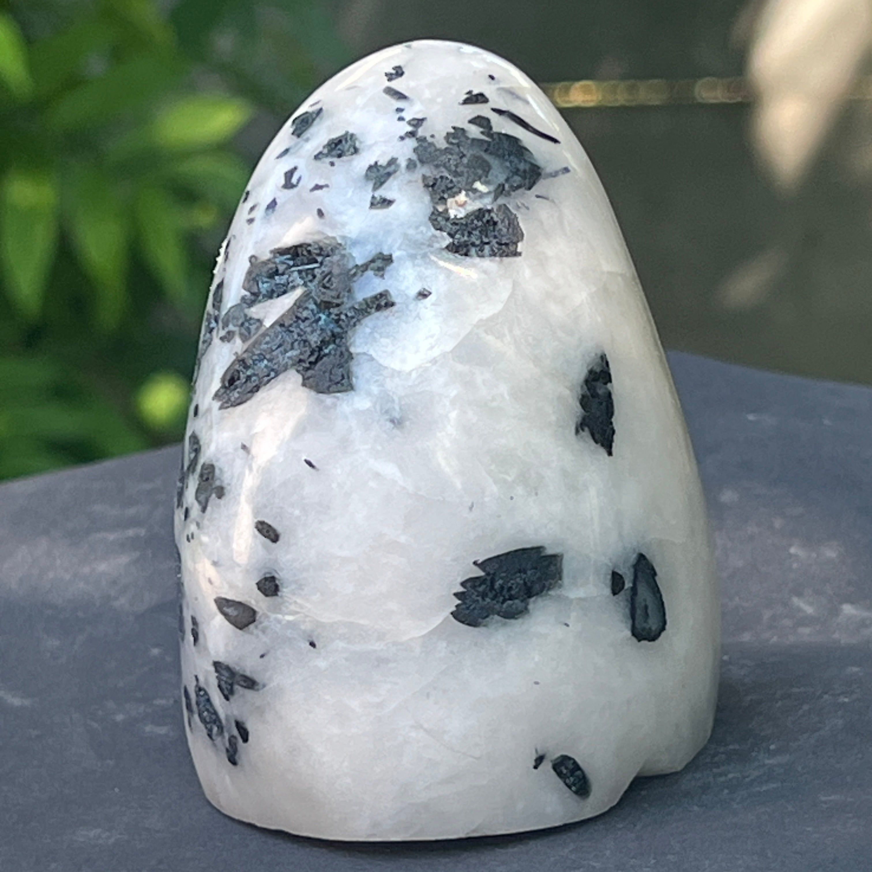 Ревюта – Черна турмалинова скулптура с лунен камък с произволна форма | Модел 1