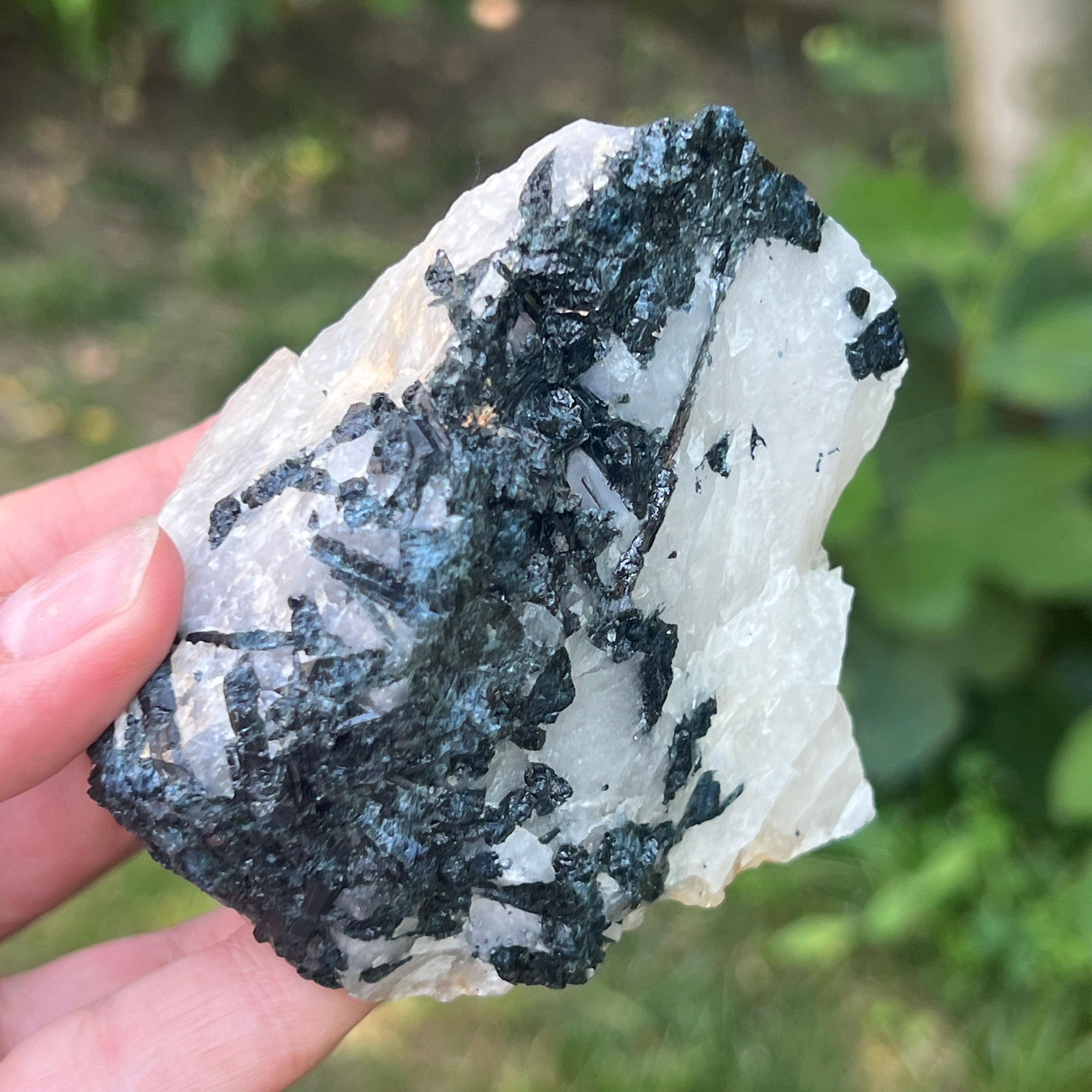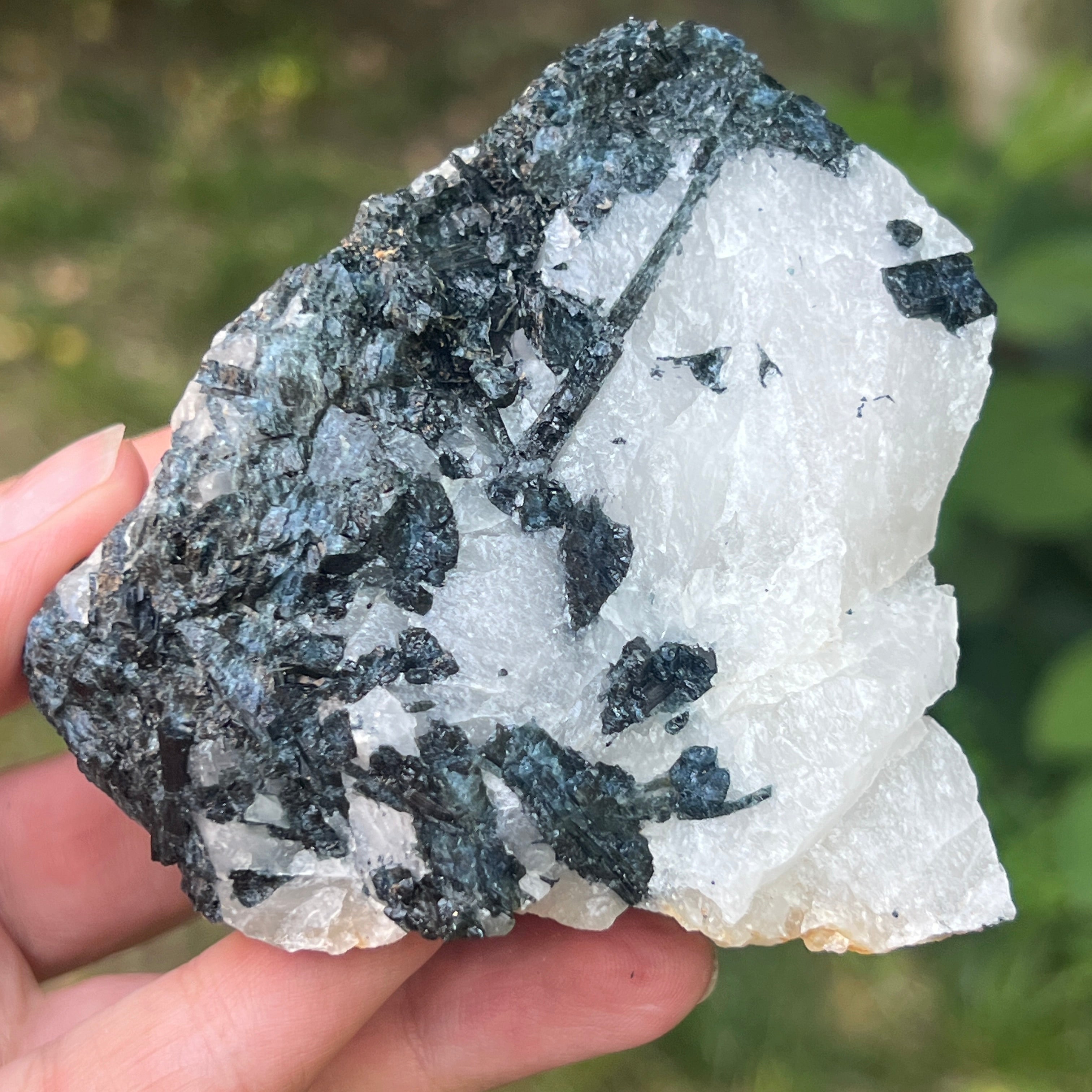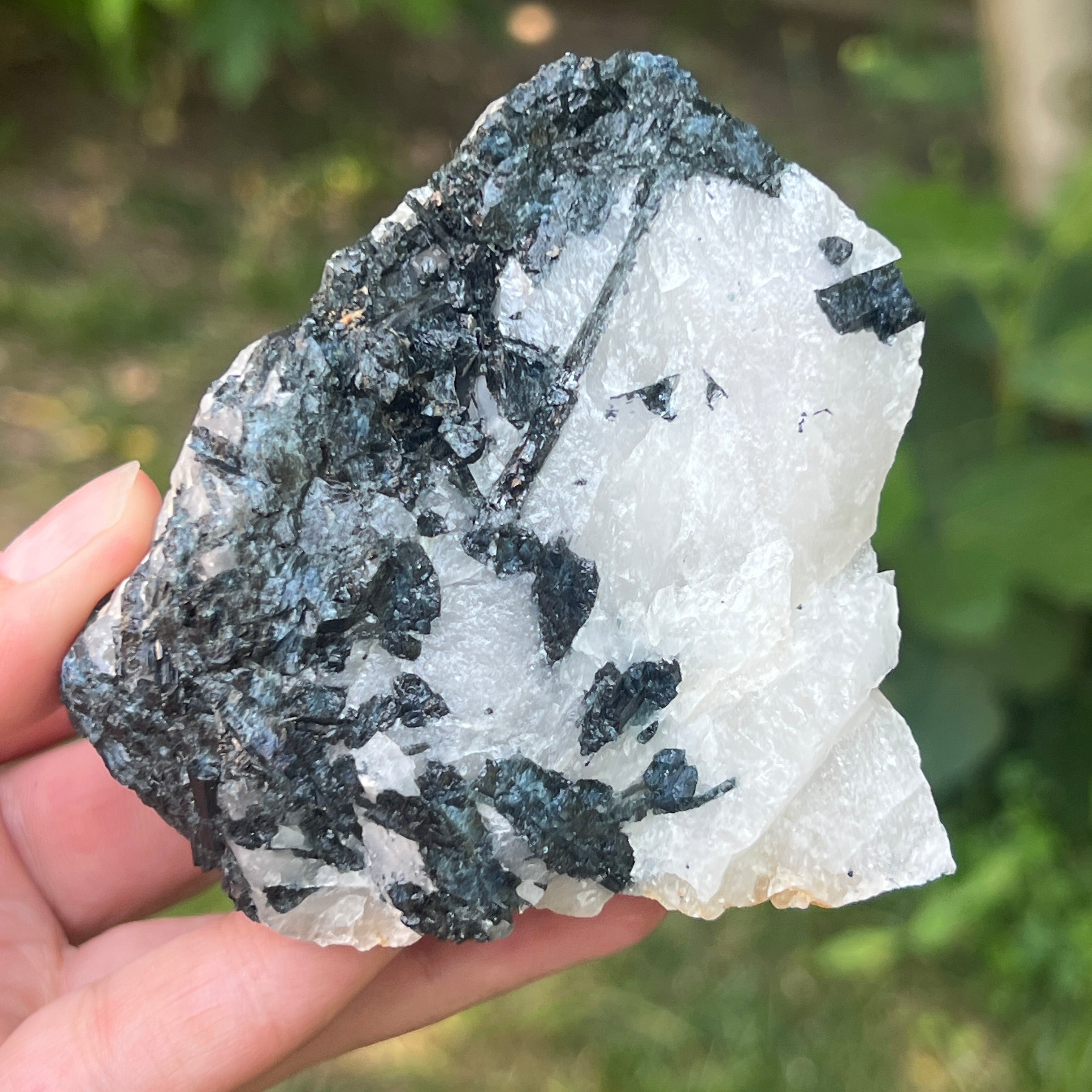 В сърцето на този рядък камък танцуват две противоположни сили в перфектна хармония – черната турмалин с нейната защитна енергия, дълбоко закотвена в земята, и лунният камък с ефирните си вибрации, свързани с цикличността на живота и женските тайни. Заедно те формират изключителна комбинация, почти алхимична, в която тъмнината и светлината не се изключват, а се обгръщат.
