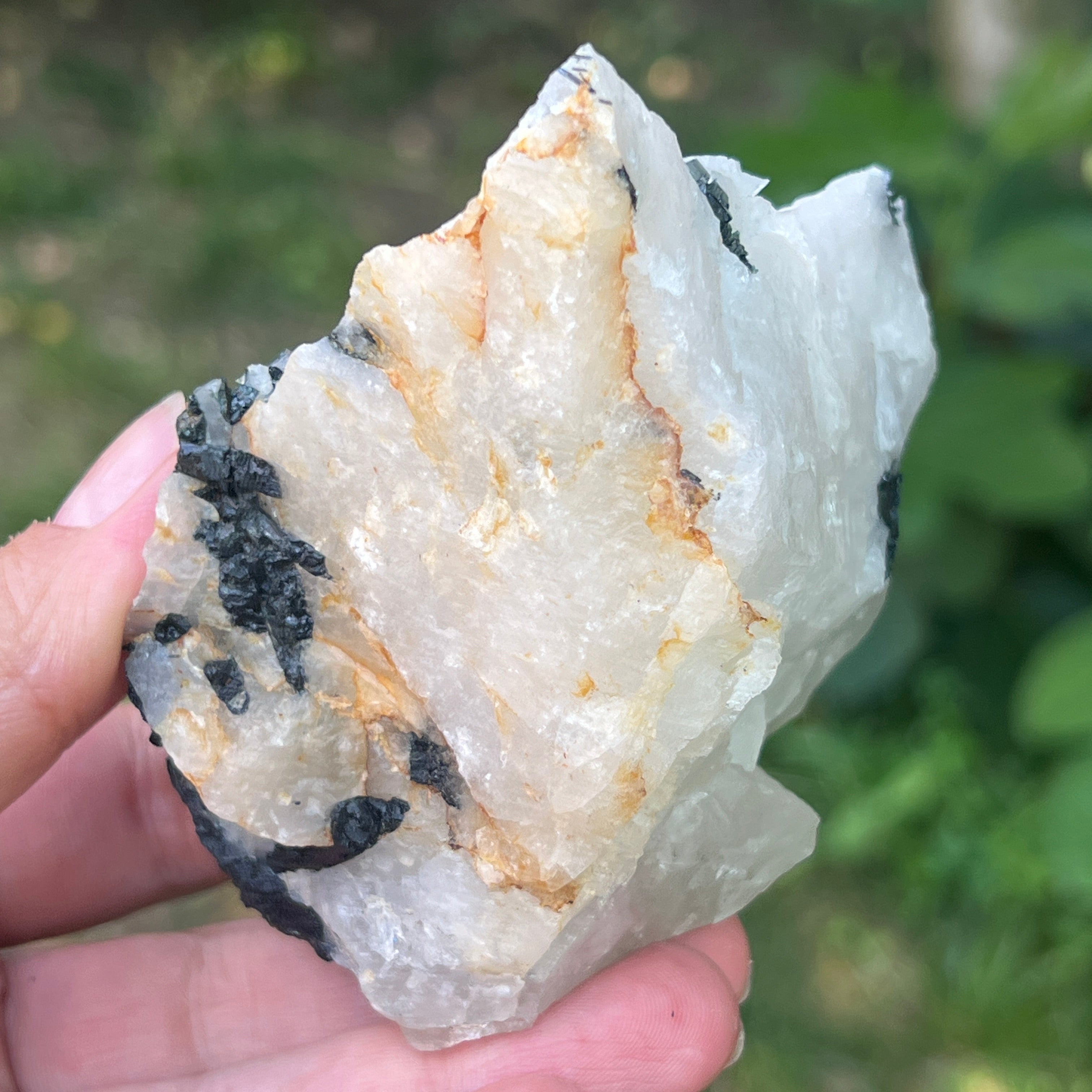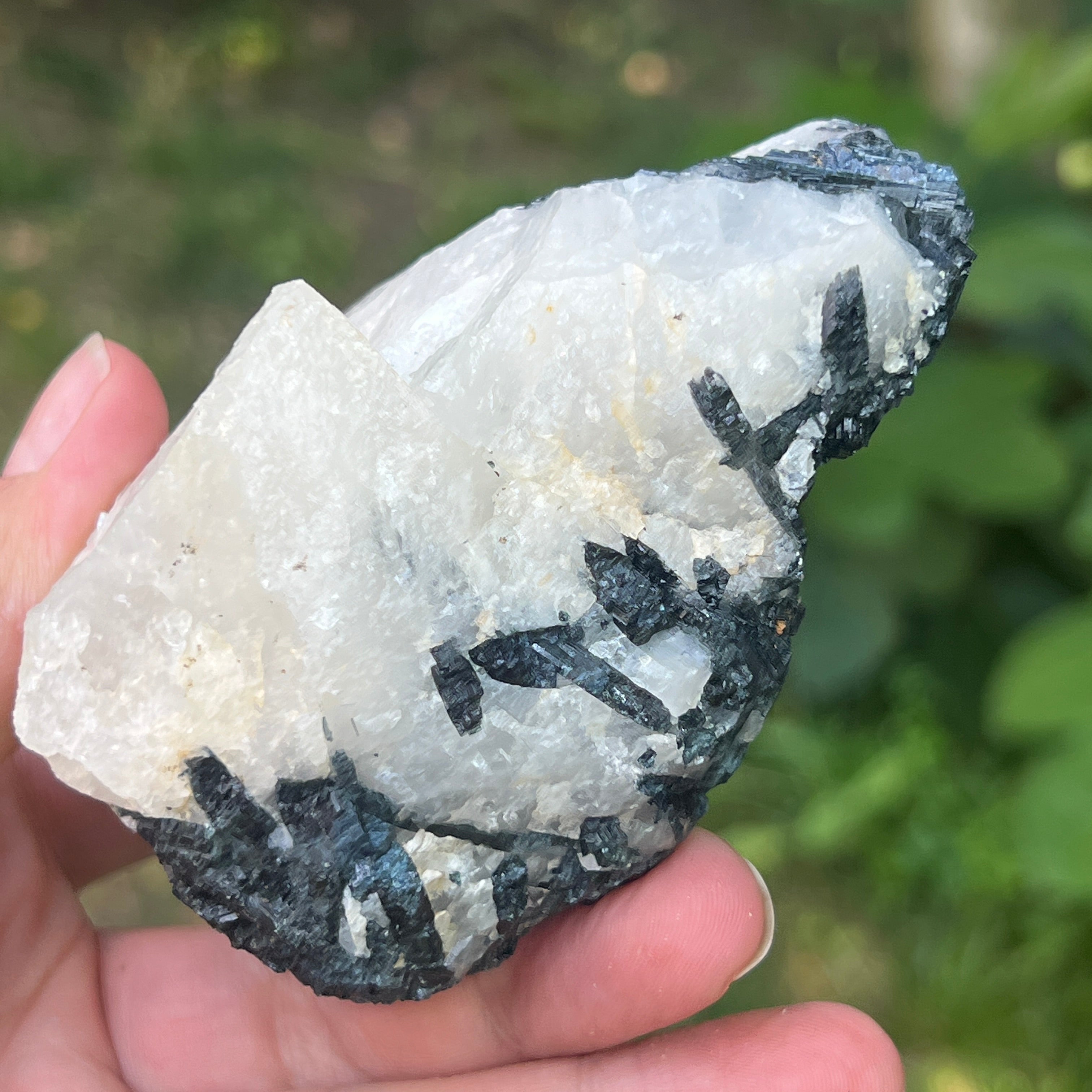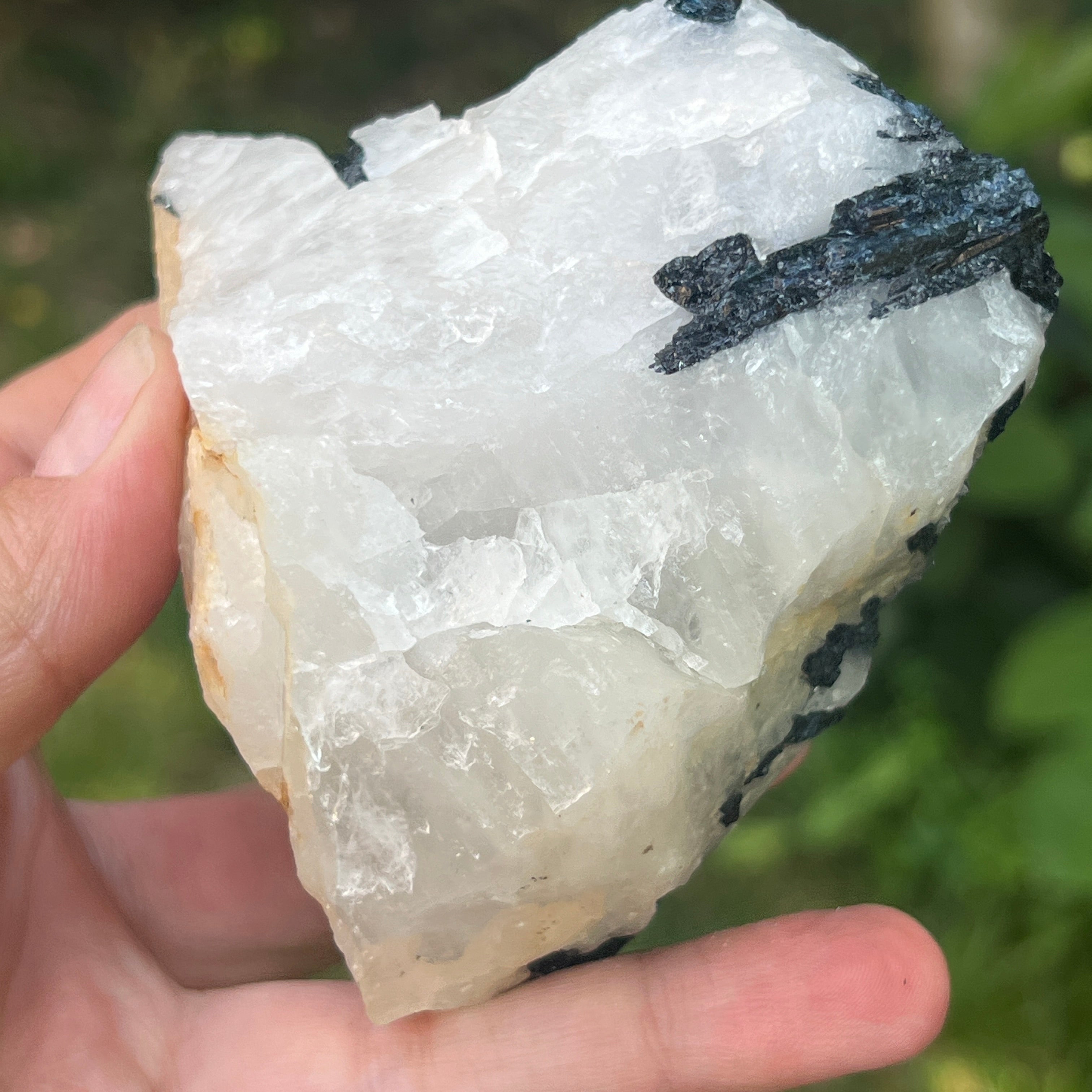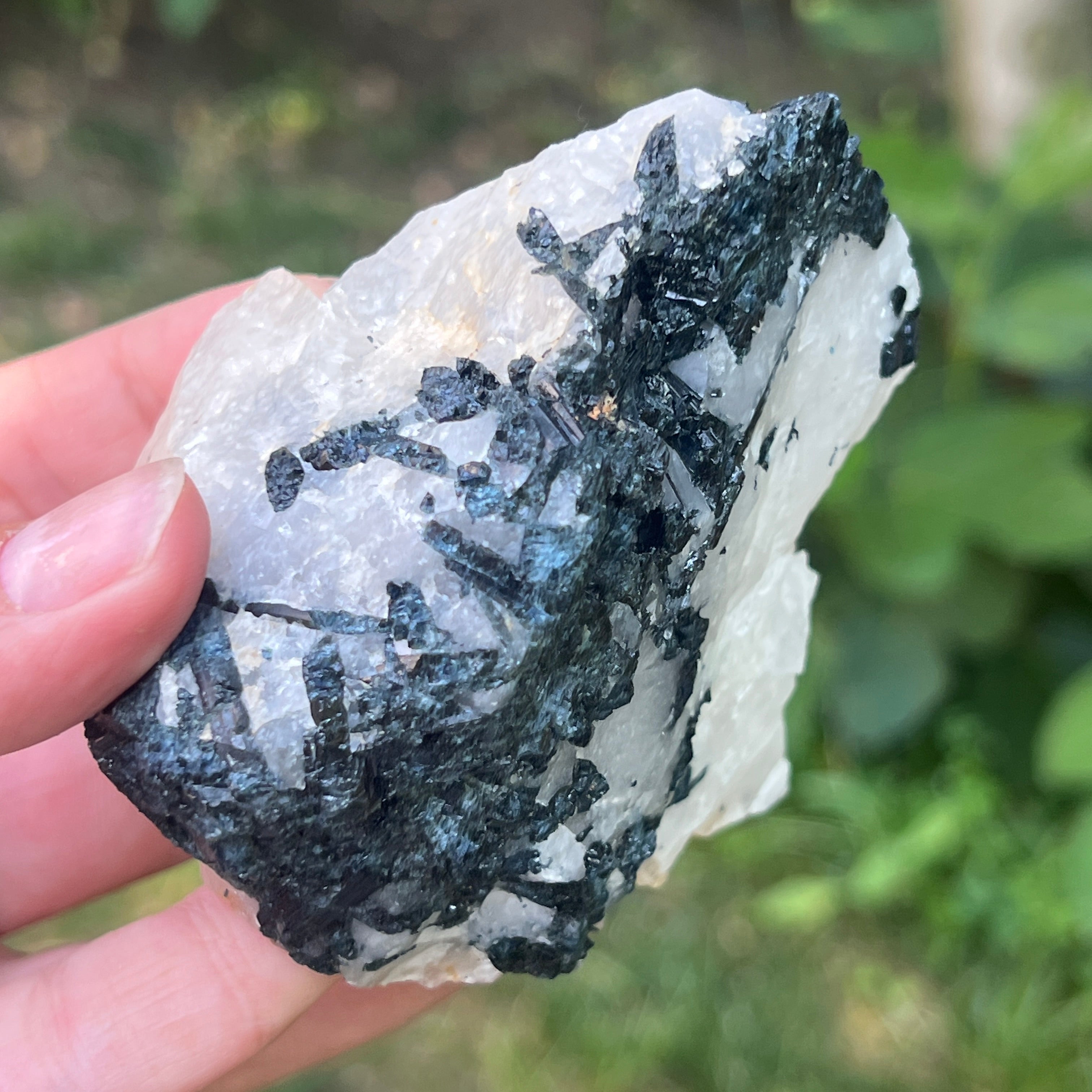 В сърцето на този рядък камък танцуват две противоположни сили в перфектна хармония – черната турмалин с нейната защитна енергия, дълбоко закотвена в земята, и лунният камък с ефирните си вибрации, свързани с цикличността на живота и женските тайни. Заедно те формират изключителна комбинация, почти алхимична, в която тъмнината и светлината не се изключват, а се обгръщат.