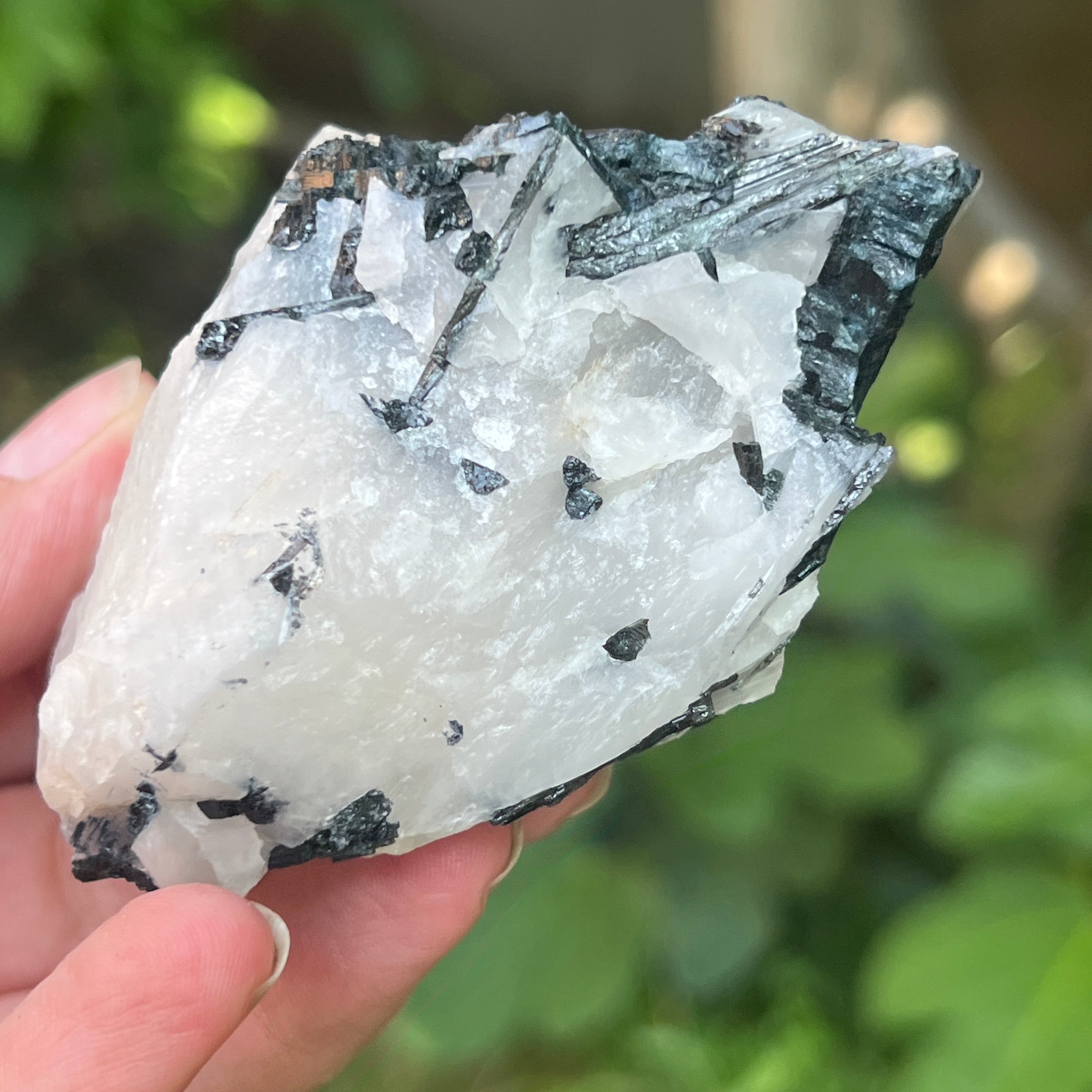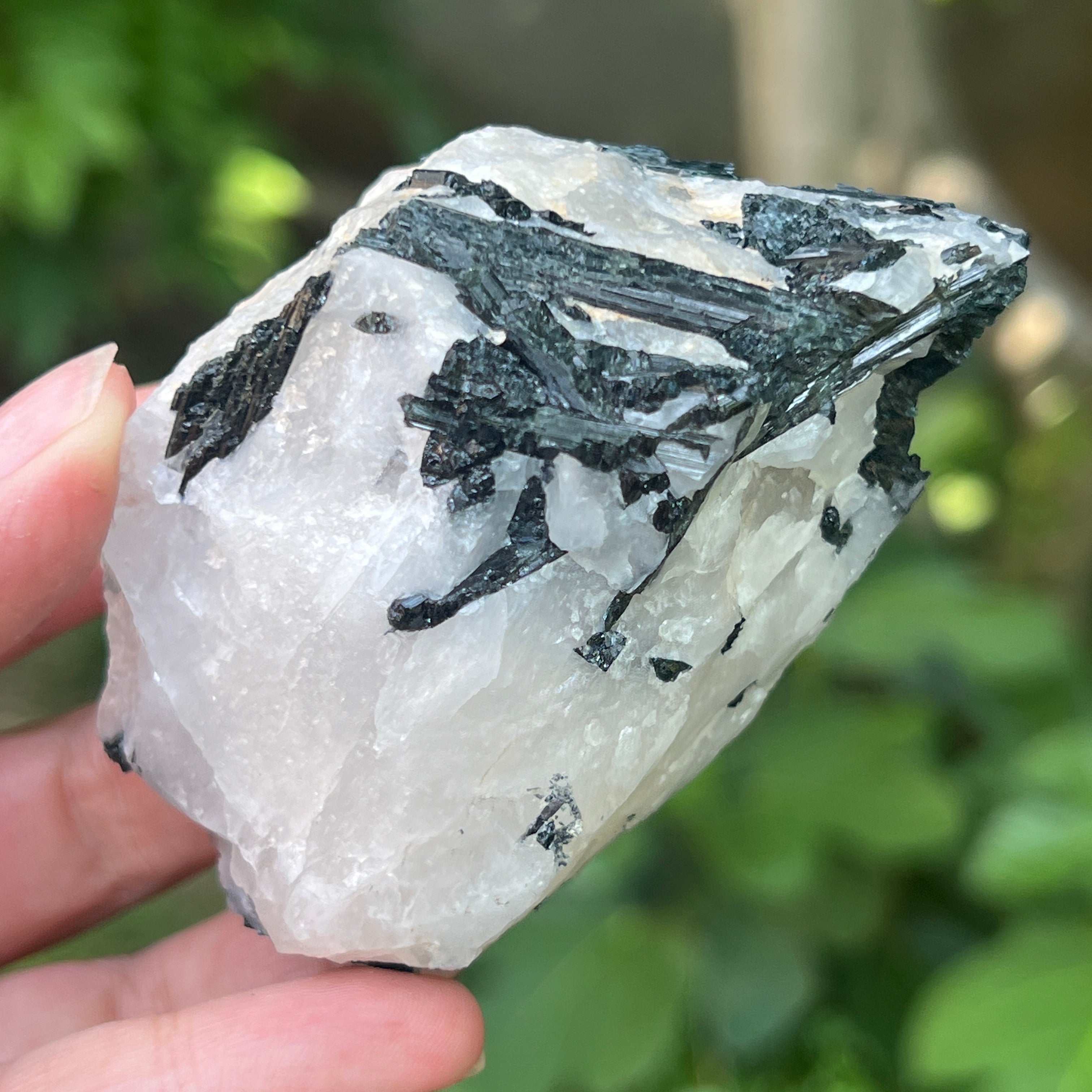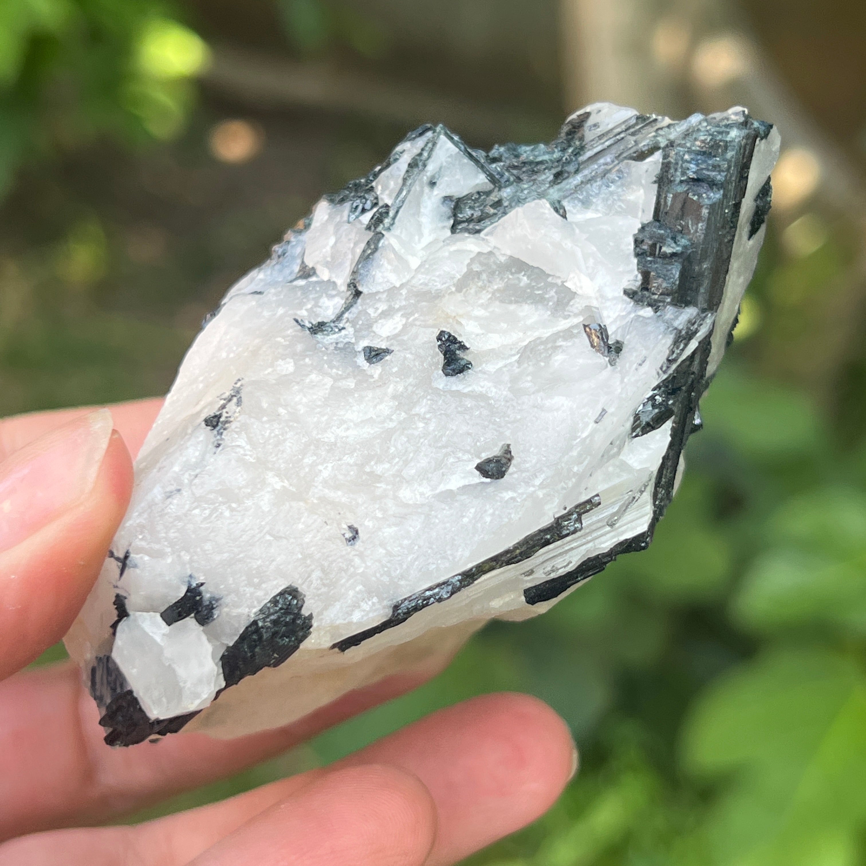 В сърцето на този рядък камък танцуват две противоположни сили в перфектна хармония – черната турмалин с нейната защитна енергия, дълбоко свързана със земята, и лунният камък с етеричните си вибрации, свързани с цикличността на живота и женските тайни. Заедно те формират напълно специална, почти алхимична комбинация, в която тъмнината и светлината не се изключват, а се прегръщат.