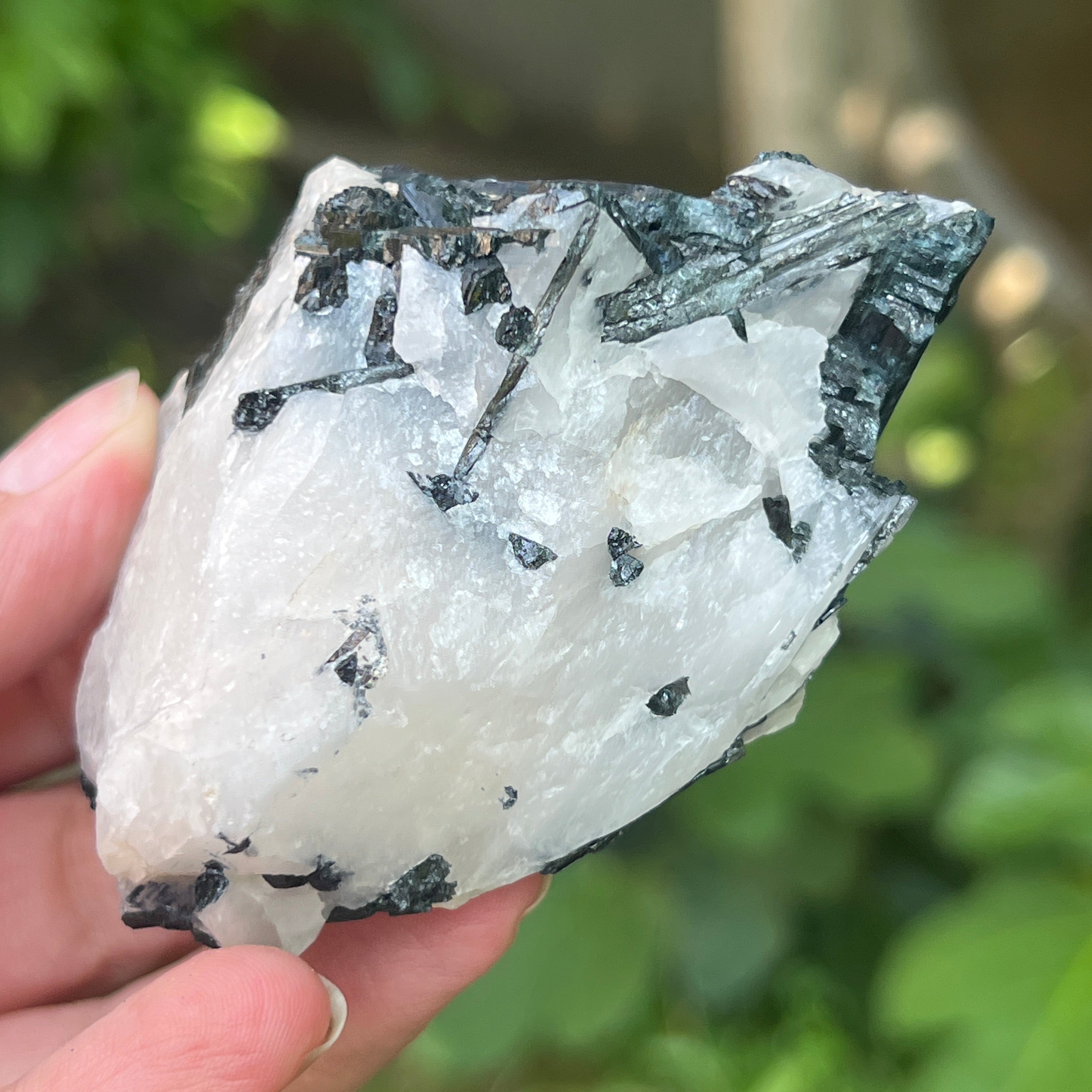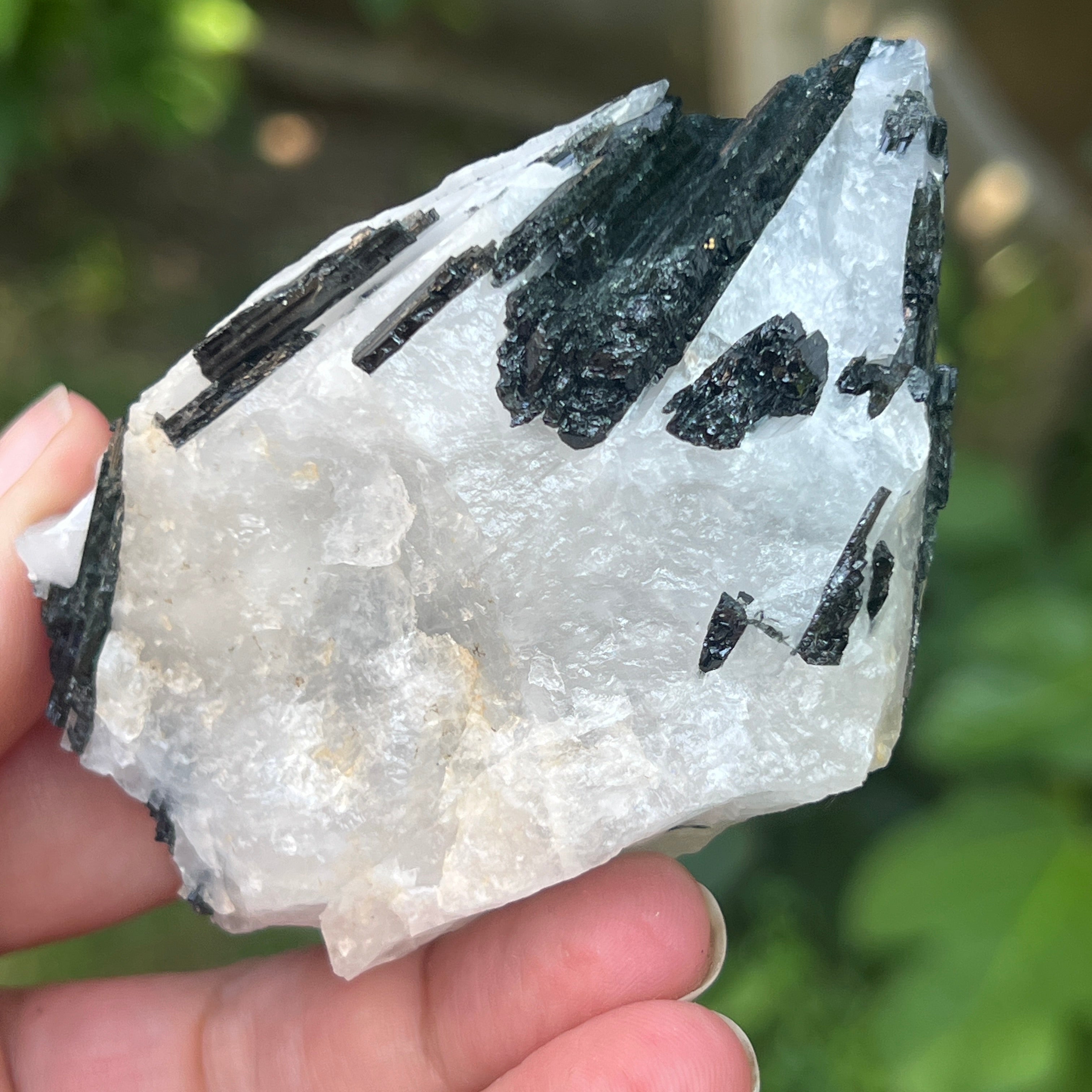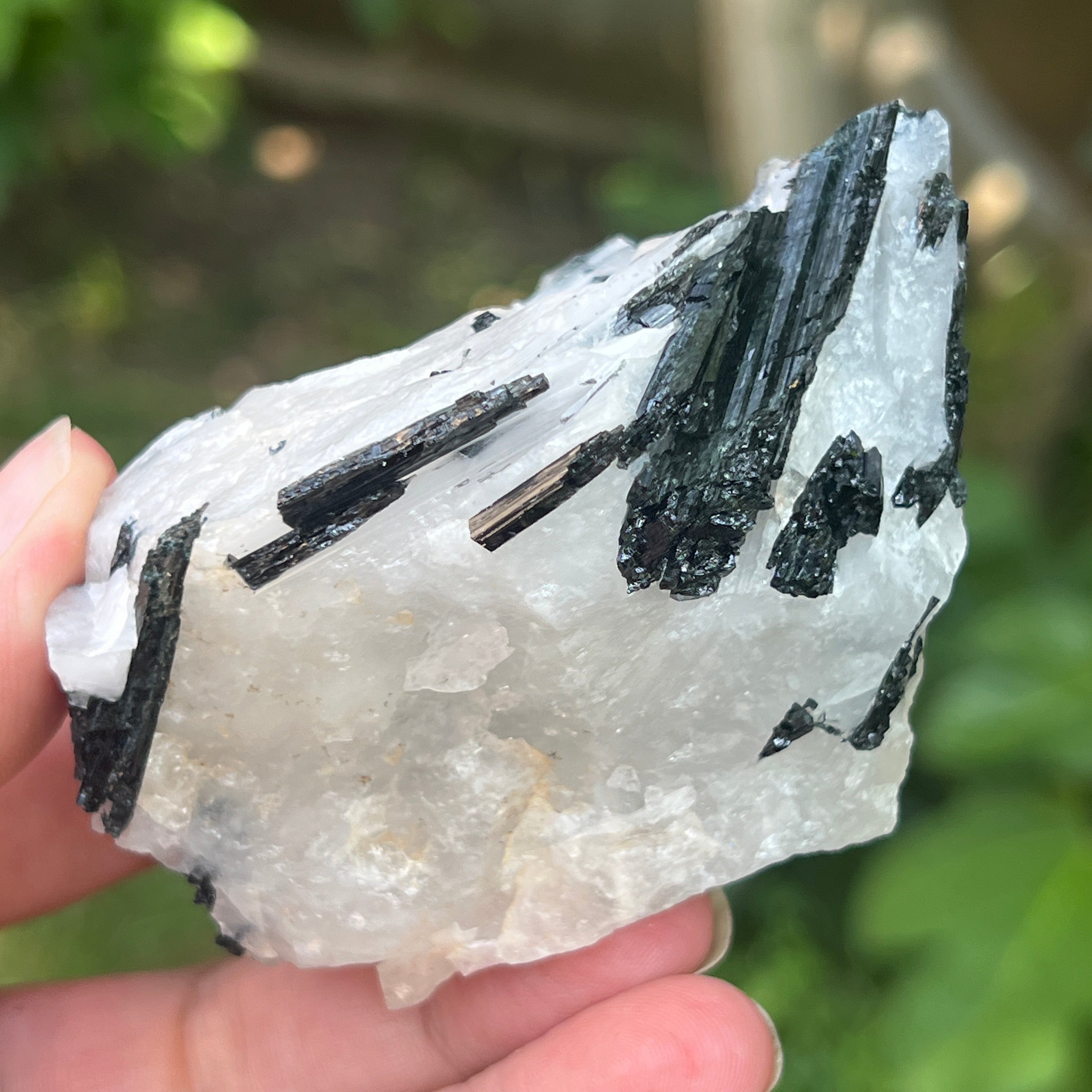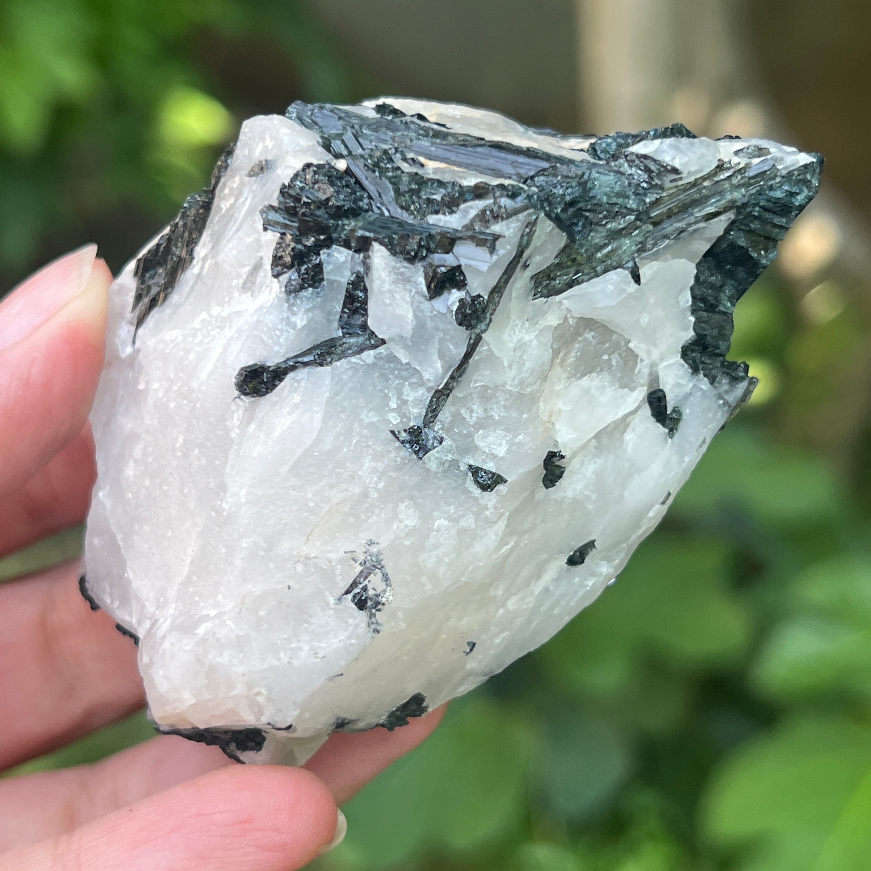 В сърцето на този рядък камък танцуват две противоположни сили в перфектна хармония – черната турмалин с нейната защитна енергия, дълбоко свързана със земята, и лунният камък с етеричните си вибрации, свързани с цикличността на живота и женските тайни. Заедно те формират напълно специална, почти алхимична комбинация, в която тъмнината и светлината не се изключват, а се прегръщат.