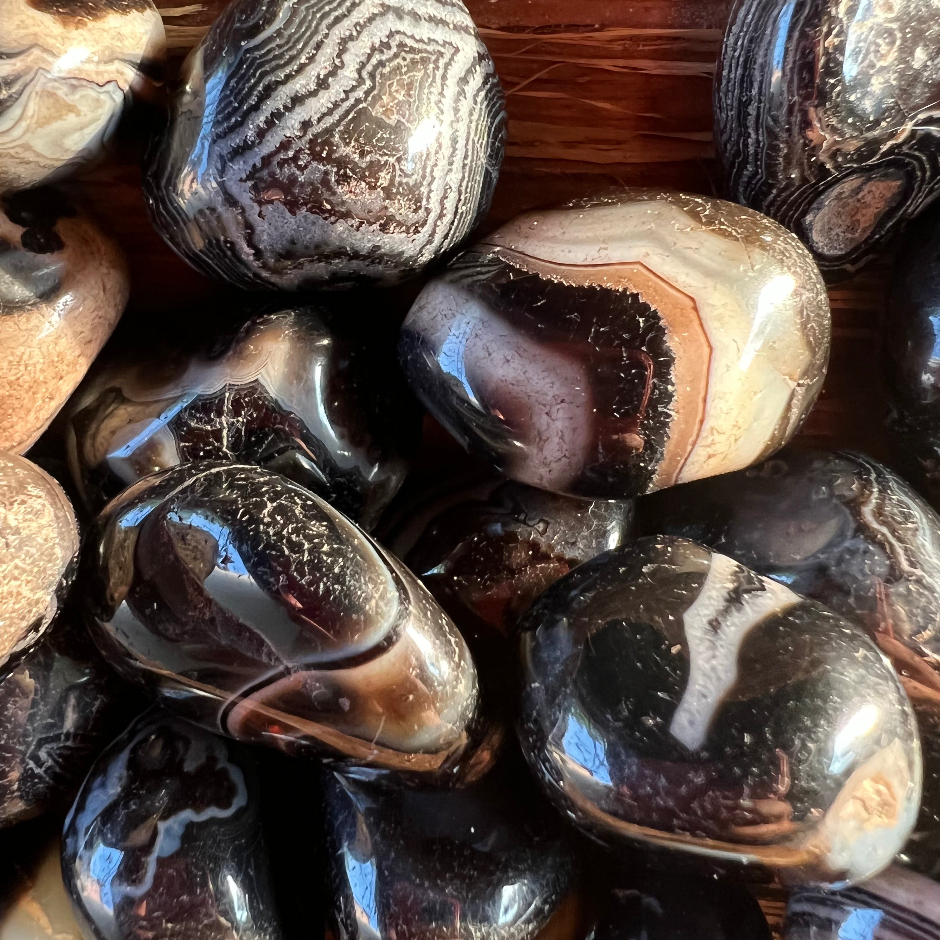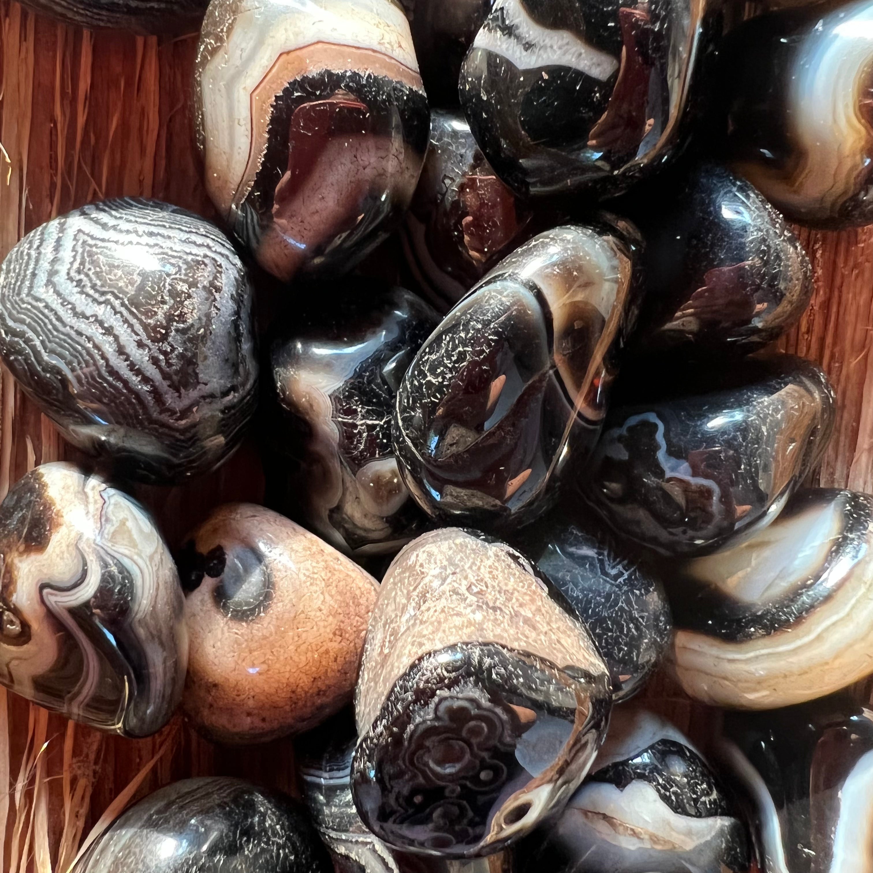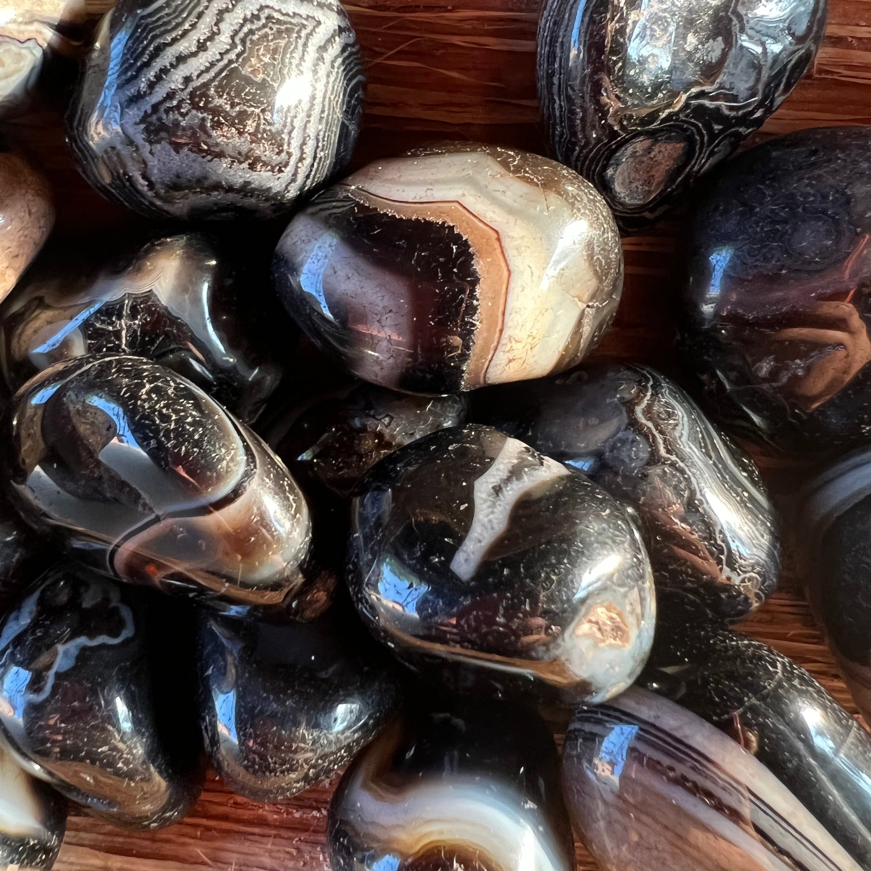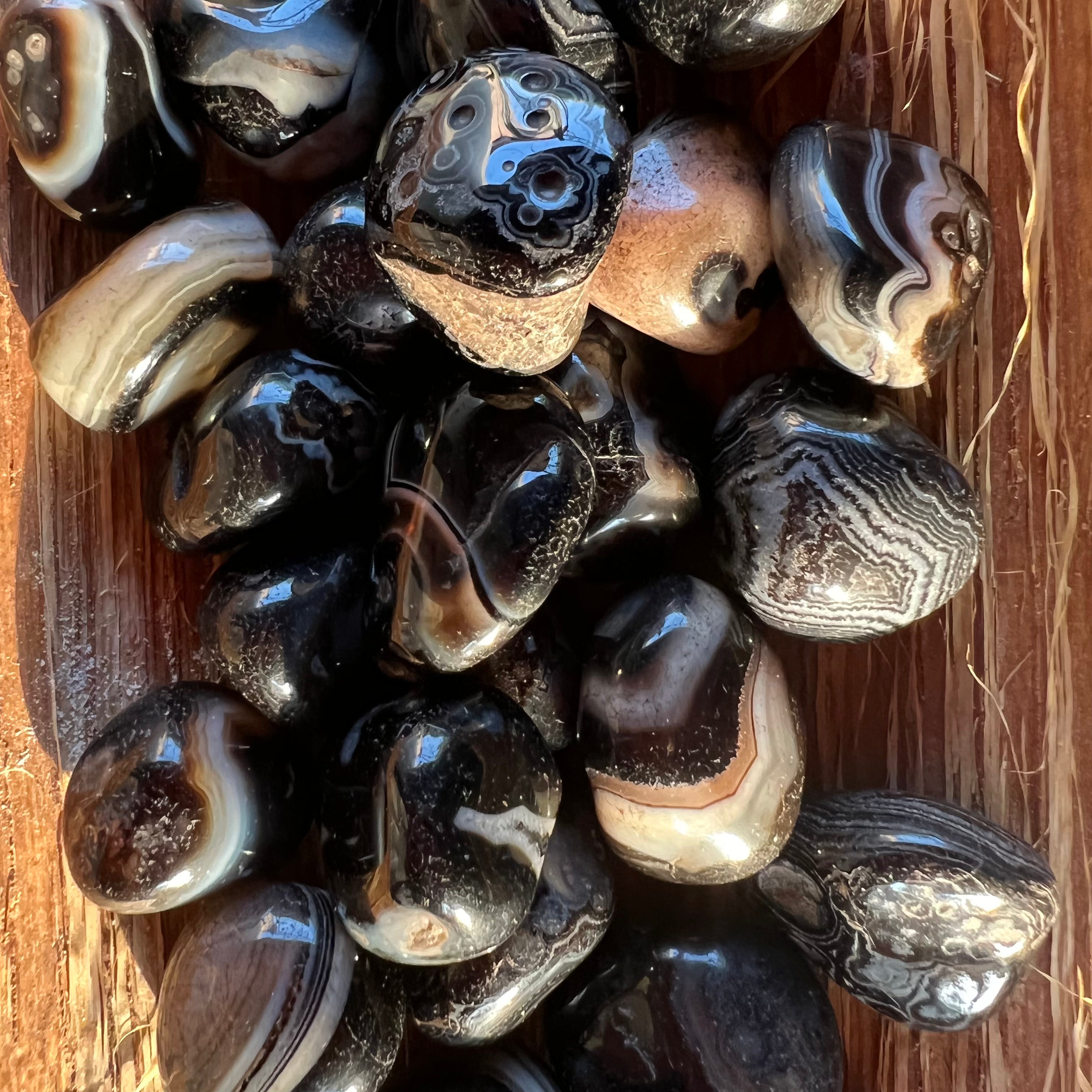 Черният райски ахат е свързан с коренната чакра (чакра 1), която е центърът на нашата базова енергия, свързан със стабилността, сигурността и връзката със земята. Смята се, че черният райски ахат има защитни и заземяващи ефекти, помагайки за създаване на стабилна основа и постигане на емоционален баланс.
