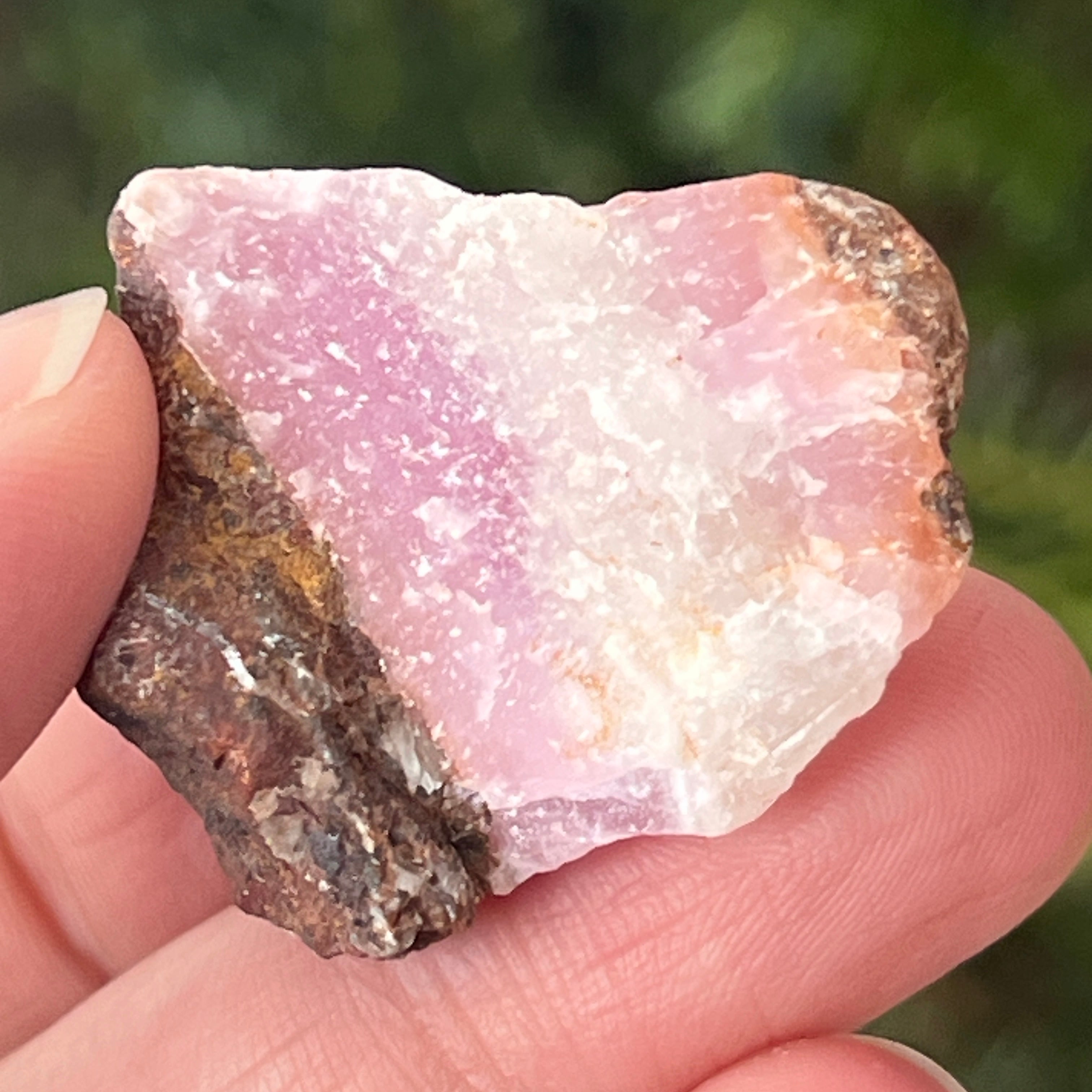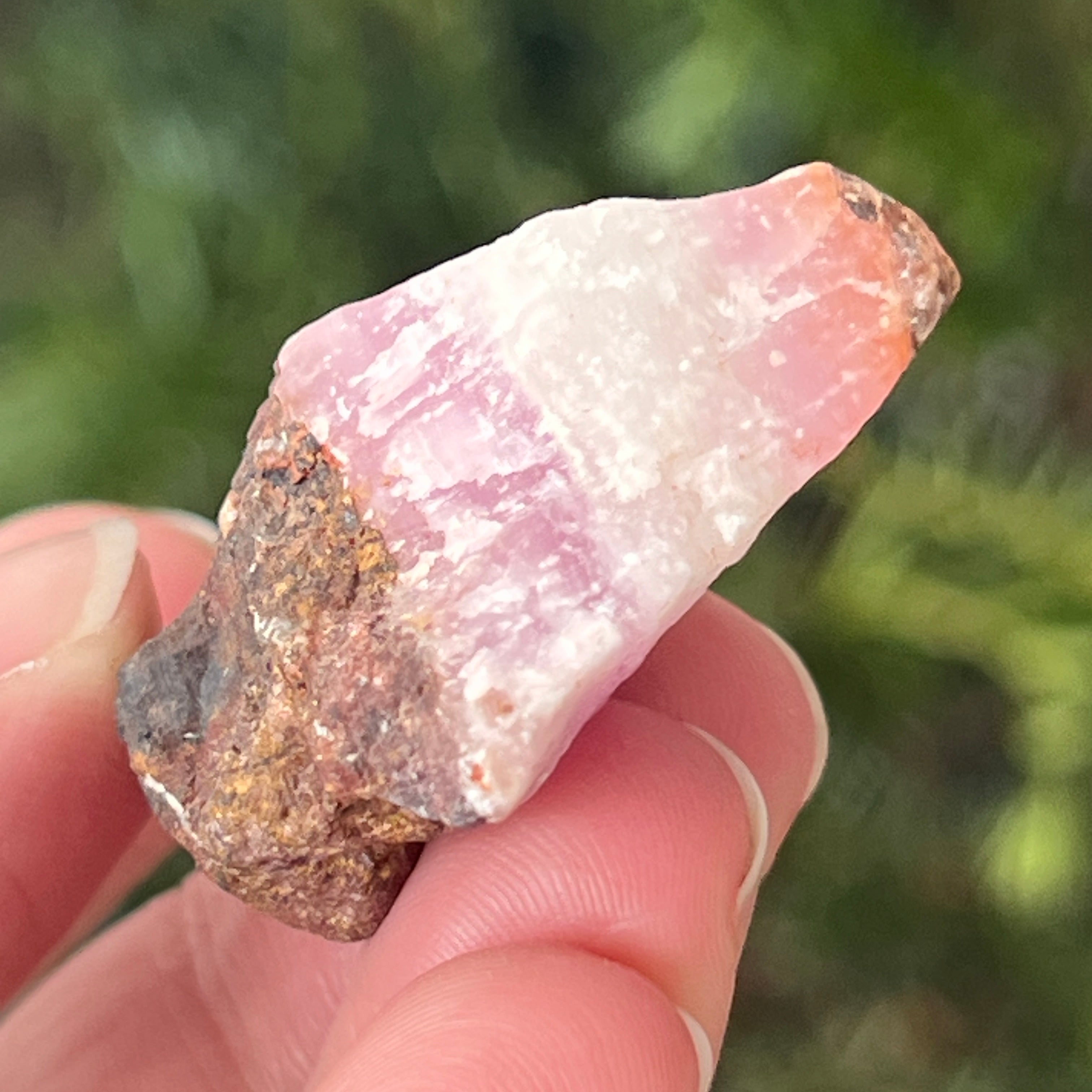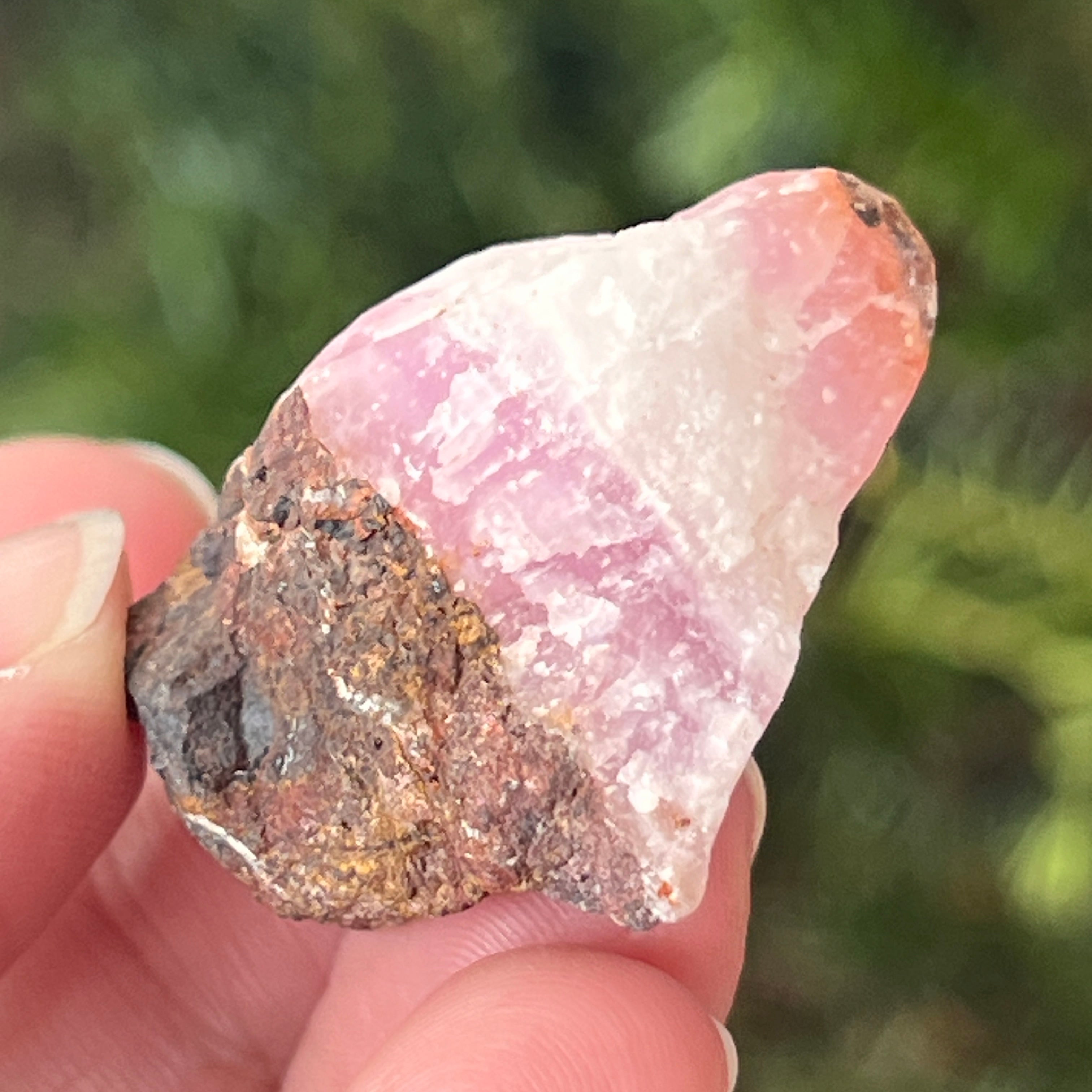 Розовият арагонит е рядък полускъпоценен камък. Състои се от калциев карбонат и има розово-оранжев цвят поради примеси на желязо.