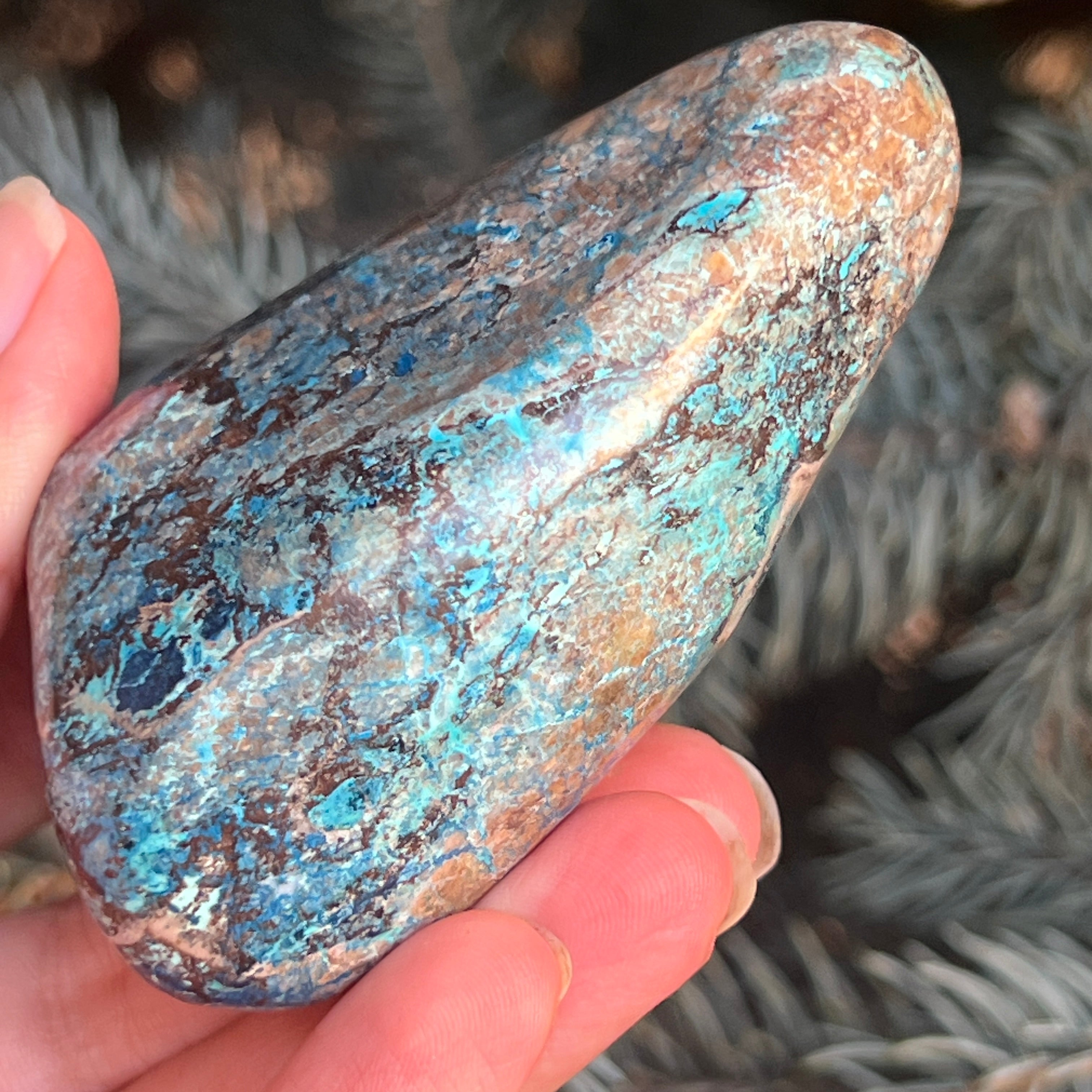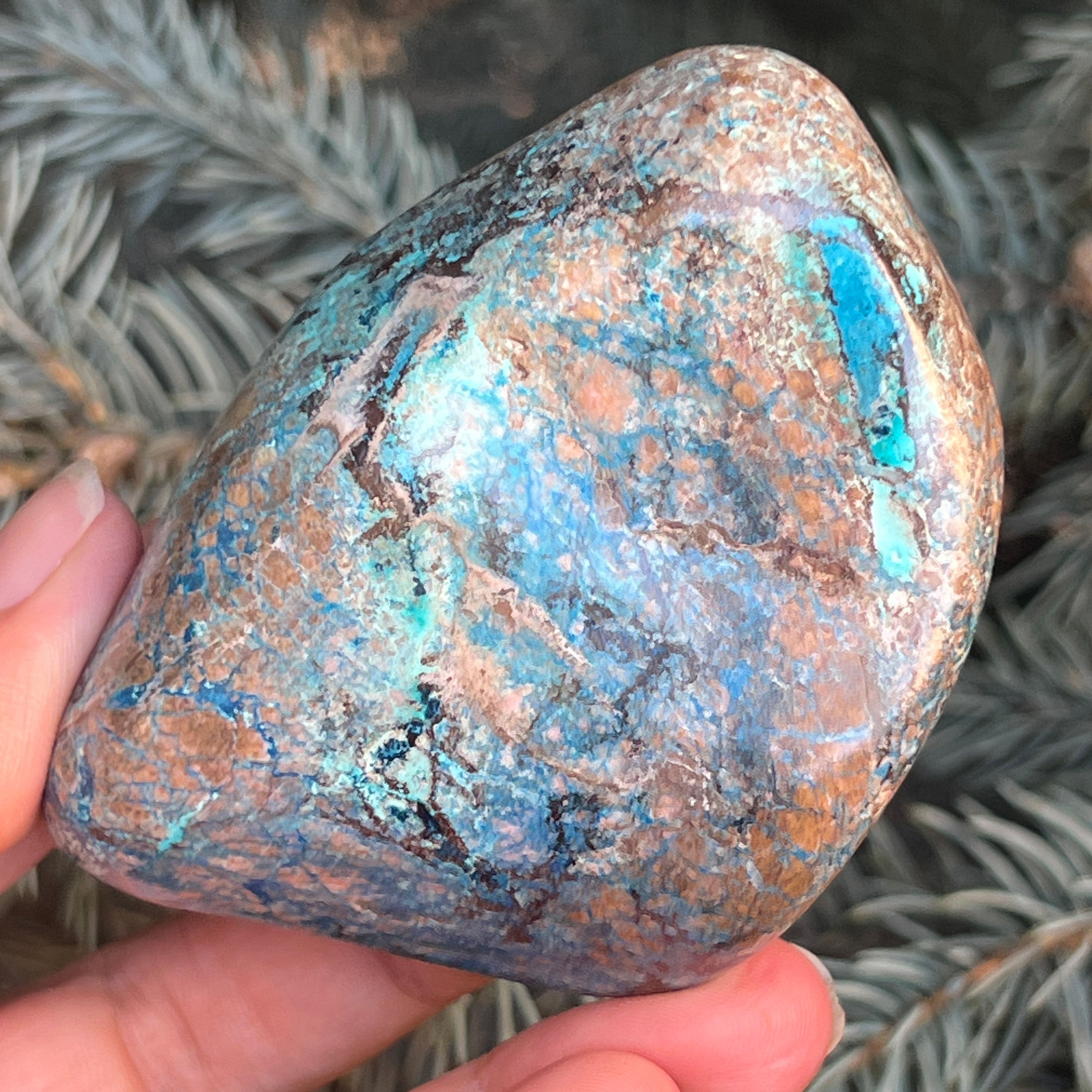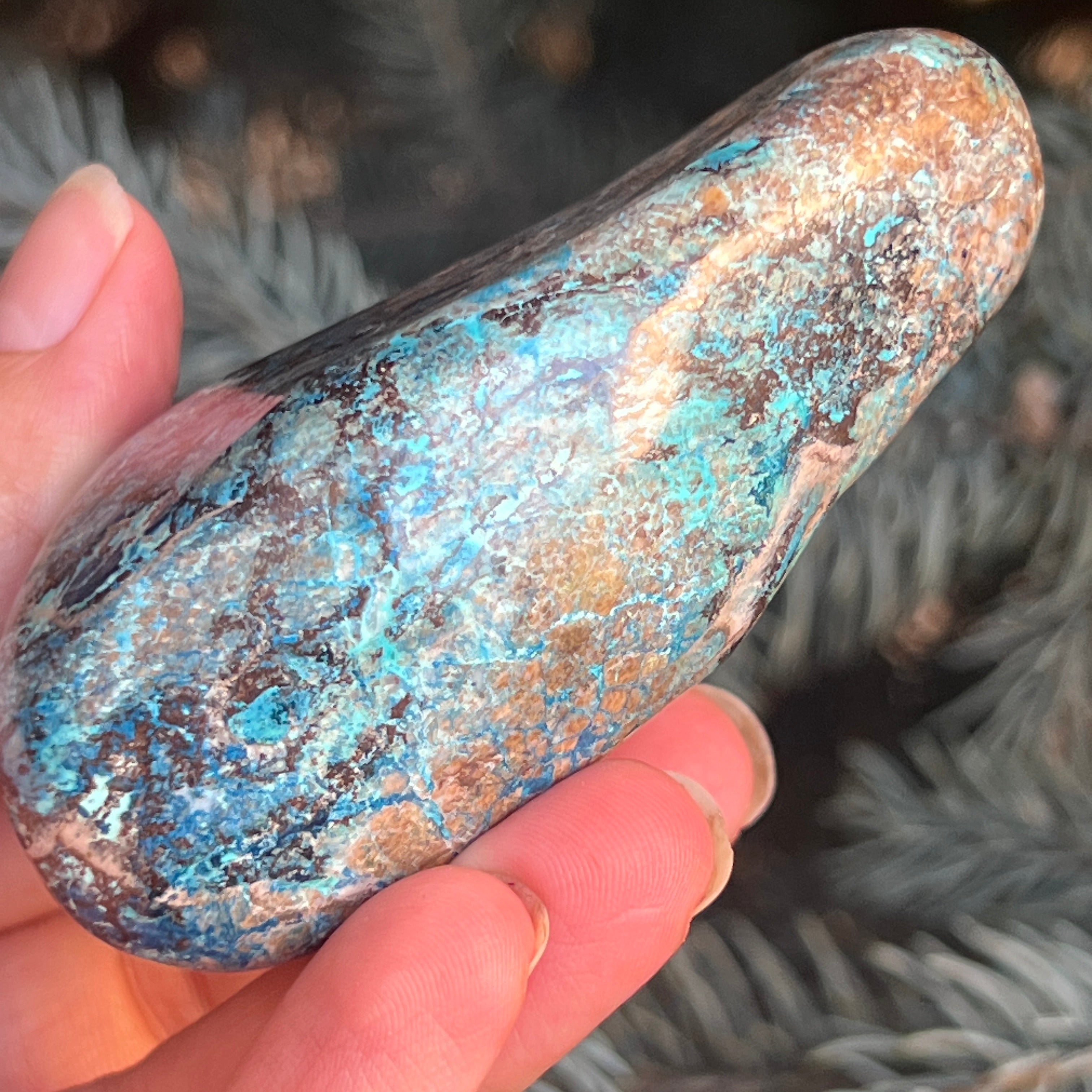 Шатъкитът е рядък меден минерал, известен с интензивните си оттенъци на синьо, тюркоазено и зелено. Тези завладяващи цветове произлизат от присъствието на йони на мед (Cu²⁺), които придават на минерала живи и наситени отражения. Зеленото често се появява в комбинация с малахит или хрисокол, създавайки впечатляващи модели. Има копринен до стъклен блясък и твърдост 3,5 по скалата на Мос. Открит е в мината Шатък в Аризона, но се среща и в Намибия, Конго и други региони, богати на мед.