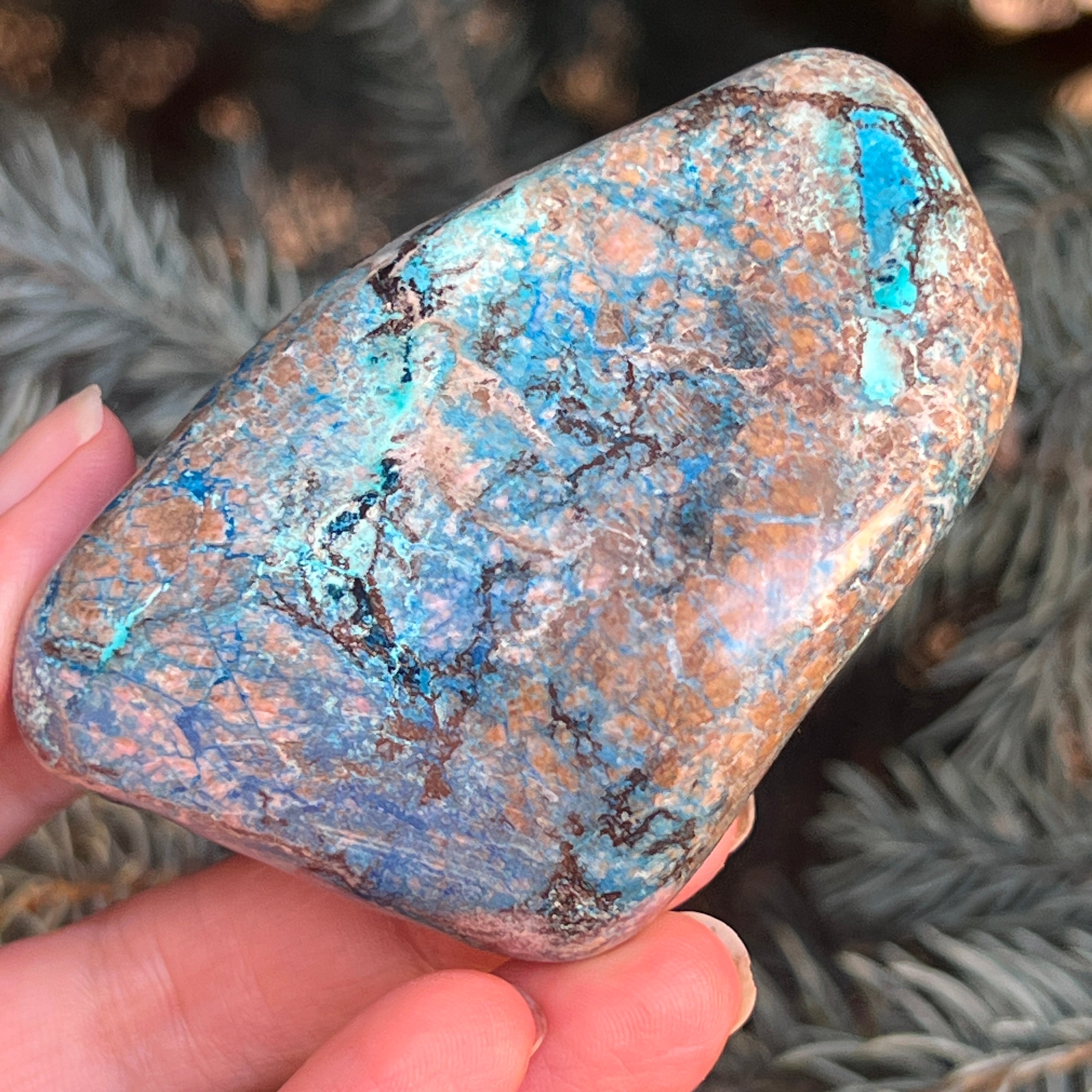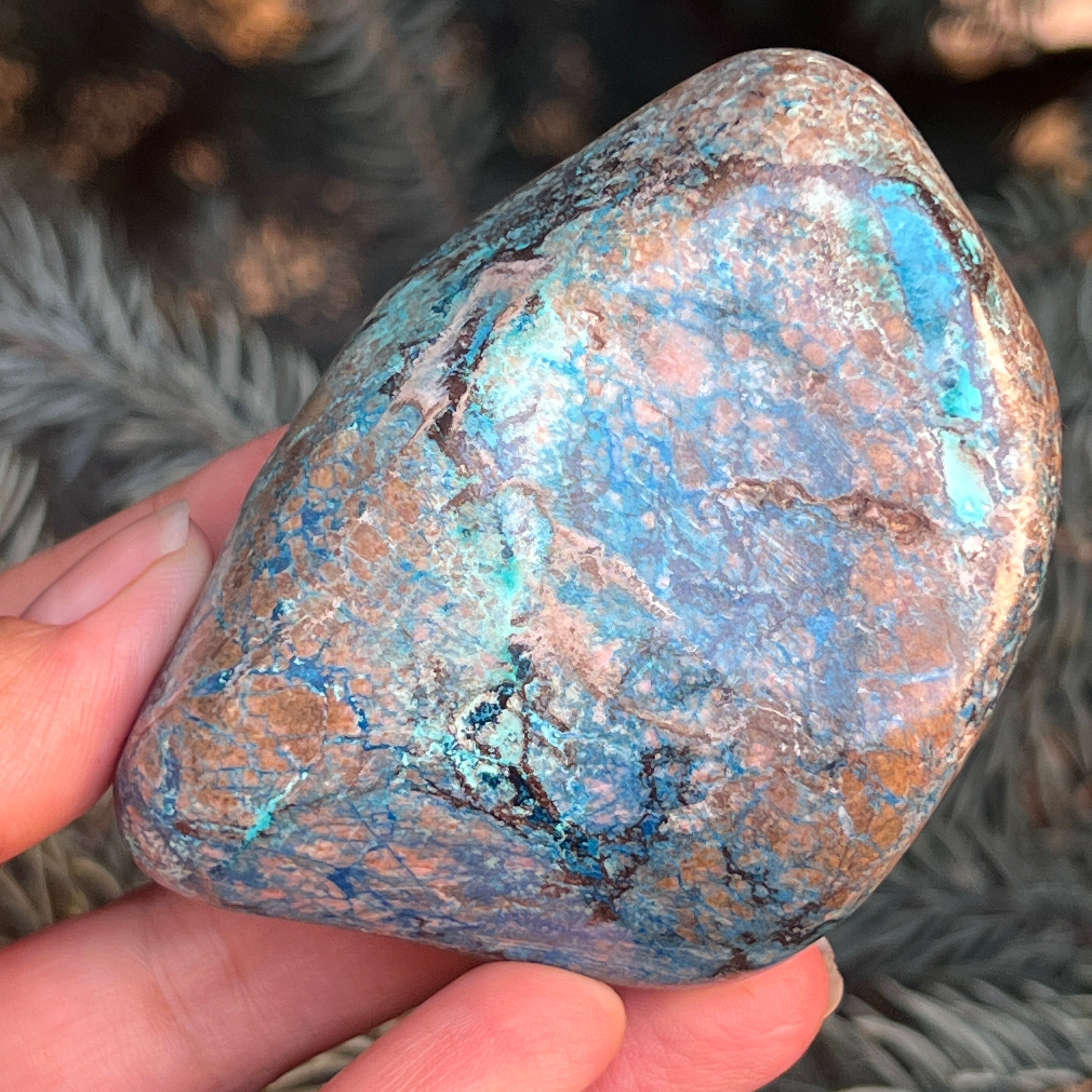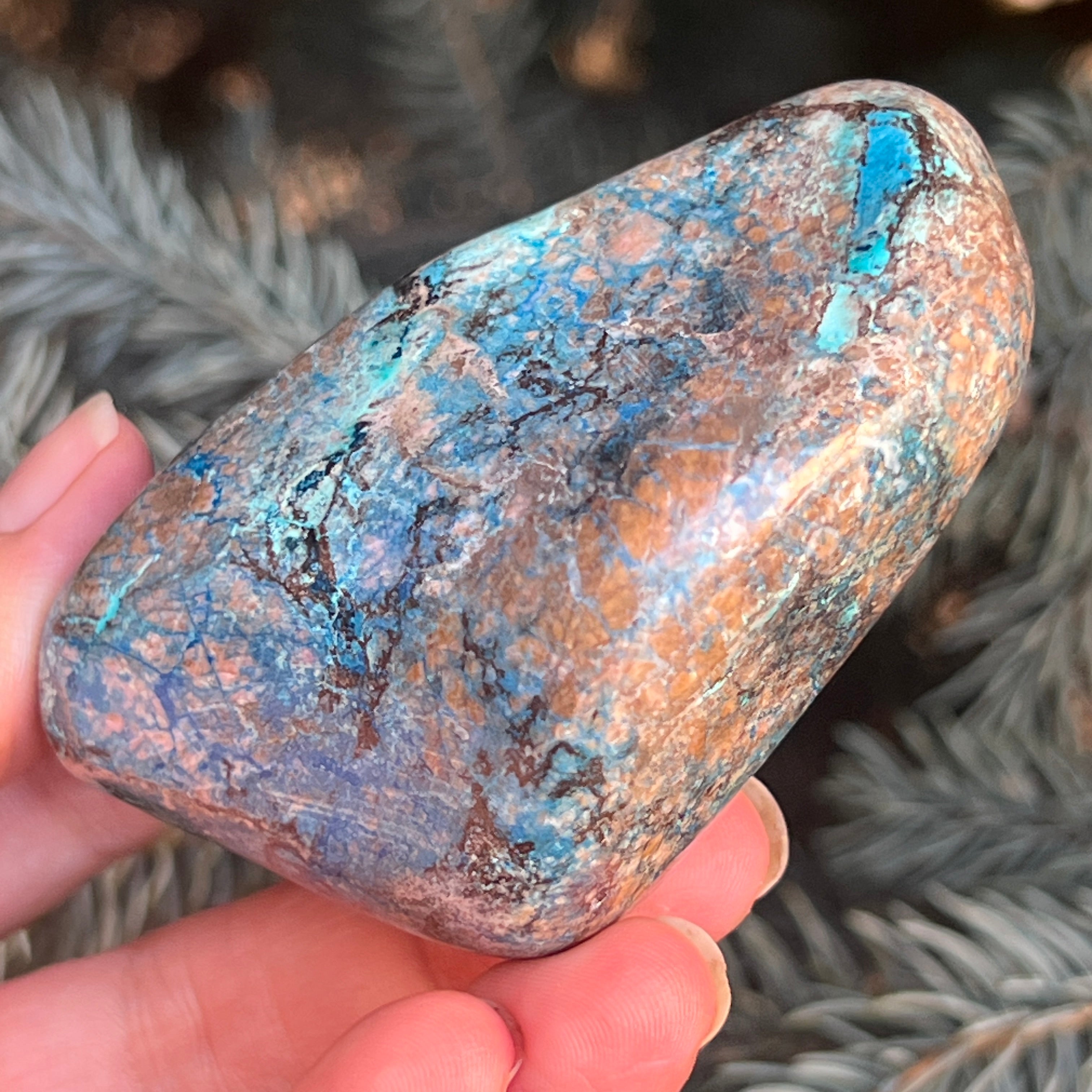 Шатъкитът е рядък меден минерал, известен с интензивните си оттенъци на синьо, тюркоазено и зелено. Тези завладяващи цветове произлизат от присъствието на йони на мед (Cu²⁺), които придават на минерала живи и наситени отражения. Зеленото често се появява в комбинация с малахит или хрисокол, създавайки впечатляващи модели. Има копринен до стъклен блясък и твърдост 3,5 по скалата на Мос. Открит е в мината Шатък в Аризона, но се среща и в Намибия, Конго и други региони, богати на мед.