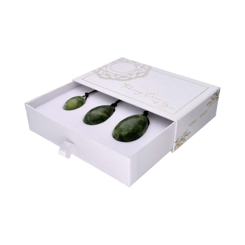 Ревюта – Яйца Йони от зелен жад (с дупка, шнур) - Комплект от 3 броя, опакован в подаръчна кутия