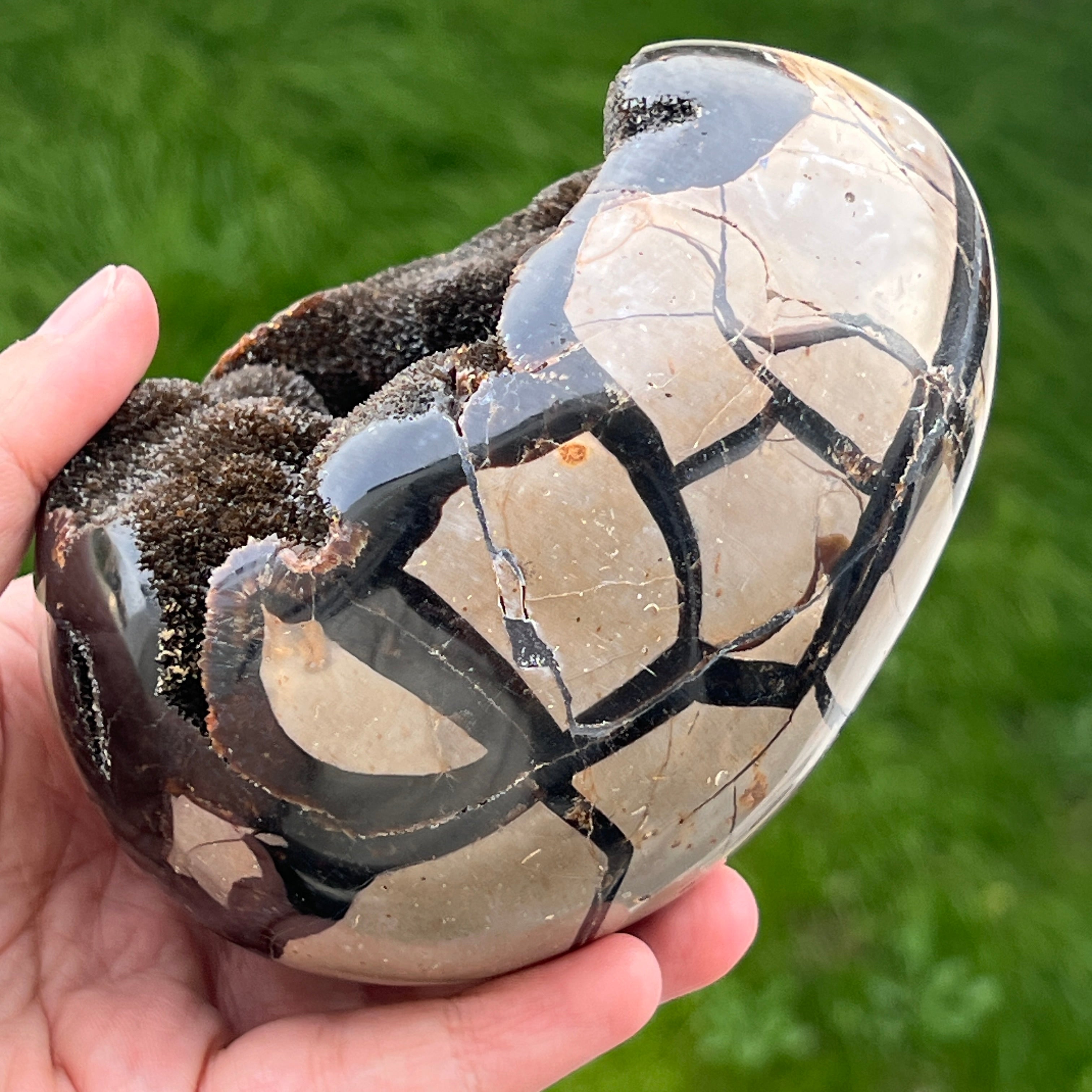 Septaria е изработена от калцит, лимонит, гипс и барит, минерали, които образуват уникална игра в този камък и му придават специален вид.