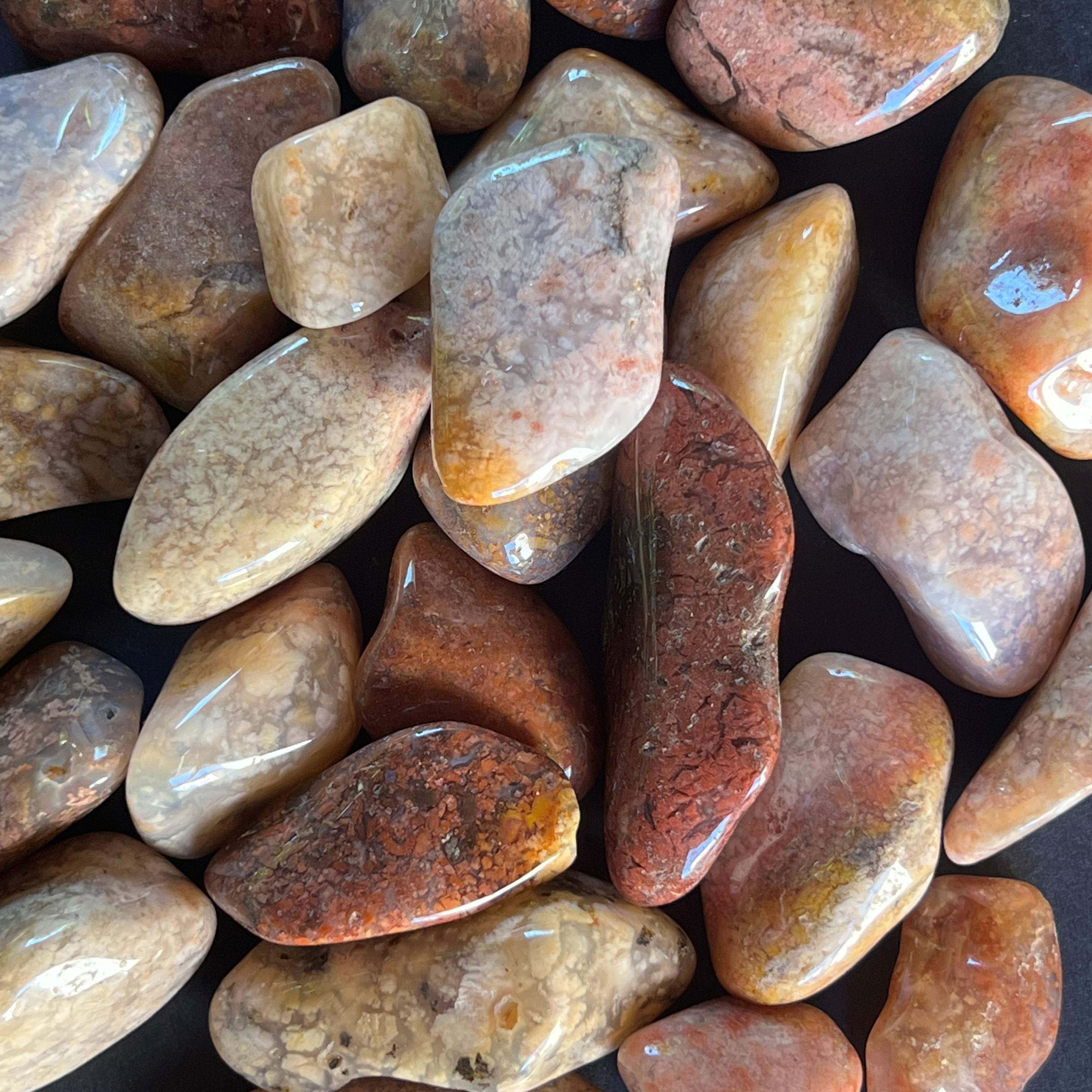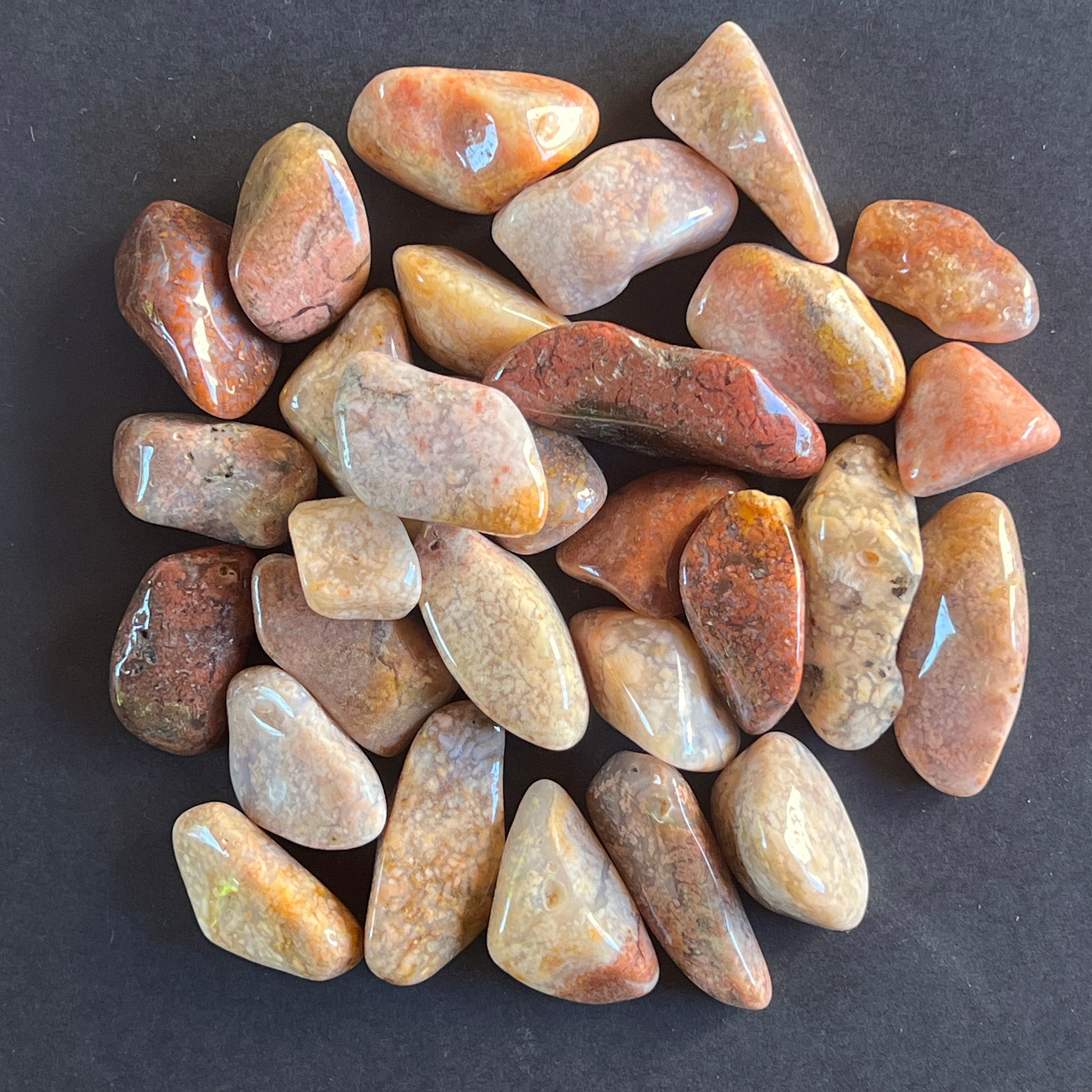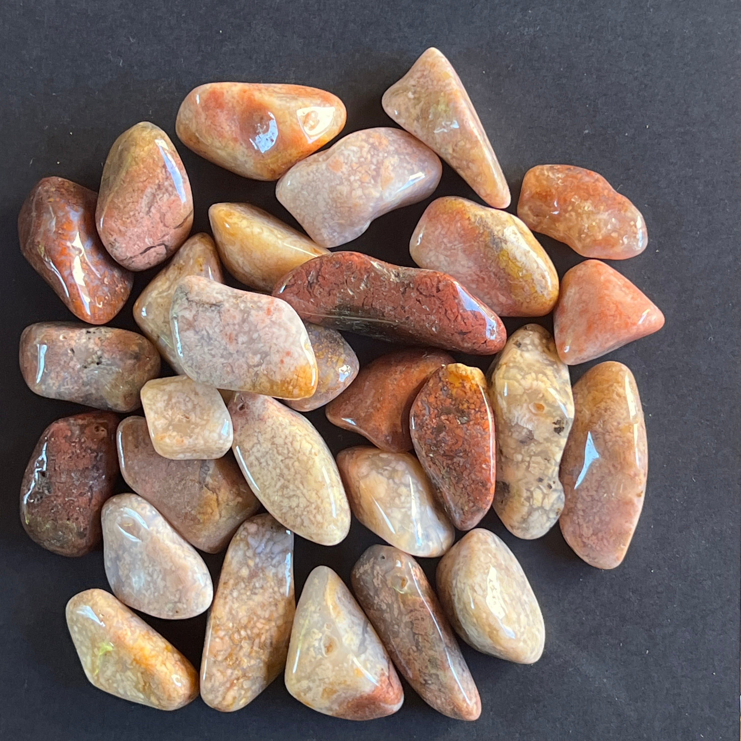 Обработените камъни от розово-кремовия брекчиев яспис разкриват деликатна красота с топли тонове на прасковено розово и кремаво, поръсени с фини жилки в сиво или кафяво. Всеки камък е уникален и носи естествен мотив, напомнящ на пейзажи, рисувани от самата природа.