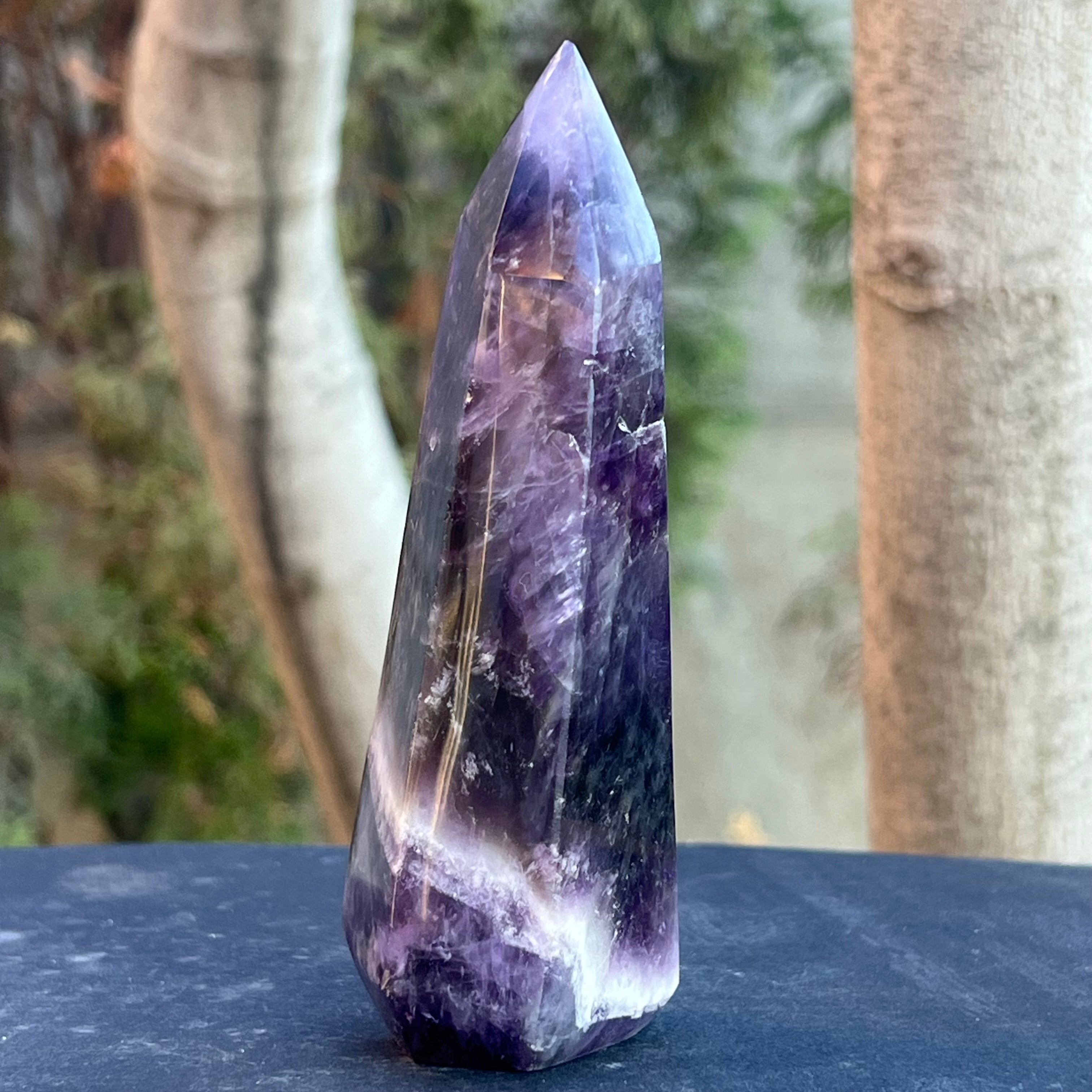 Chevron аметистът е известен с асоциациите си с коронната и третата око чакра, като увеличава интуицията и способността за вземане на решения.