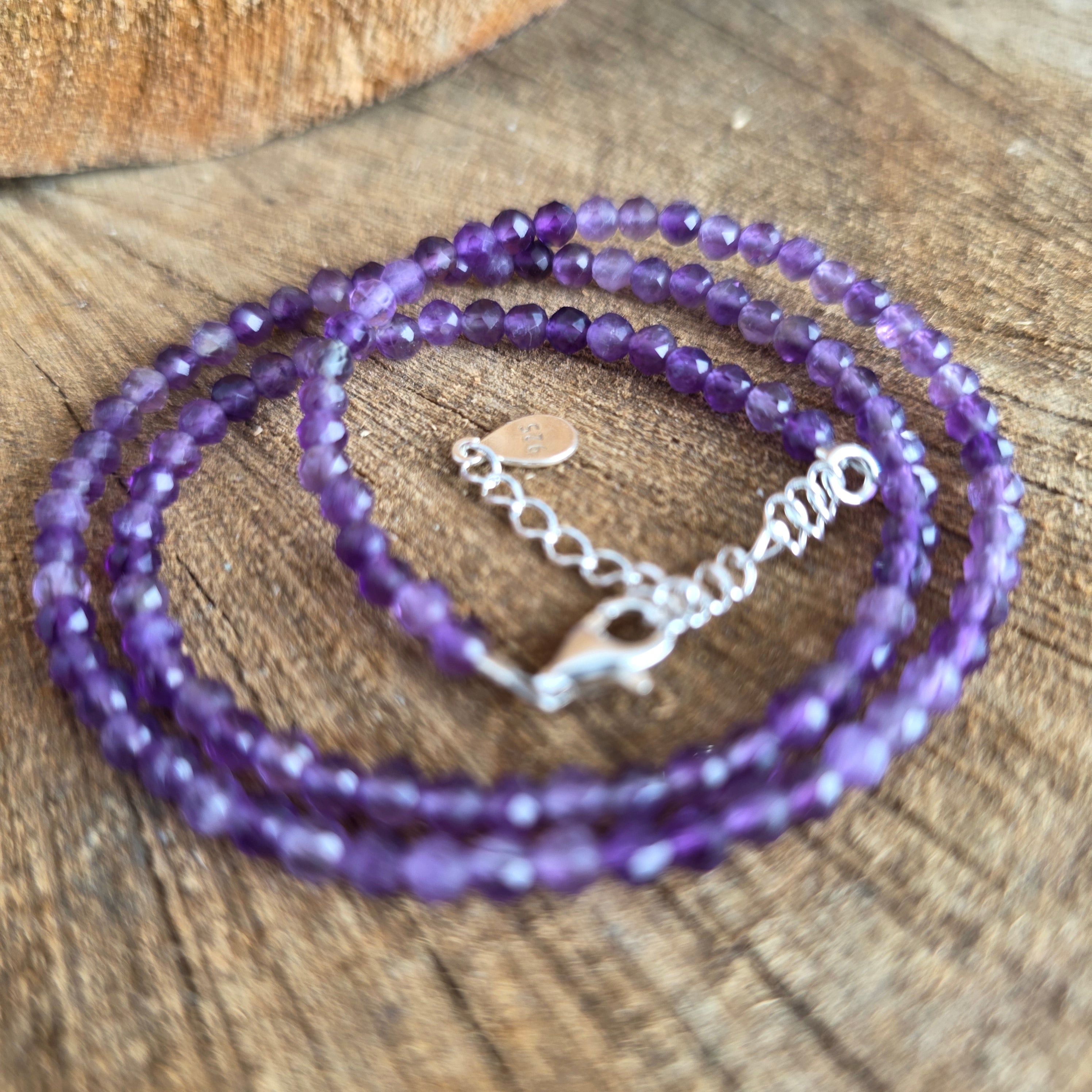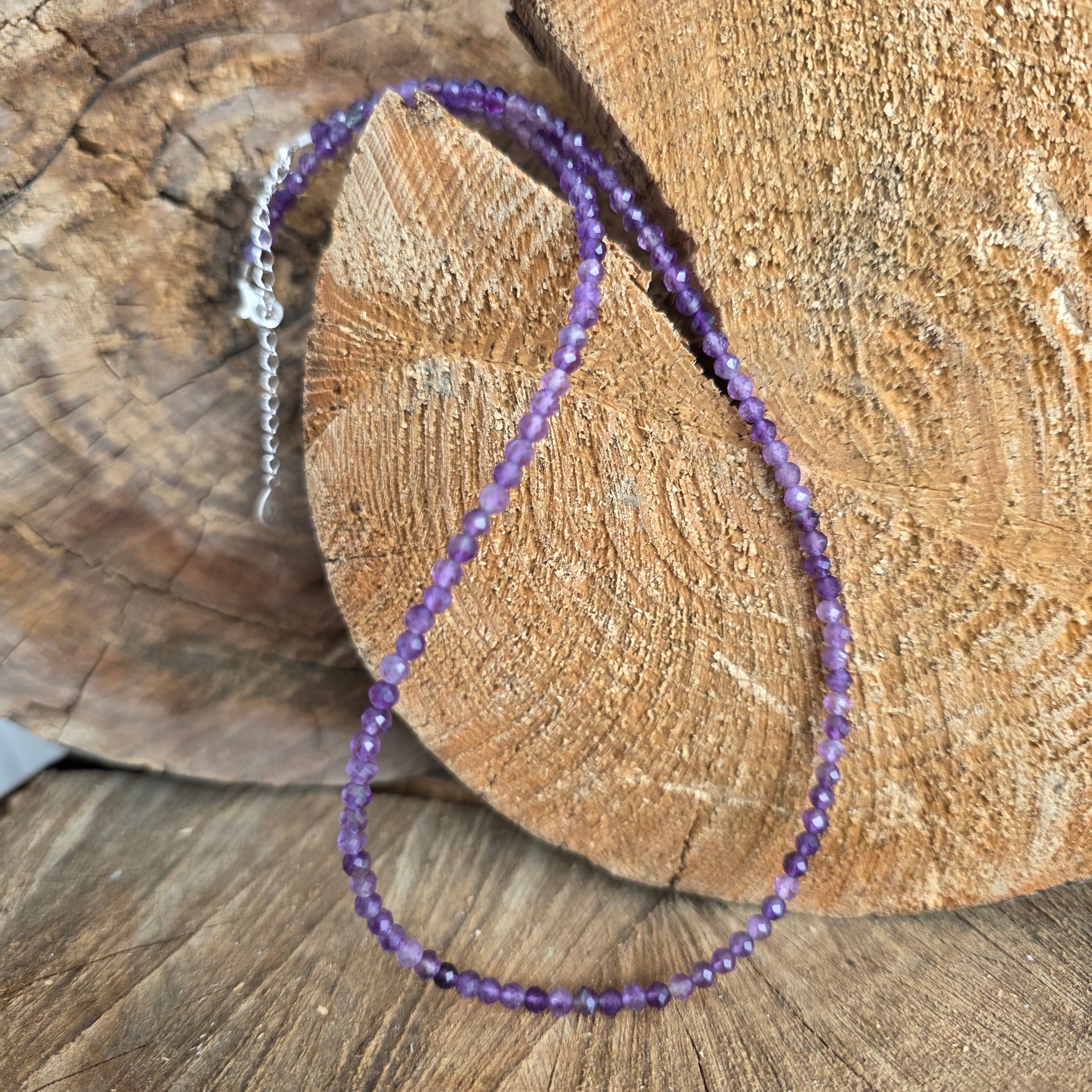 Un colier ce aduce cu sine delicatețea și noblețea subtilă a visului, ca o șoaptă de violet păstrată pe piele. Mărgelele de ametist natural de 6 mm, atent fațetate, strălucesc discret, reflectând lumina într-un ritm lin și grațios.