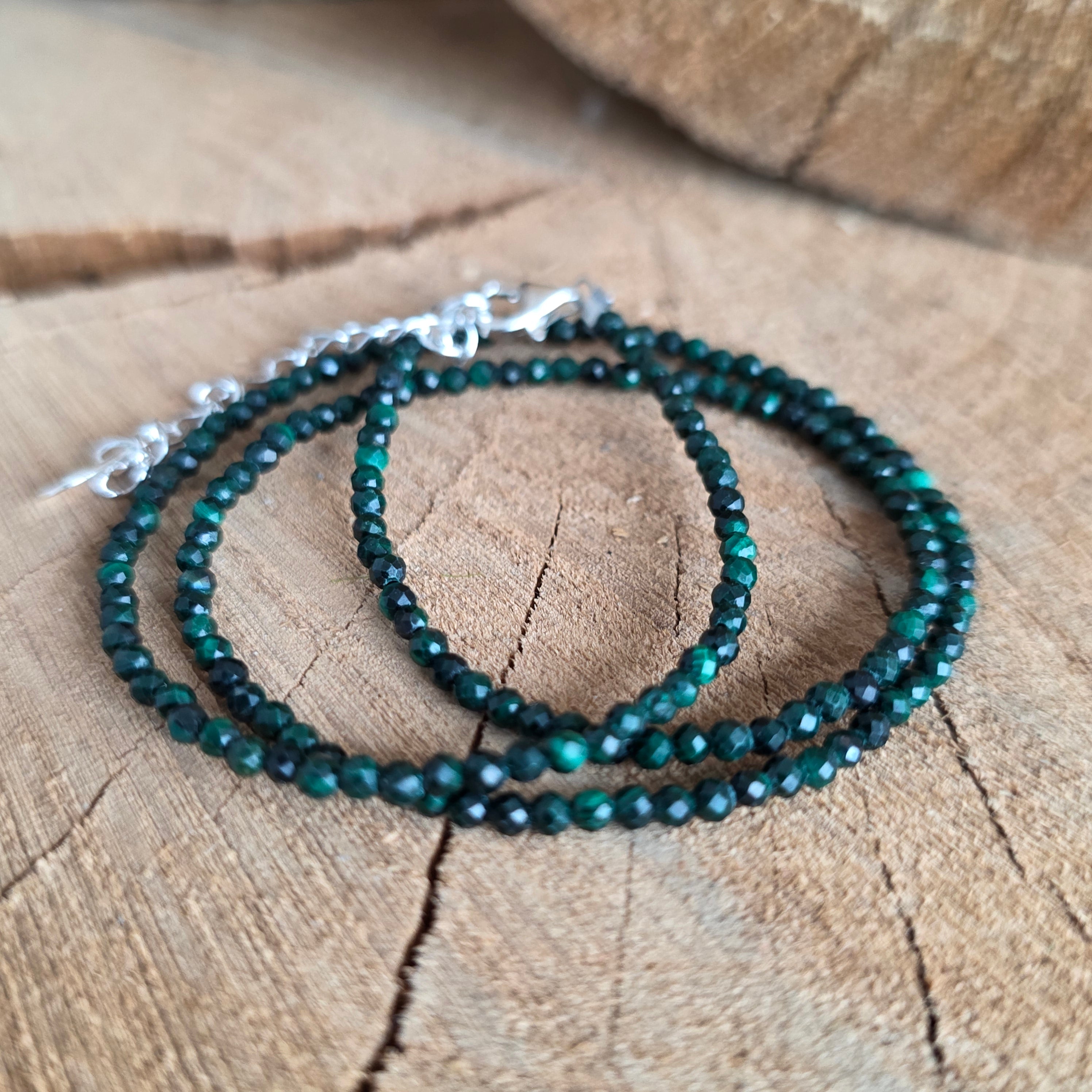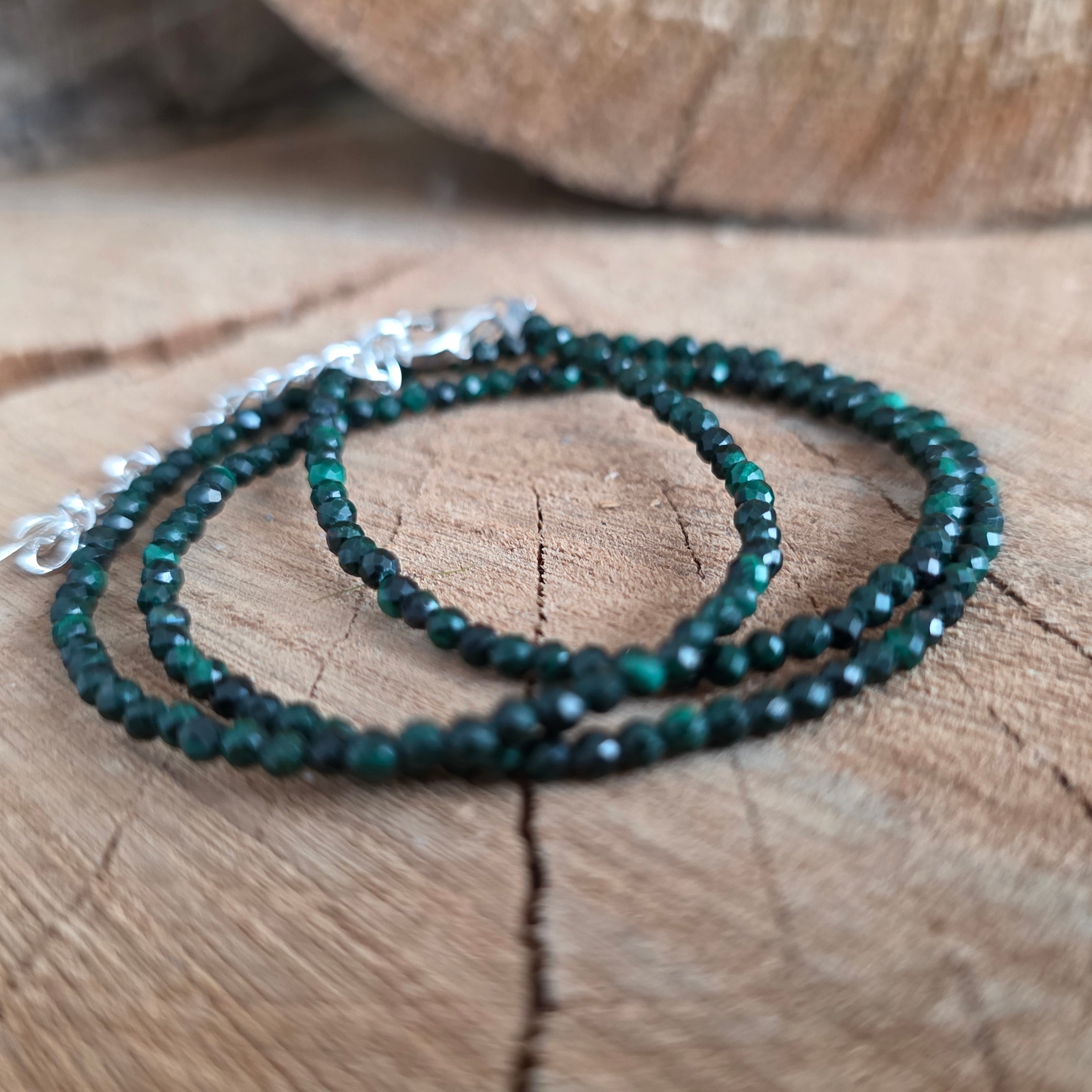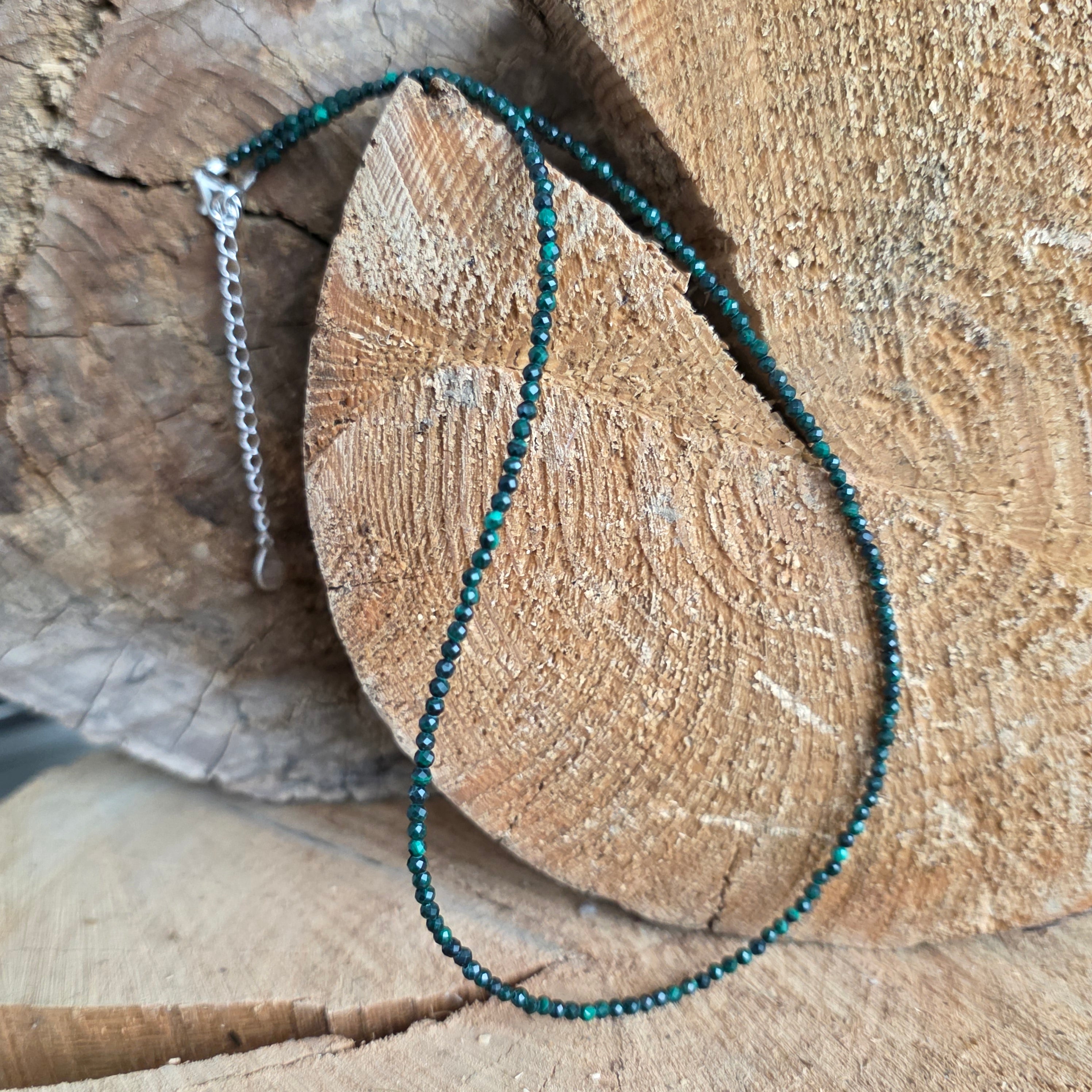 Огърлица, която носи дълбоката песен на земята, ехо от сила и регенерация. Малахитът, със своите наситени зелени нюанси и преливащи се ивици, е жив камък - израз на трансформация, защита и вътрешно прераждане. Всяко мънисто от 6 mm е свят сам по себе си, танц между изумрудена светлина и горска сянка.