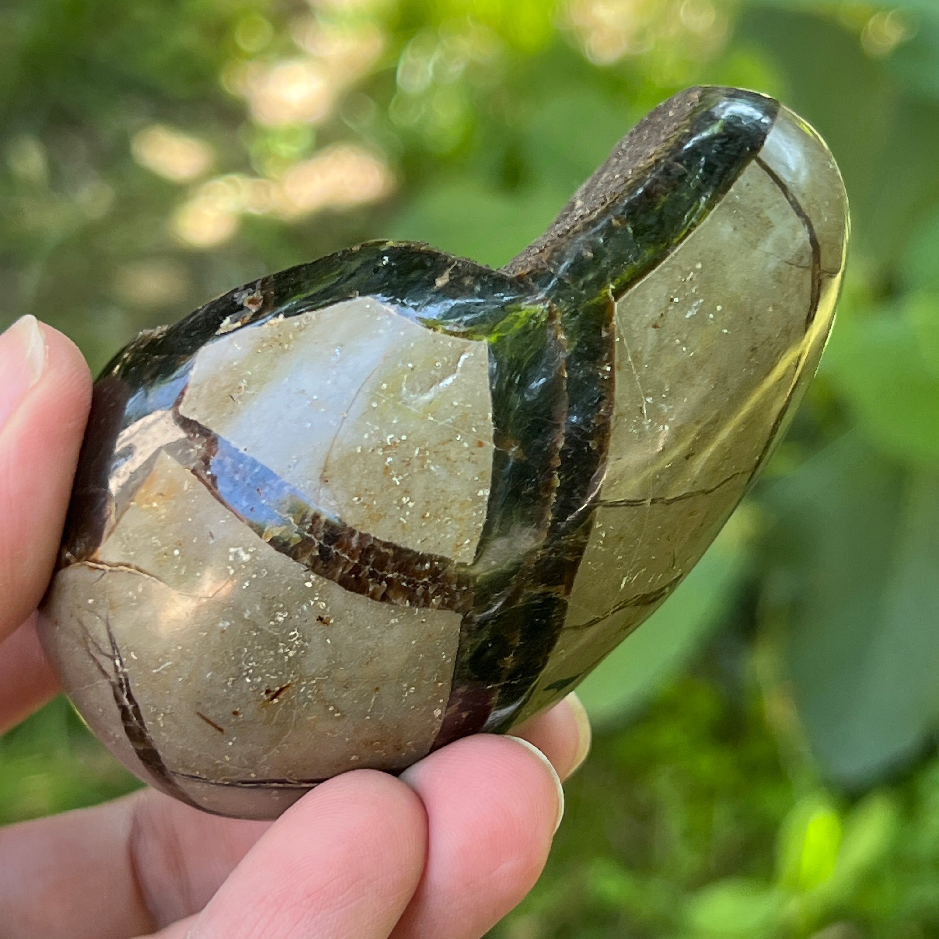Септарията се състои от калцит, лимонит, гипс и барит – минерали, които образуват уникална игра в този камък и му придават специален вид.