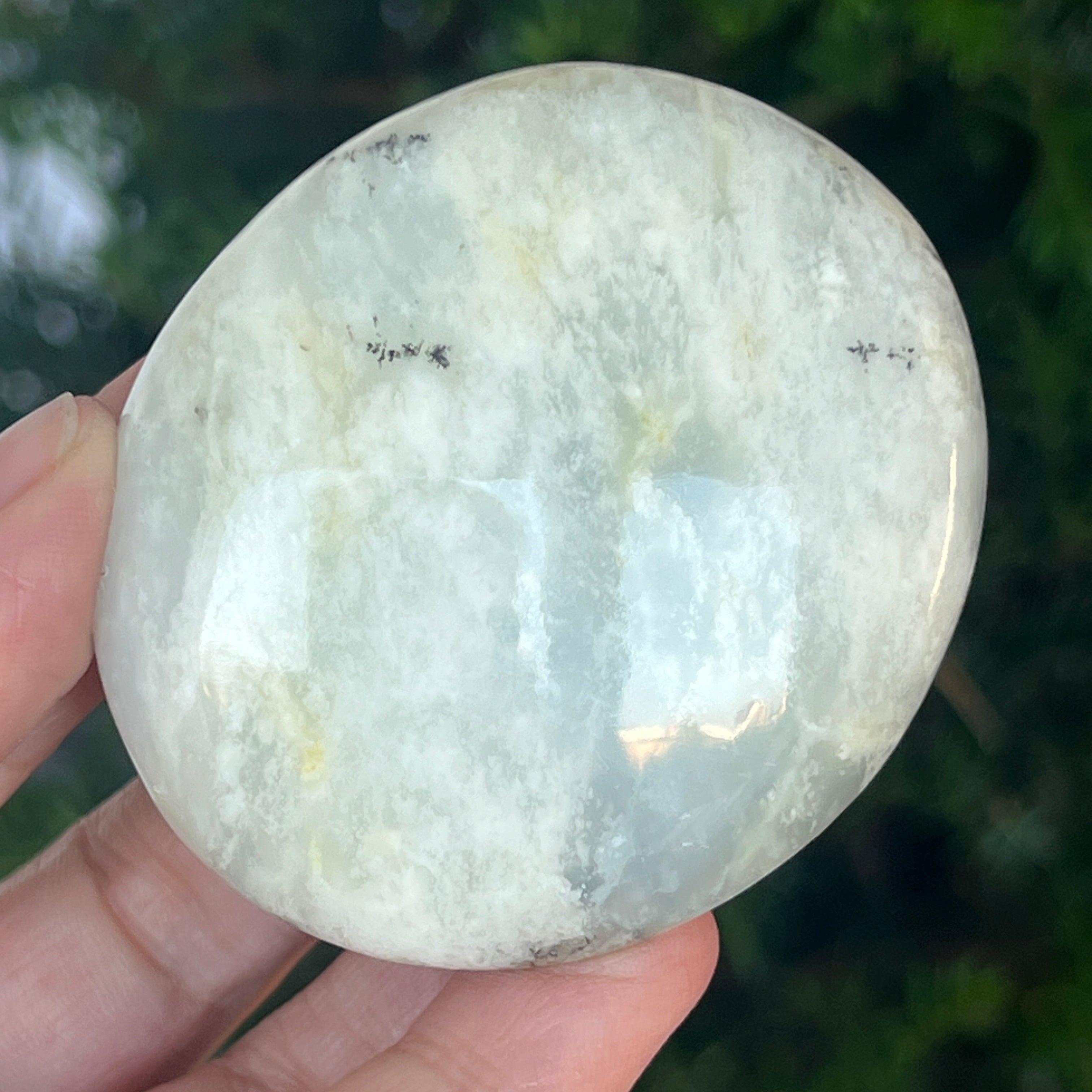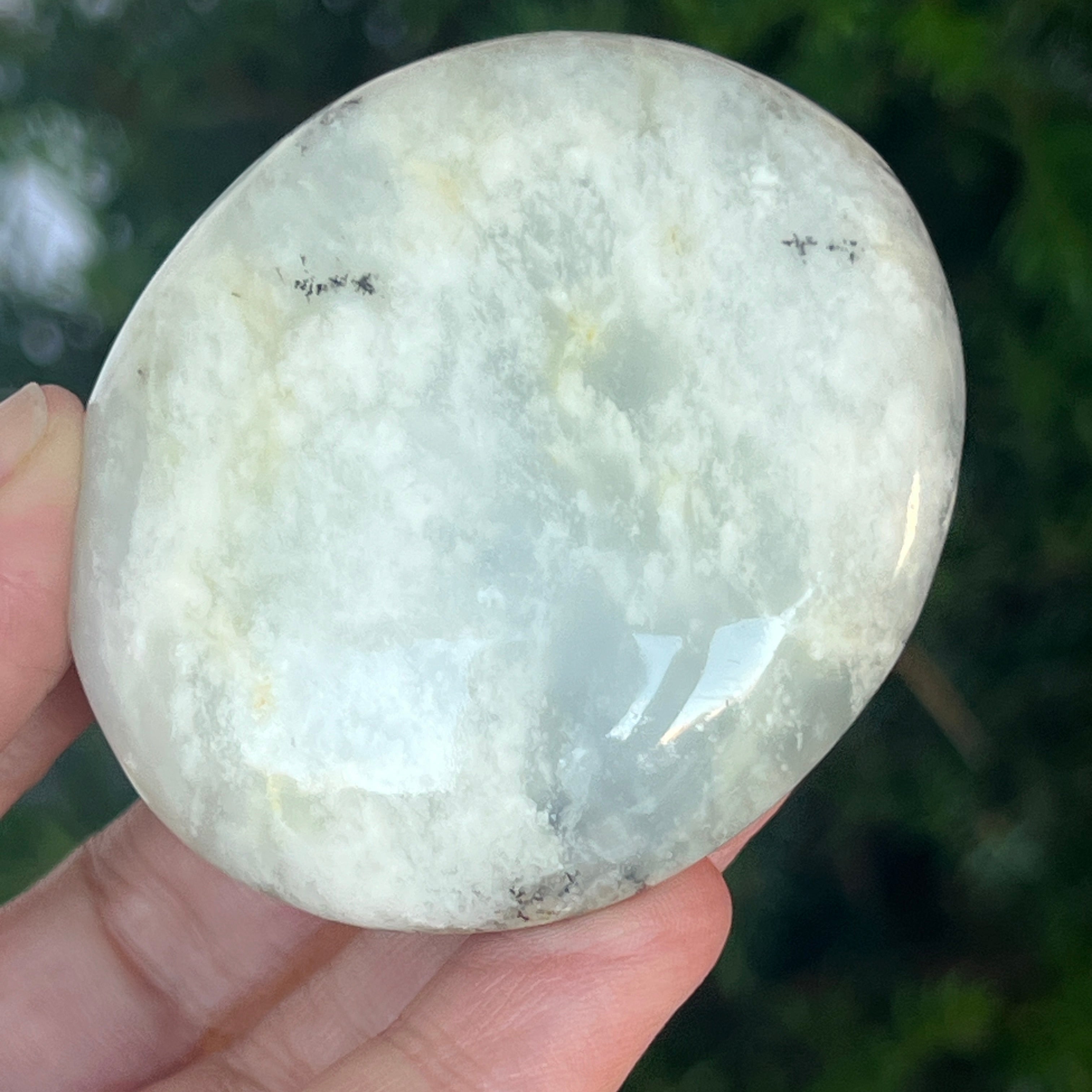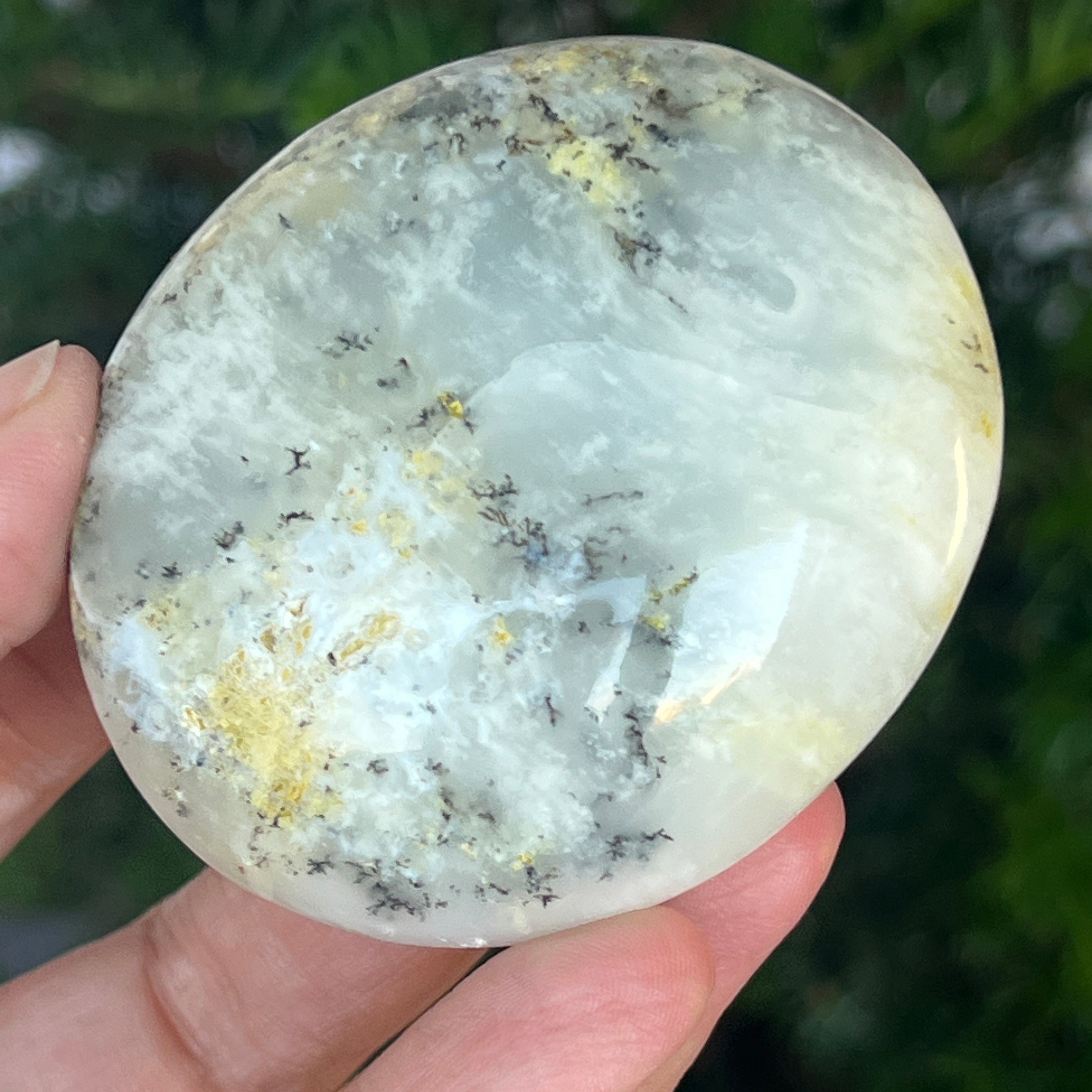 Този palmstone от бял дендритен опал носи усещане за мир и леко разширение на съзнанието. Идеален за медитация, за моменти на размисъл или за съхранение като декоративен елемент в сакрално пространство, той излъчва чиста и органична красота, баланс между бялата светлина и фините сенки на природата.