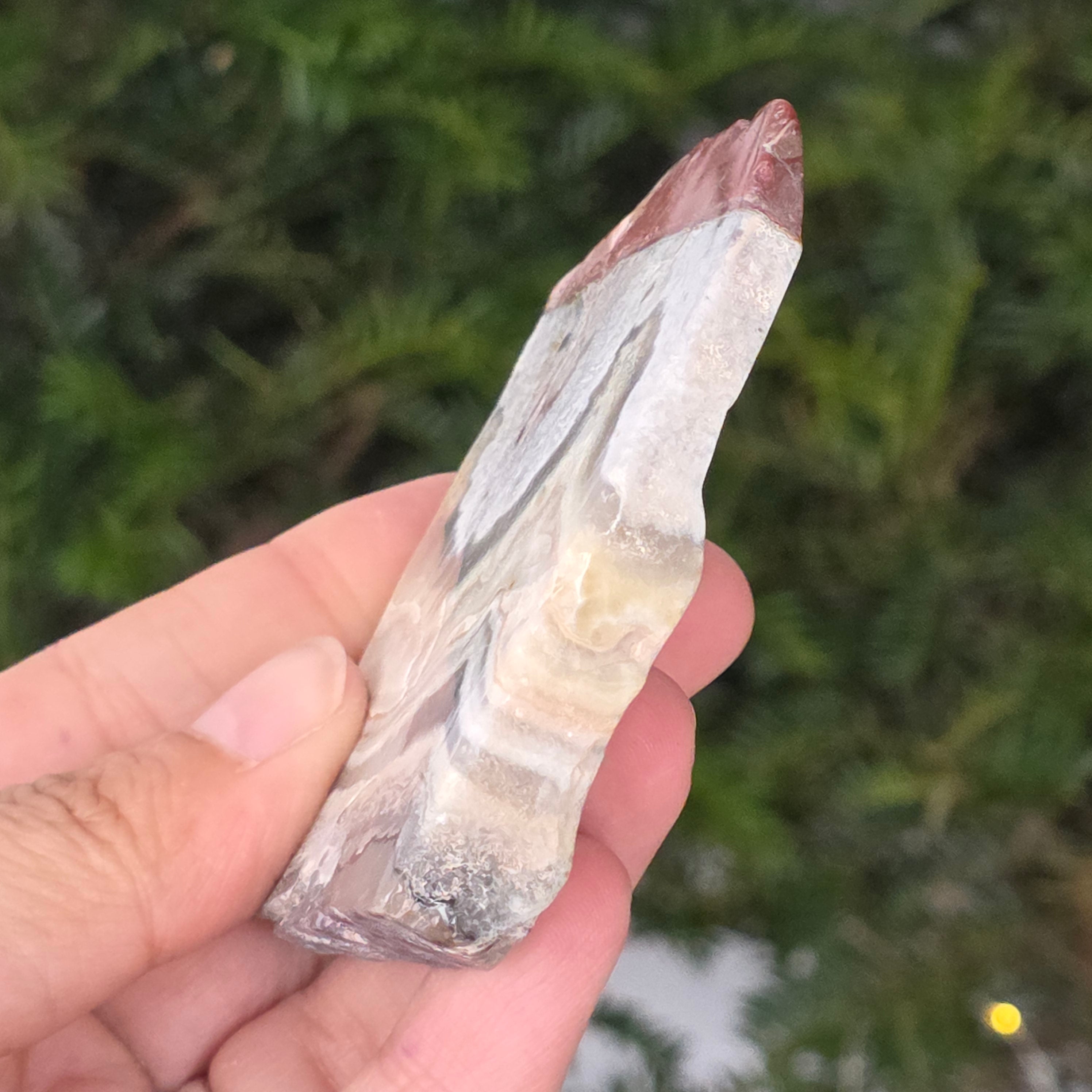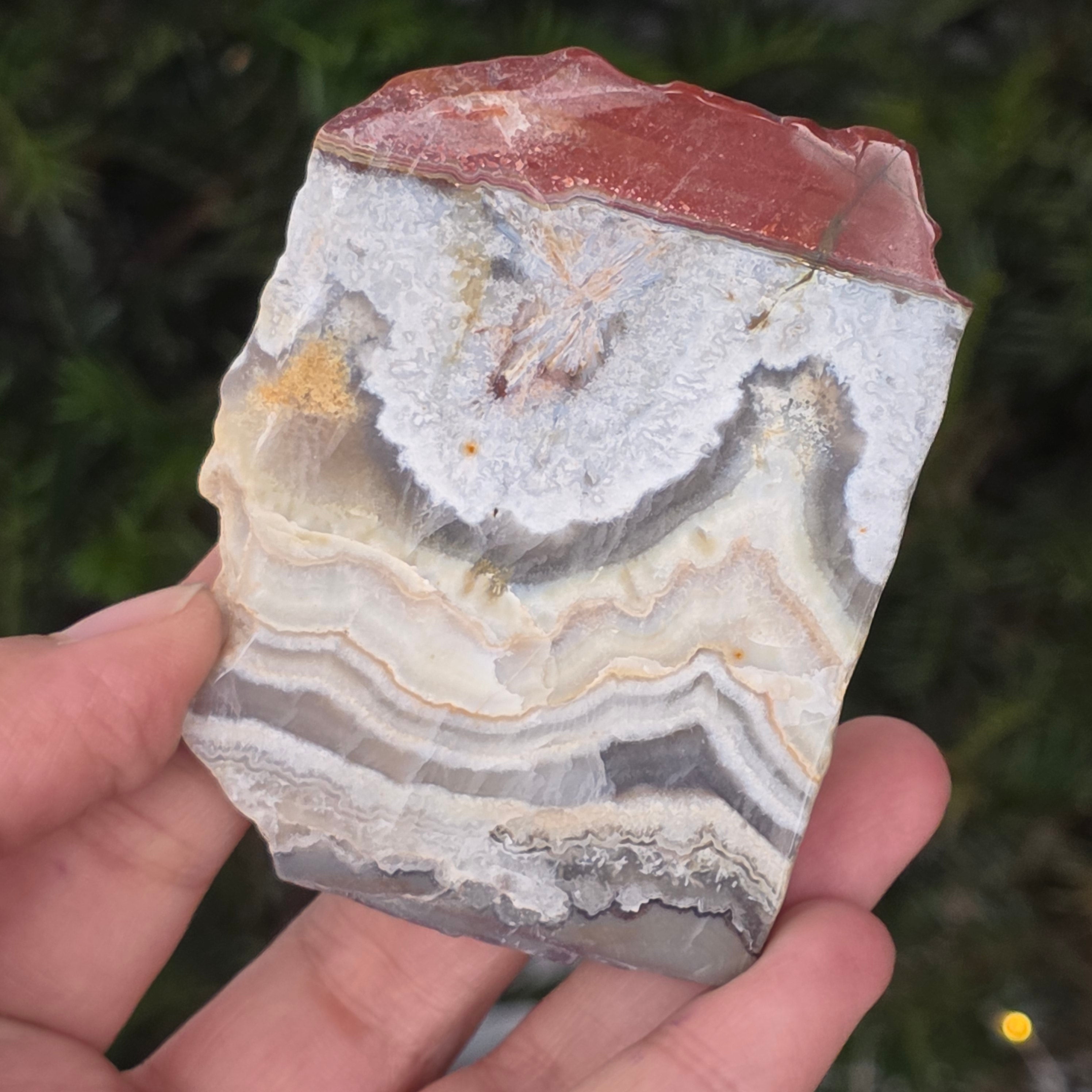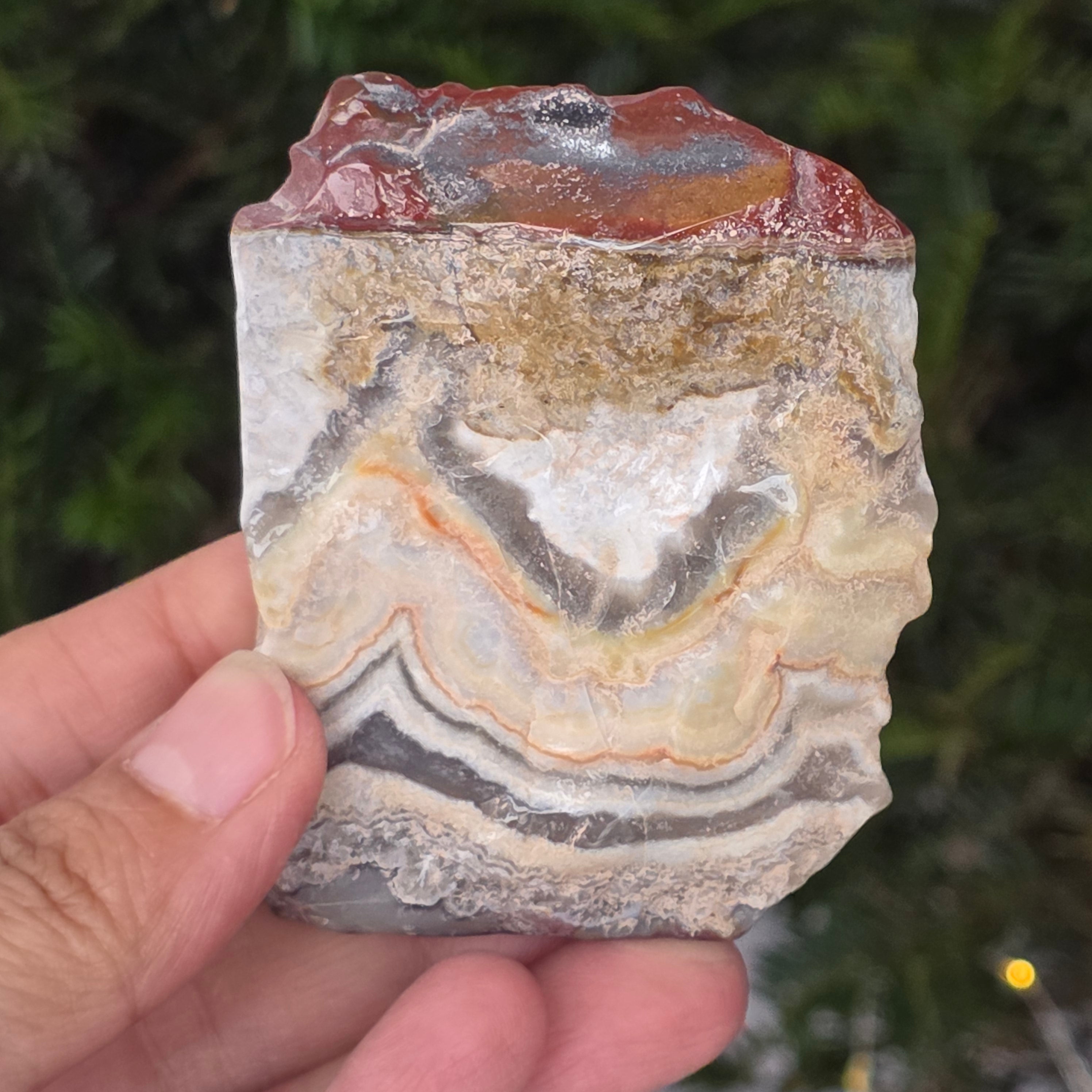 Agatul Crazy din Mexic este una dintre cele mai vibrante și spectaculoase varietăți de agat, celebru pentru liniile sale ondulate și jocurile nebunești de culori ce par desenate de o mână liberă, fără reguli. În această felie naturală, mică dar extrem de expresivă, se dezvăluie întreaga poveste a pietrei: straturi pământii, nuanțe calde de caramel, roșu aprins, portocaliu, gri și crem, amestecate în modele spiralate care par să pulseze cu viață.