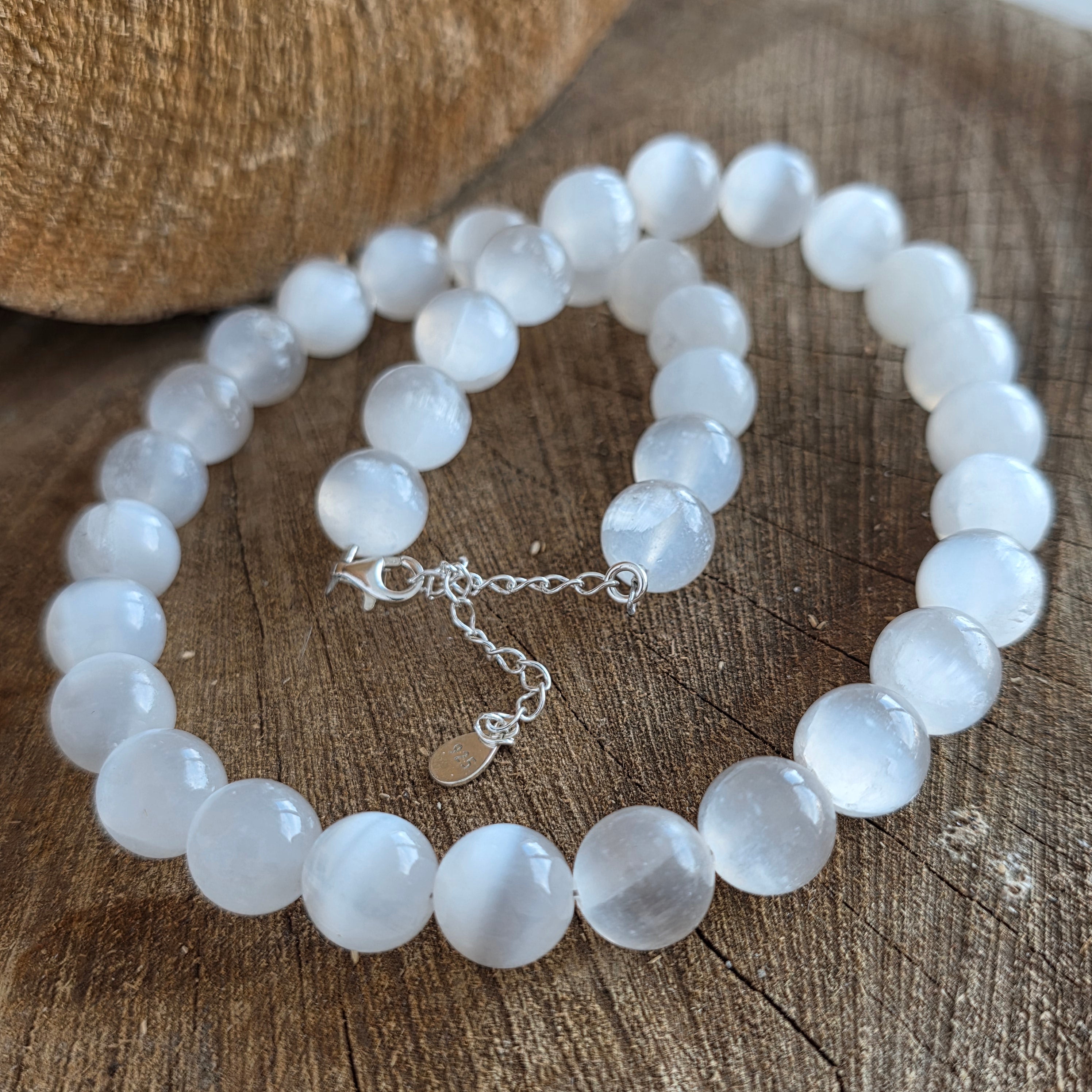 Колие като лъч, спуснал се в материята – съставено от перфектно сферични топчета от естествен селенит, по 10 мм, всяко носещо в себе си чистотата на бяла и тиха сутрин. Мекият и полупрозрачен повърхностен слой отразява светлината с почти нереална нежност, сякаш диша спокойствие.