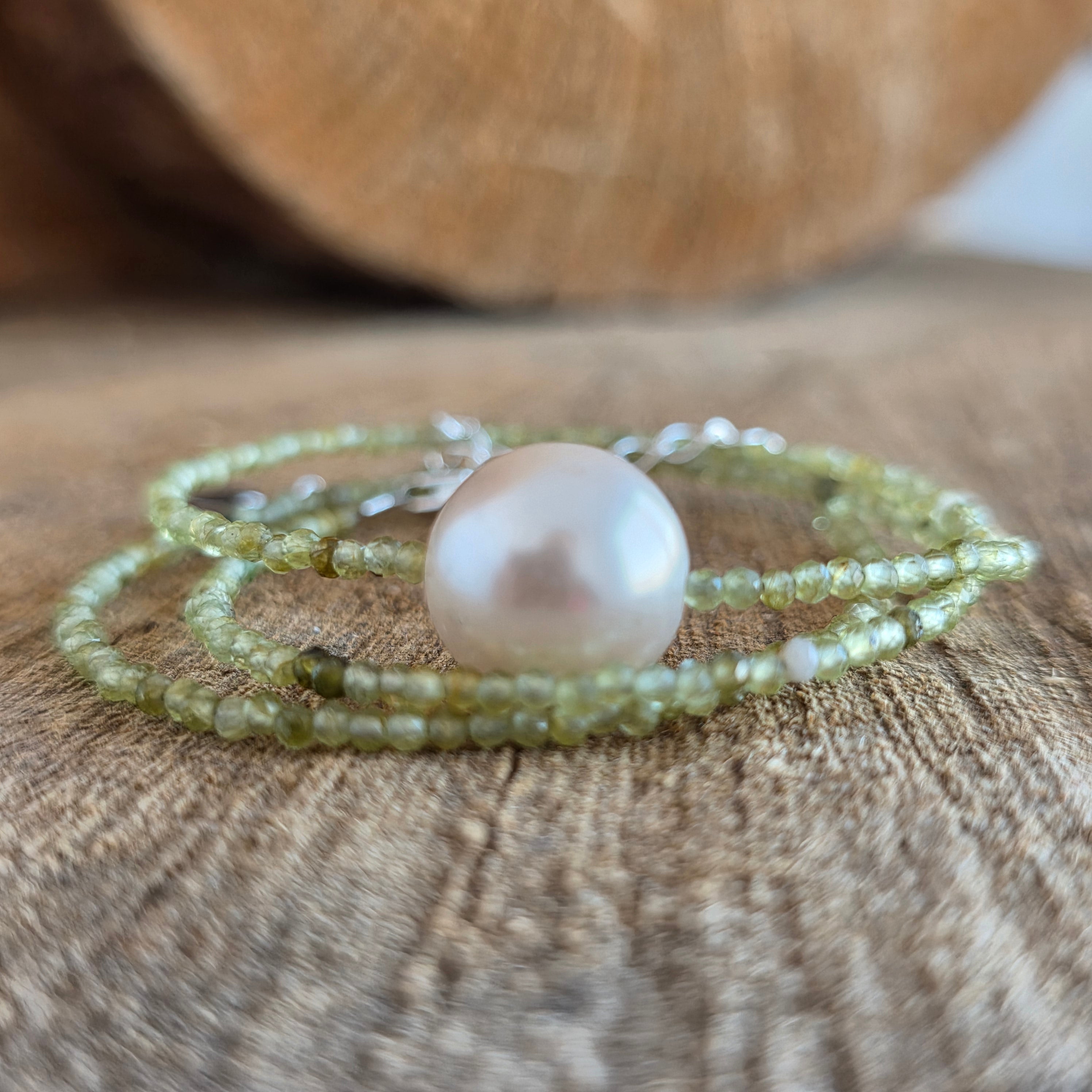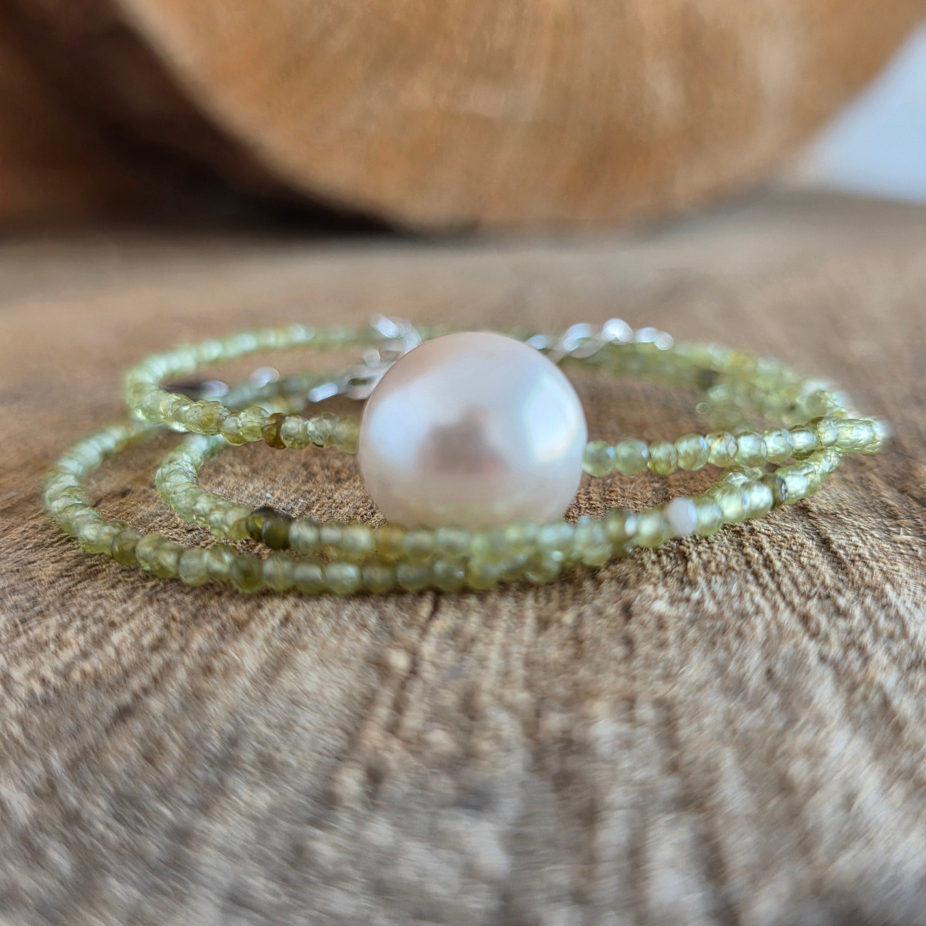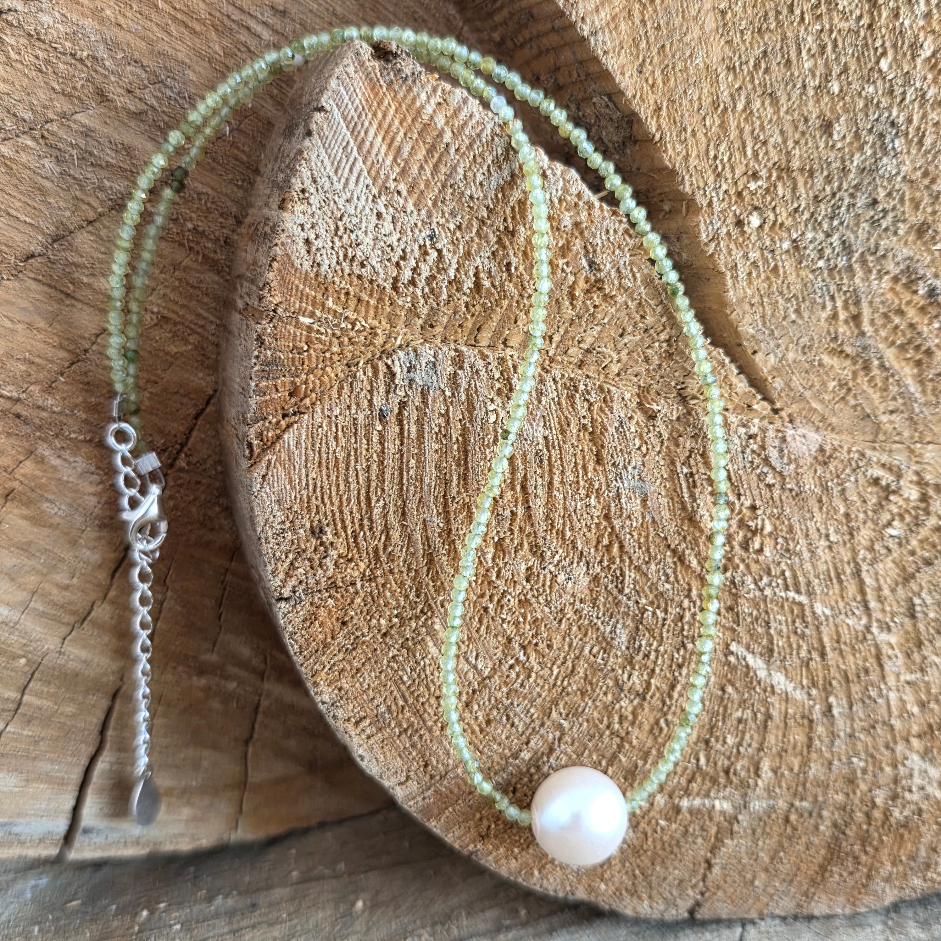 Un colier luminos și proaspăt, realizat din sfere de peridot de 2 mm, atent selecționate cu o culoare verde intensă și clară, care pare să pulseze de viață. Fiecare sferă reflectă lumina cu o transparență caldă, evocând ideea de început nou, de respirație adâncă după o etapă încheiată. Designul este curat și echilibrat, lăsând piatra să fie centrul expresiei.